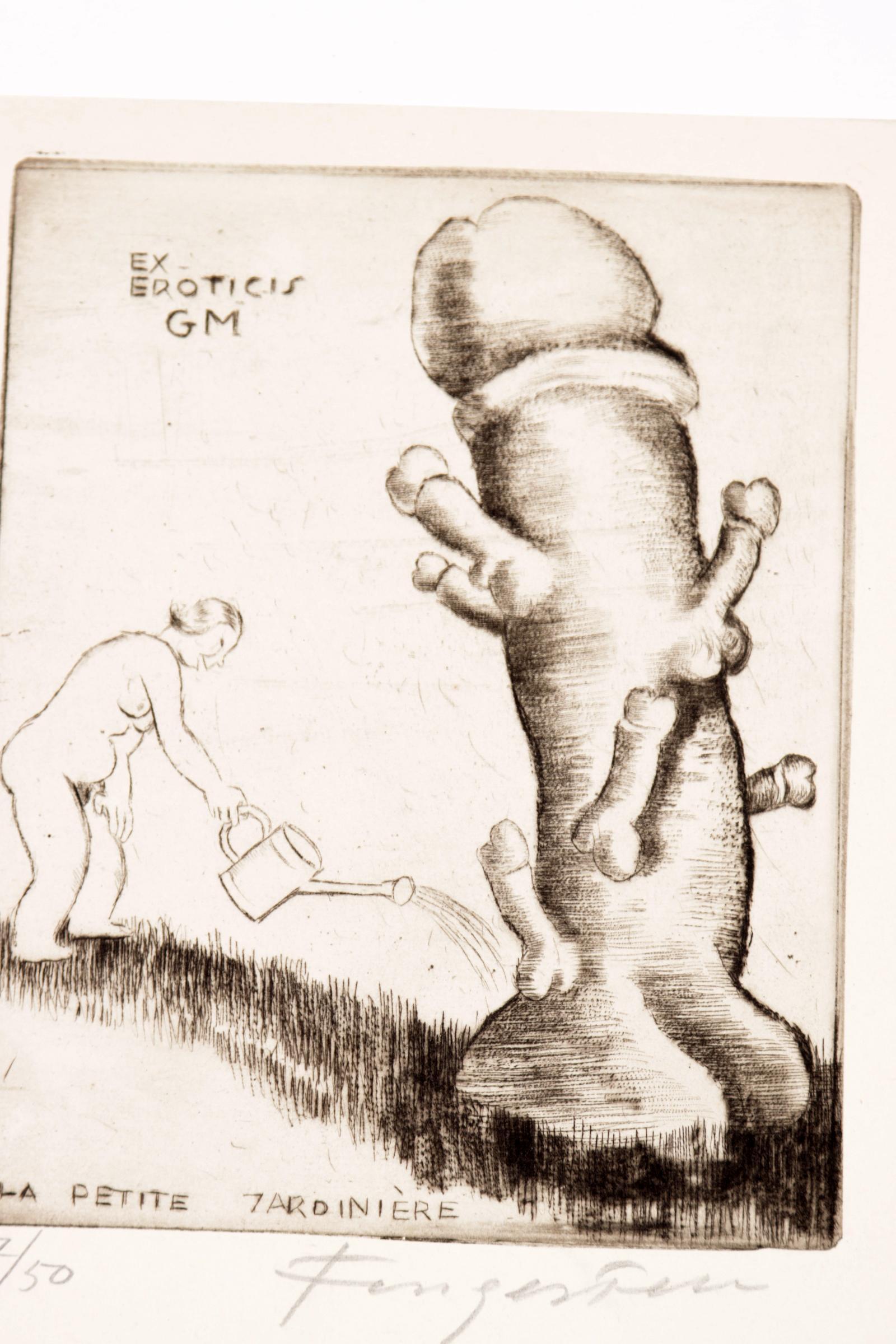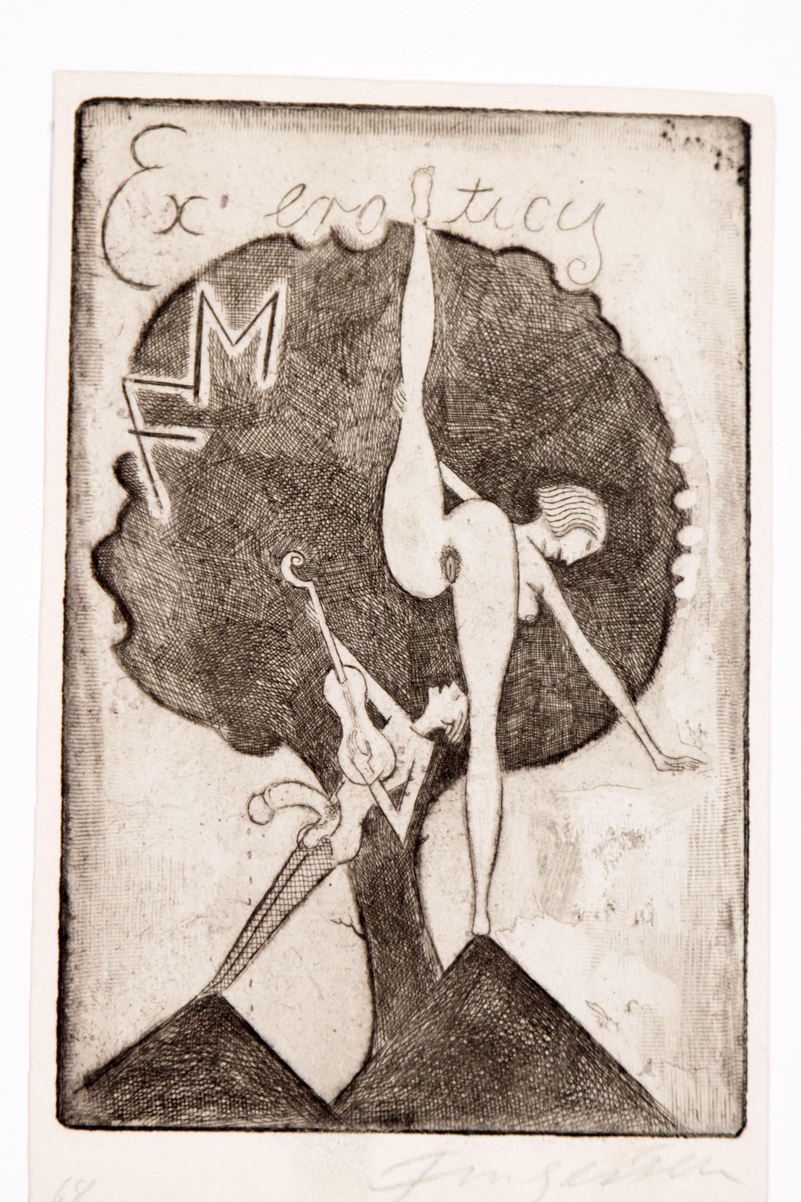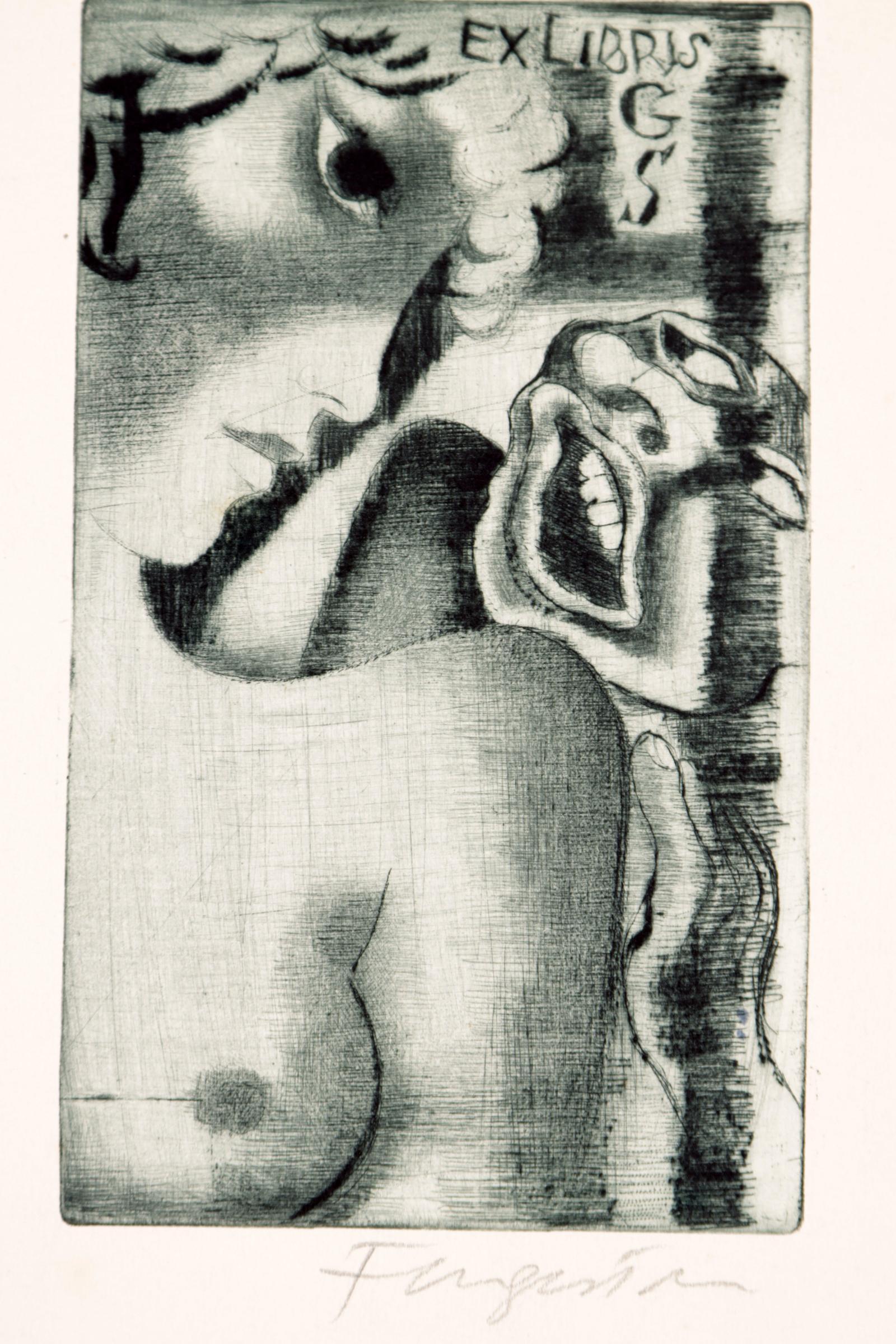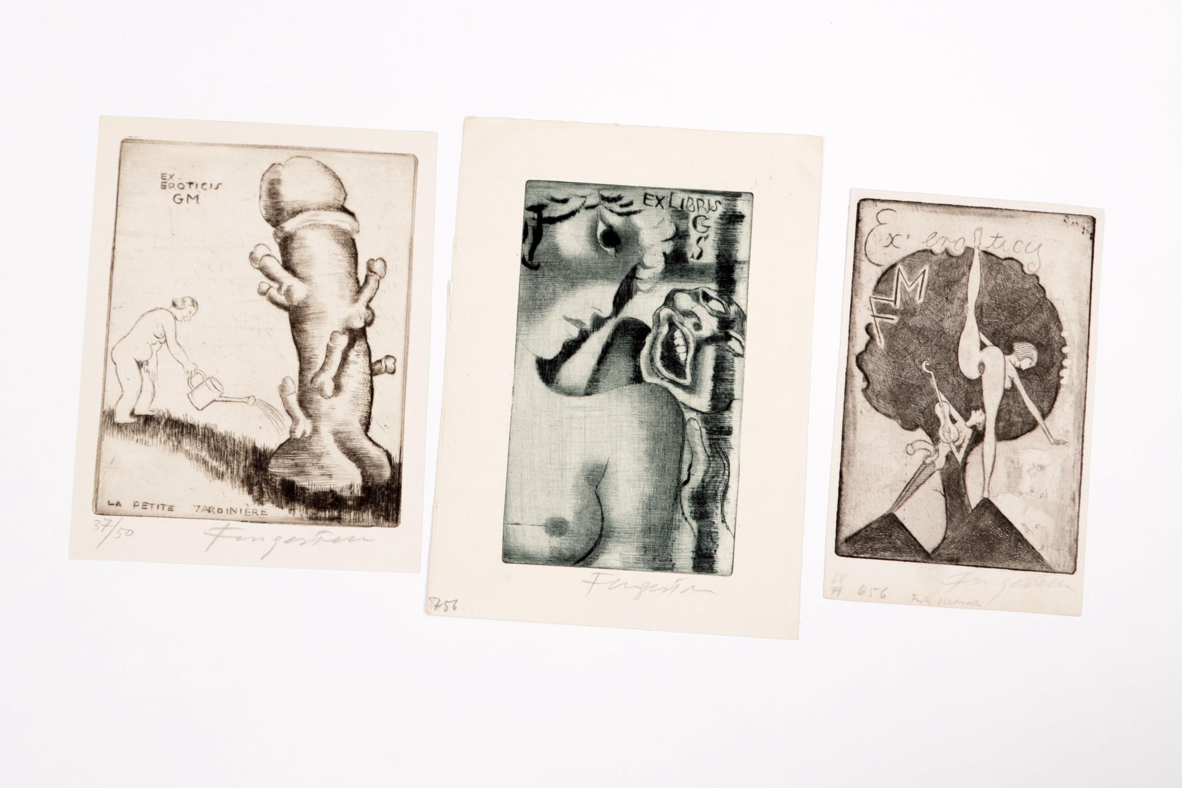 Fingesten, M, 3 exlibris (G.M, F.M., G.S., erotisch ), C3, gesigneerd, opgeplakt (geweest)