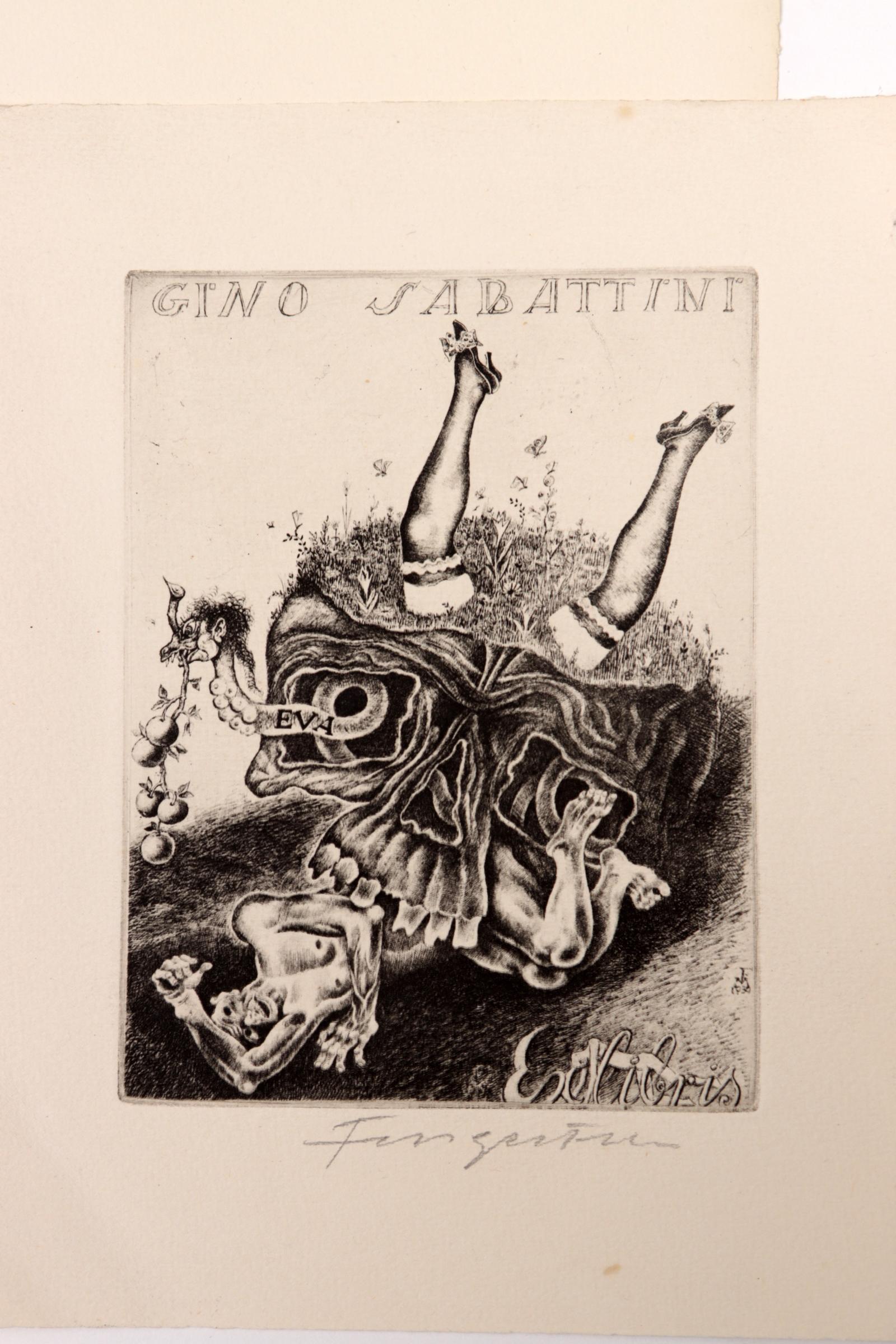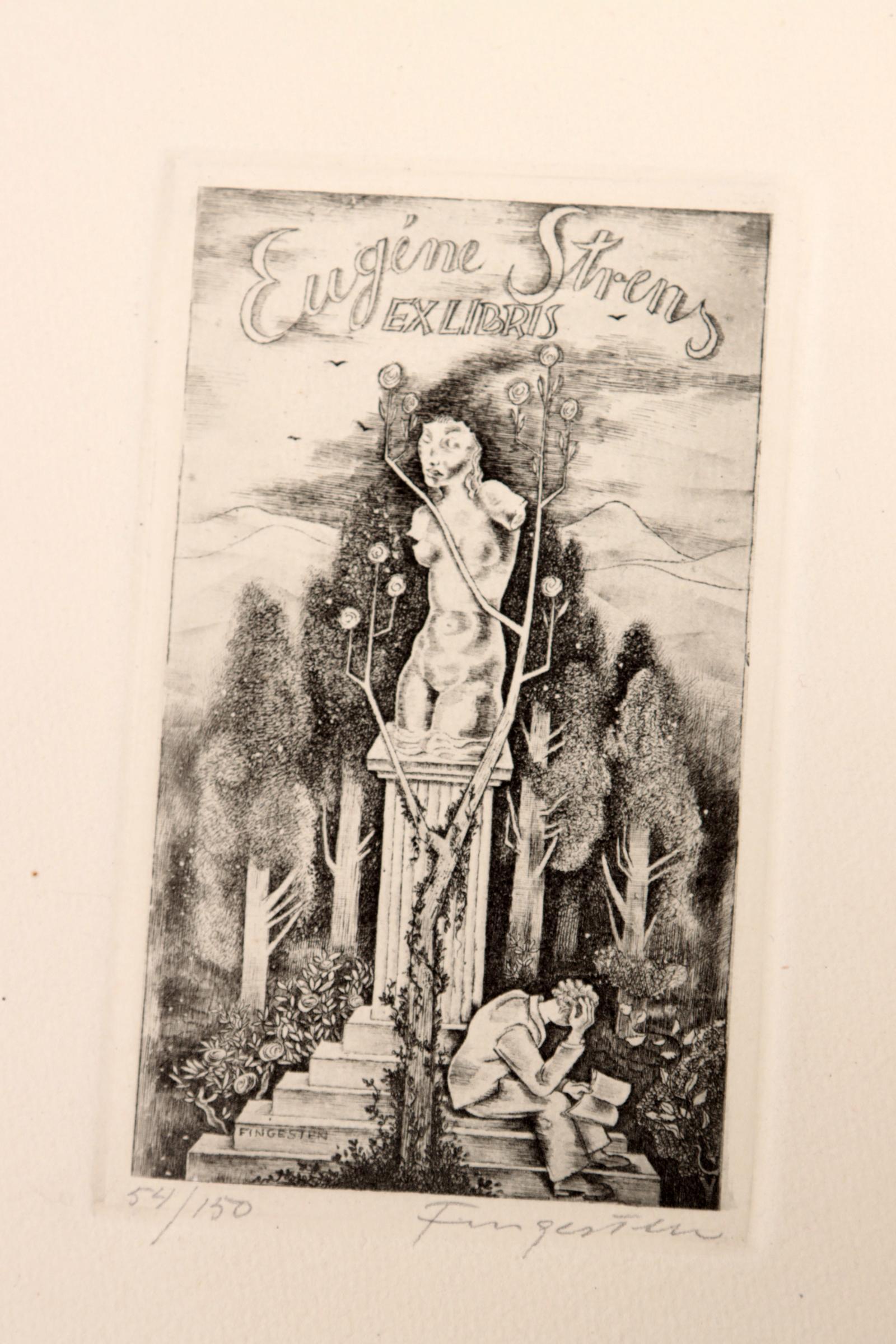 Fingesten, M, 3 exlibris (Gino Sabattini, G.M. (papier iets beschadigd), Eugene Strens), C3, gesigneerd, opgeplakt (geweest)