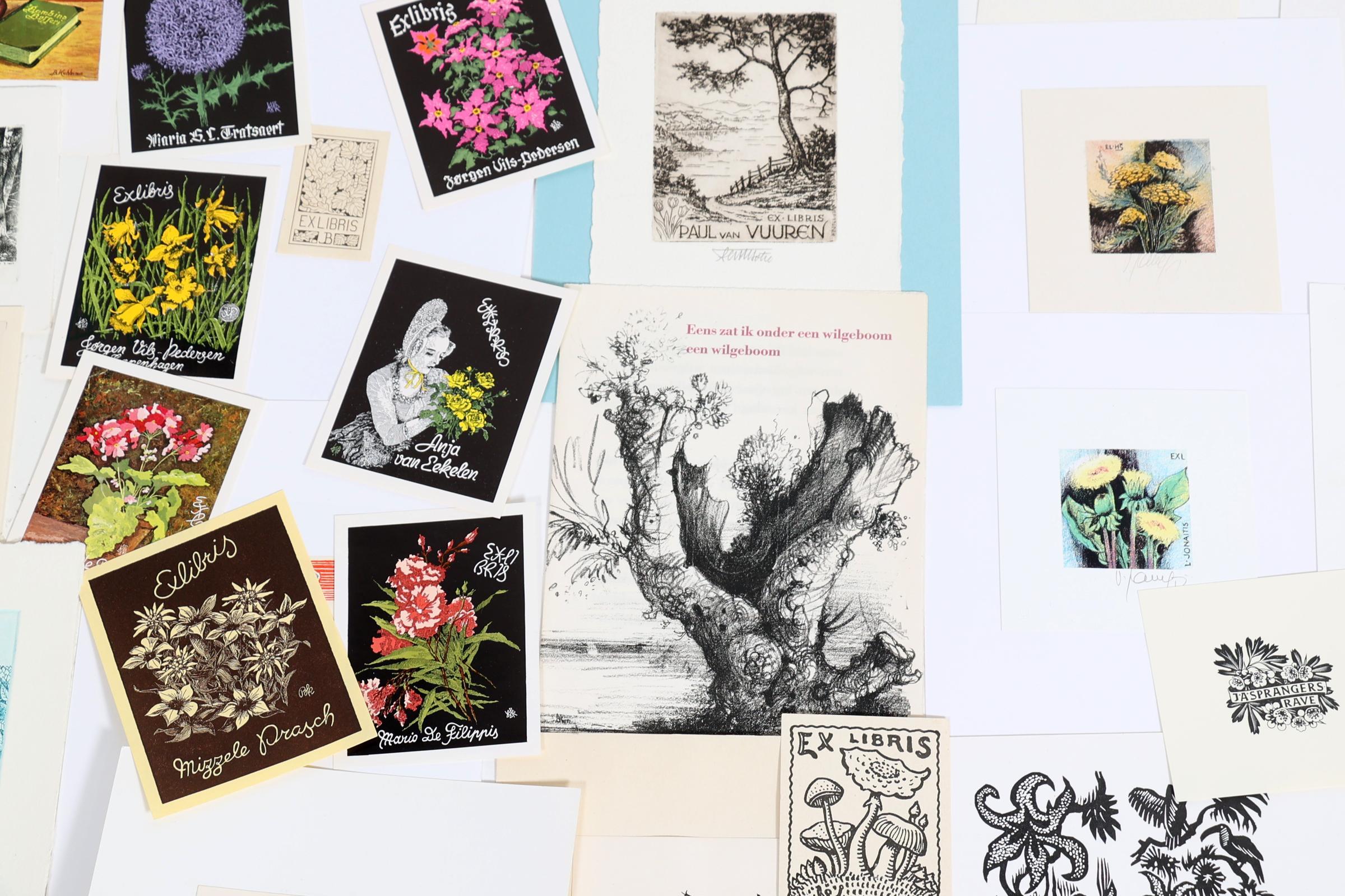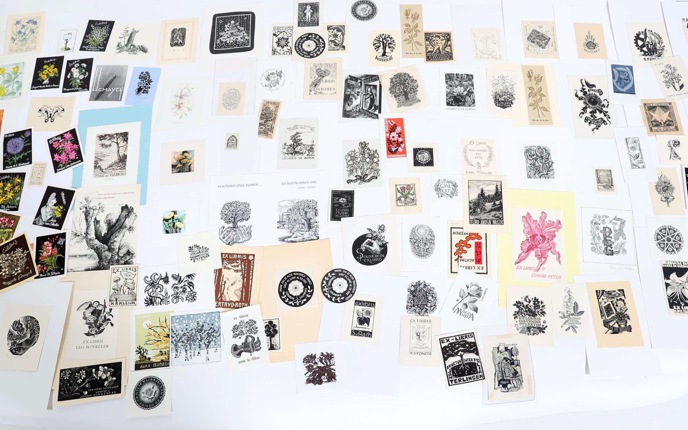 collectie van plm. 125 exlibris / kleingrafiek, thema: bomen en bloemen. Voornamelijk hoogdruk / vlakdruk. Deels gesigneerd, deels opgeplakt. Gemaakt door o.a. Kuhlmann, Grootaerts, Steenvoorden, Rueter, Bungster, Huffert, Koch, etc.