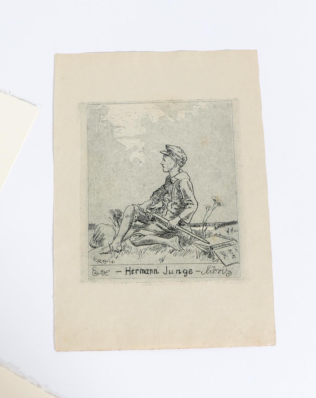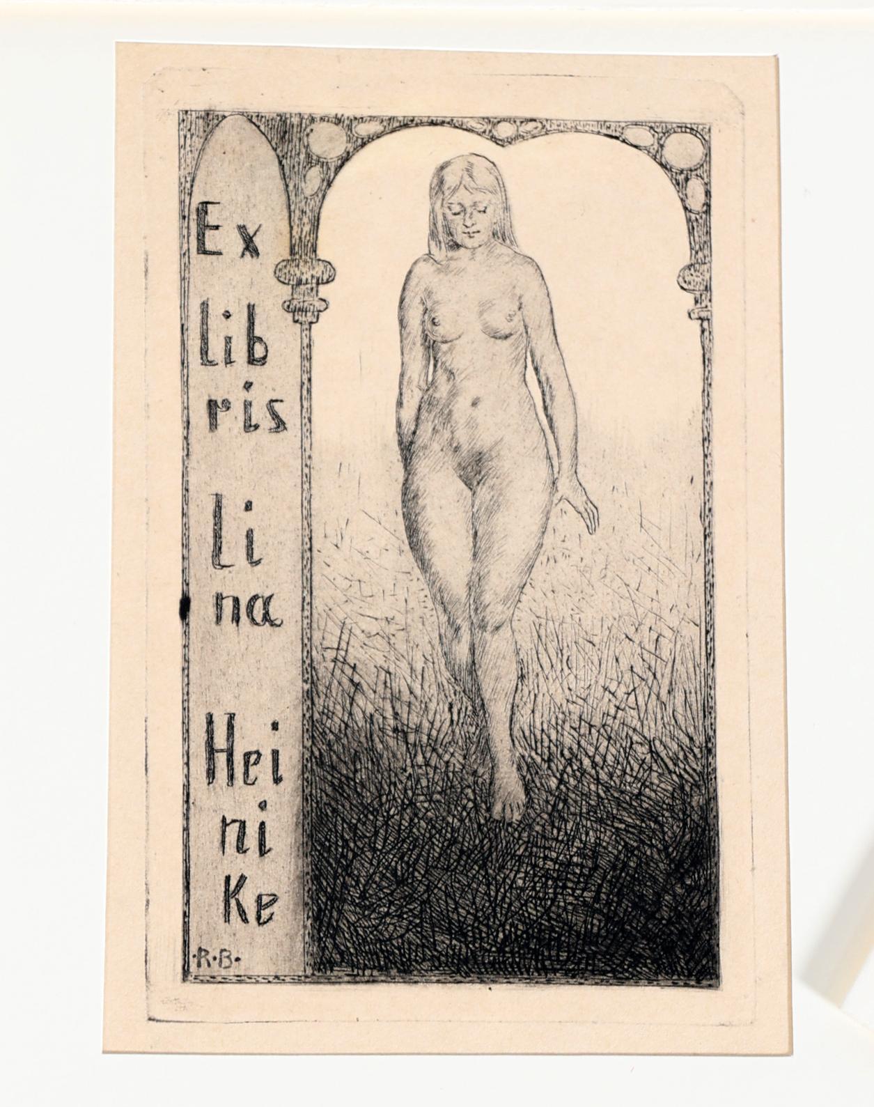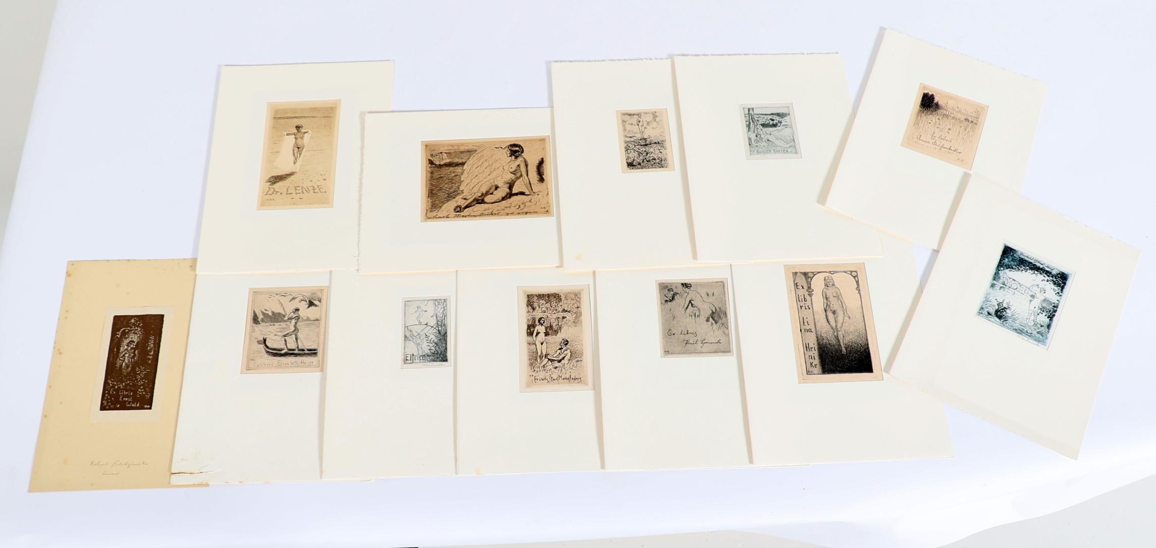Budzinski, R., 13 exlibris (12 x C3, 1 x X3), 2 x gesigneerd, opgeplakt / in passe-partouts. Voor o.a. Hasse, Andres, Elfriede, Heinike, Lenze, Heeren.