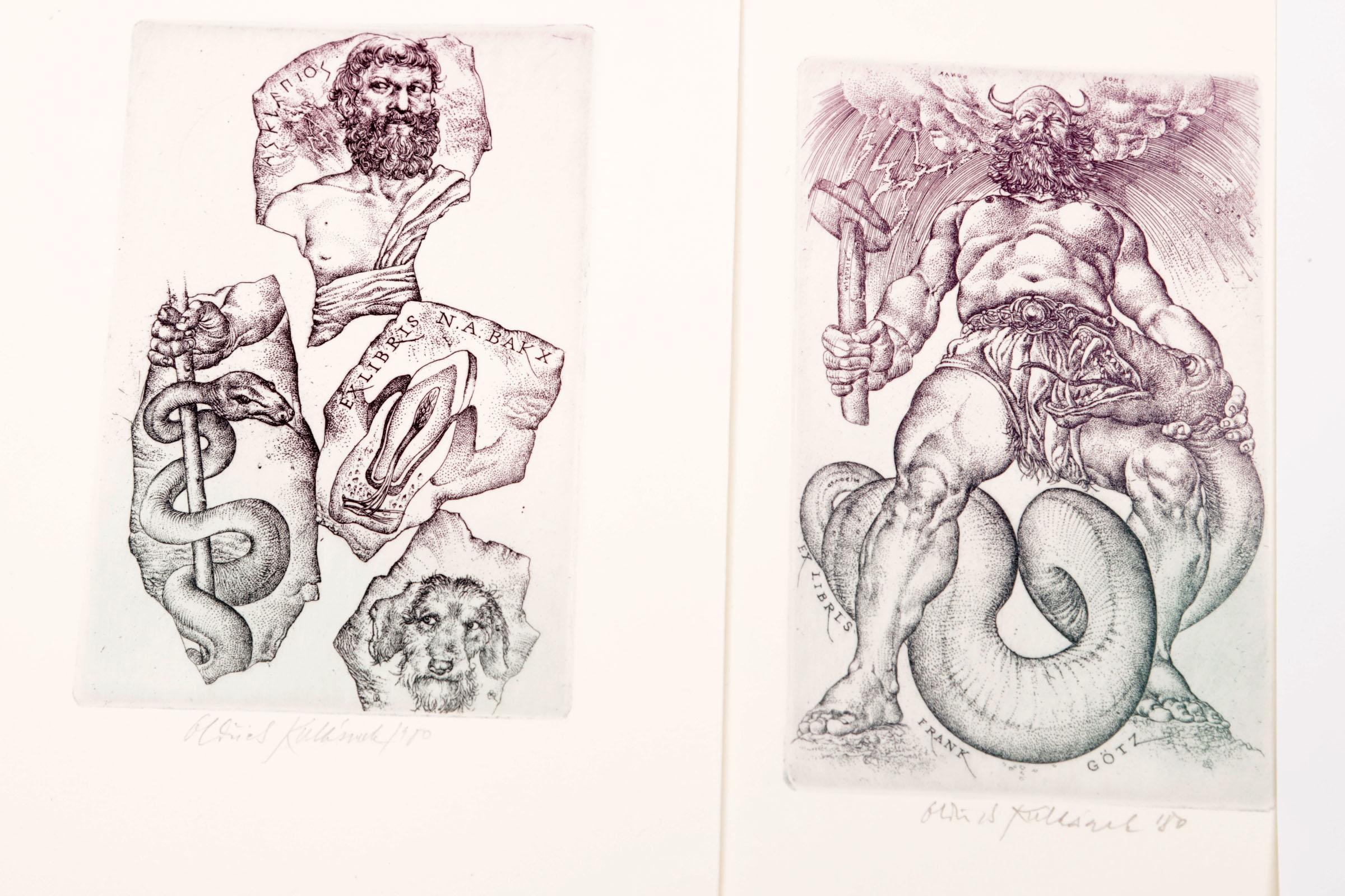 Kulhanek, Oldrich, 4 exlibris, C3, gesigneerd. Voor Hillerbrandt (opgeplakt), Gotz (Donar), Blokland, Bakx (medisch)