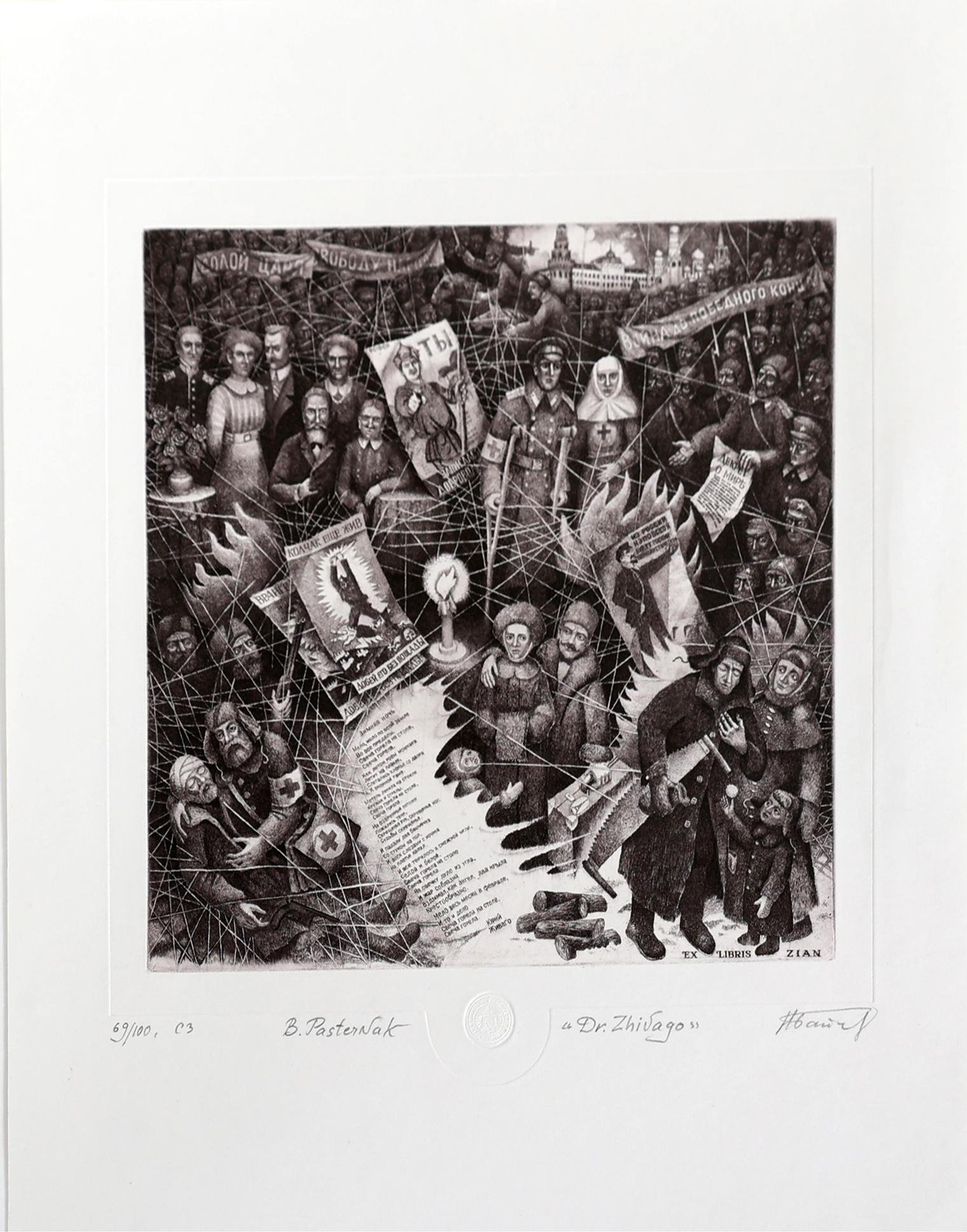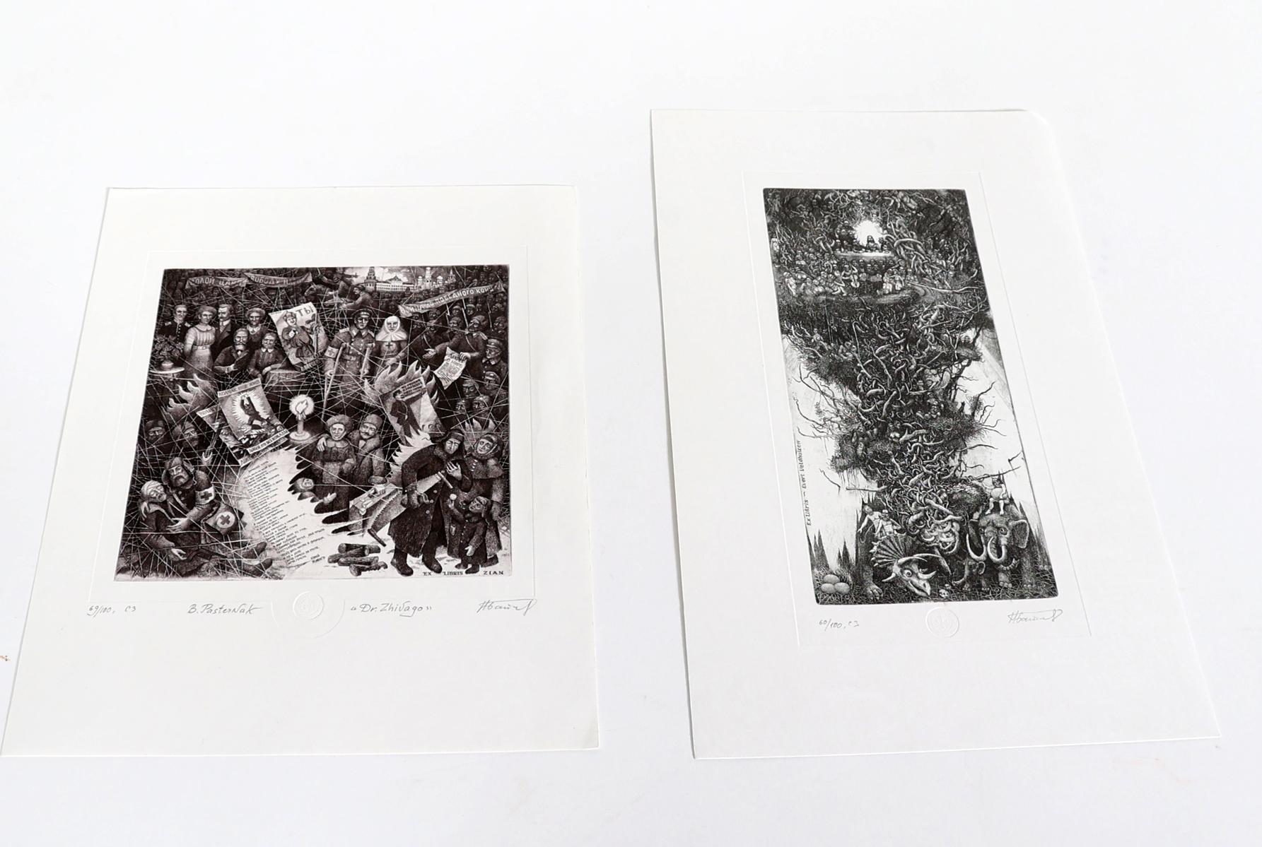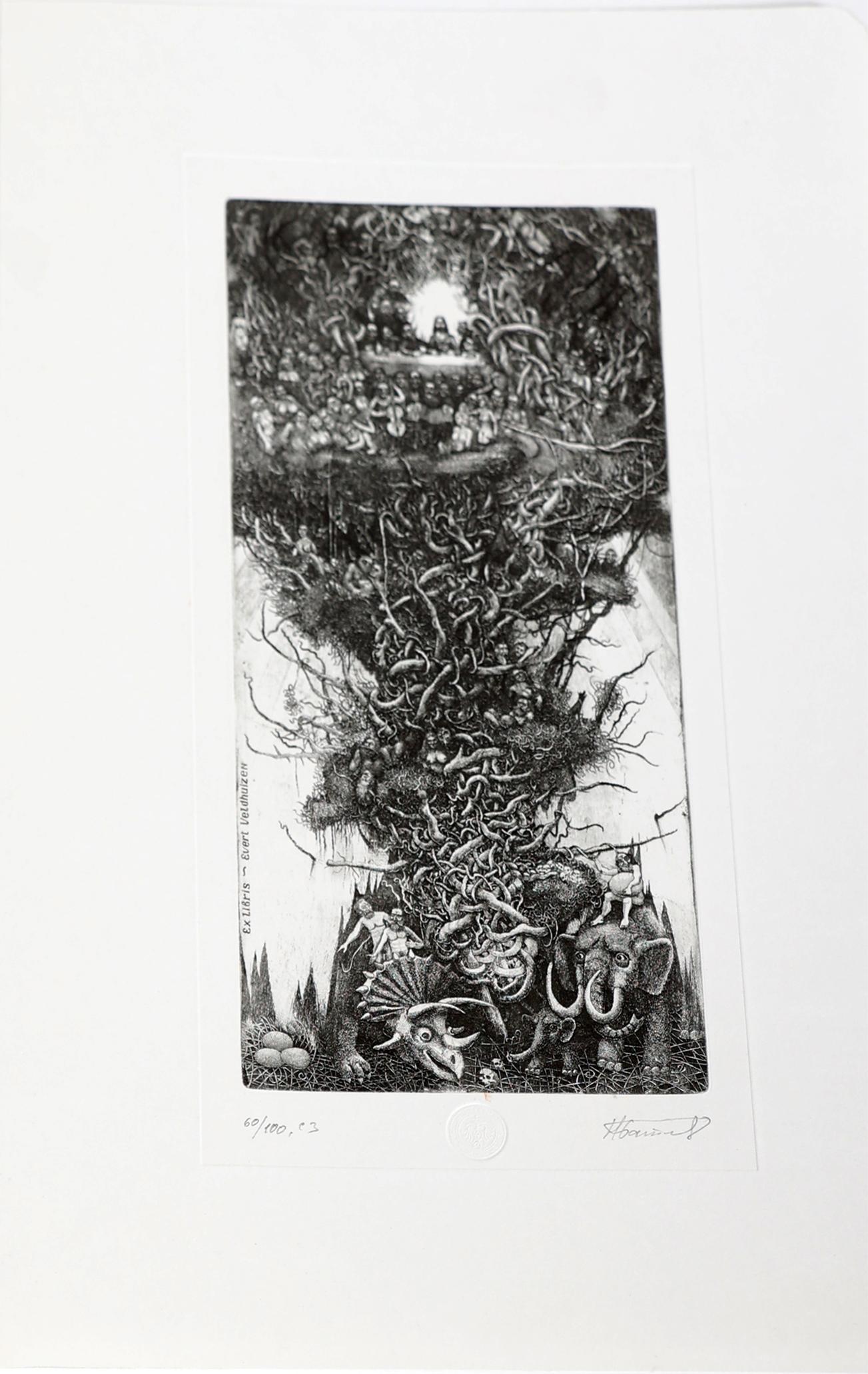 Batakov, N., 2 exlibris, (1. E.Veldhuizen, C3, 223x103 mm, genummerd en gesigneerd, 'tree of life'), 2. Zian, C3, 160x160 mm, genummerd en gesigneerd, 'B. Pasternak')
