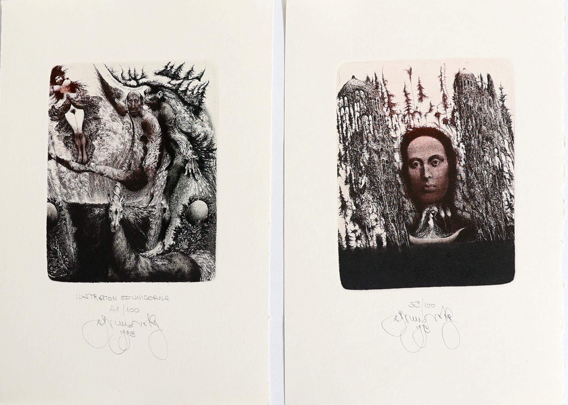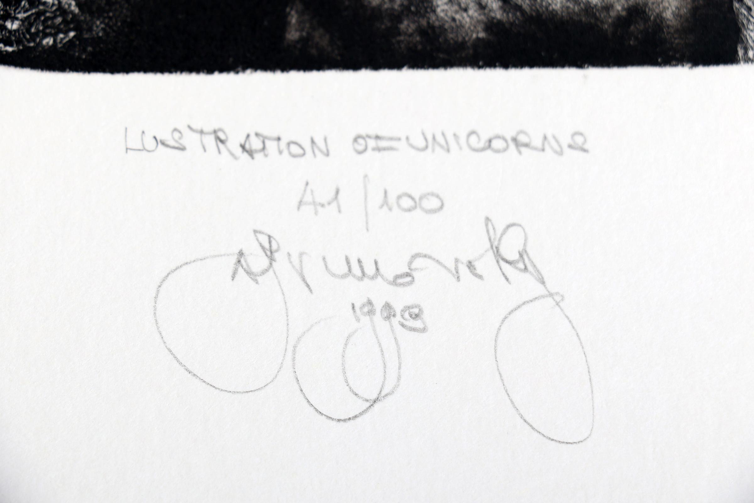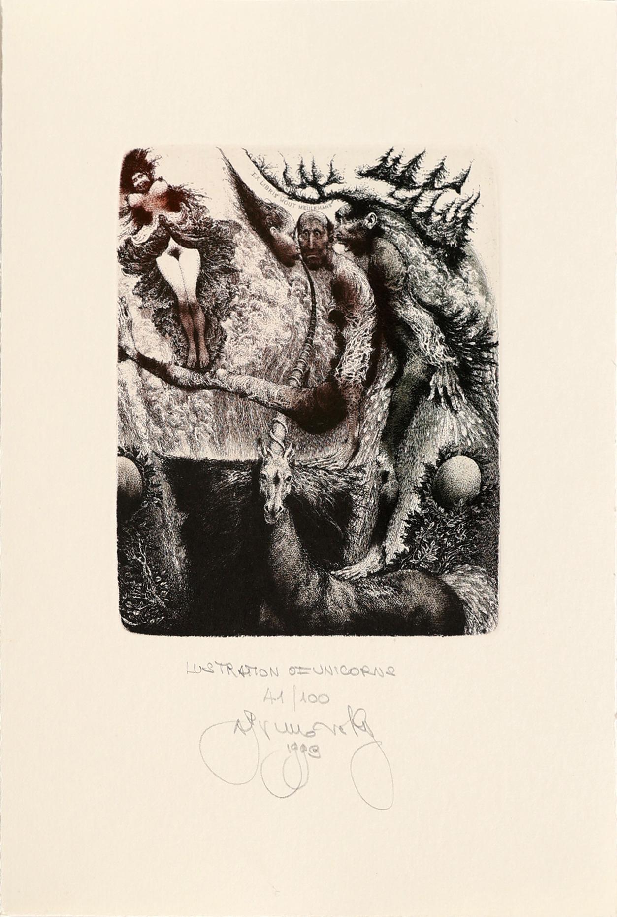 Brunovsky, A., 2 exlibris (Wout Meulemans, 1993, genummerd en gesigneerd, 1993, 'unicorn', 130x100 mm, plus: Miets Meulemans, 1993, genummerd en gesigneerd.