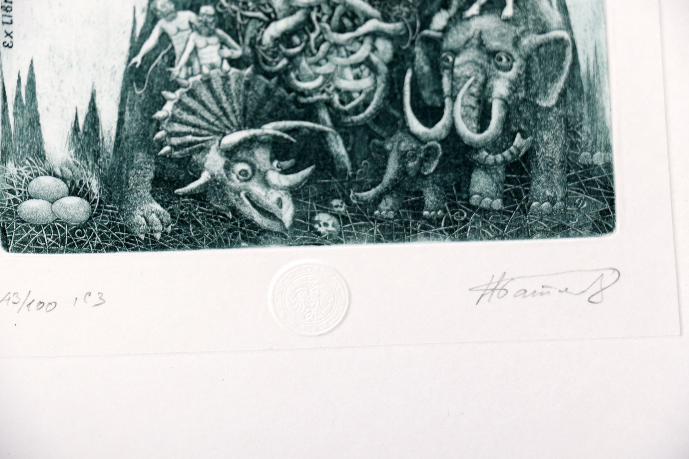 Batakov, N., 2 exlibris, (1. E.Veldhuizen, C3, 223x103 mm, genummerd en gesigneerd, 'tree of life'), 2. exlibris voor Ingrid van der Veen, C3C5, 85x85 mm, genummerd en gesigneerd, opgeplakt
