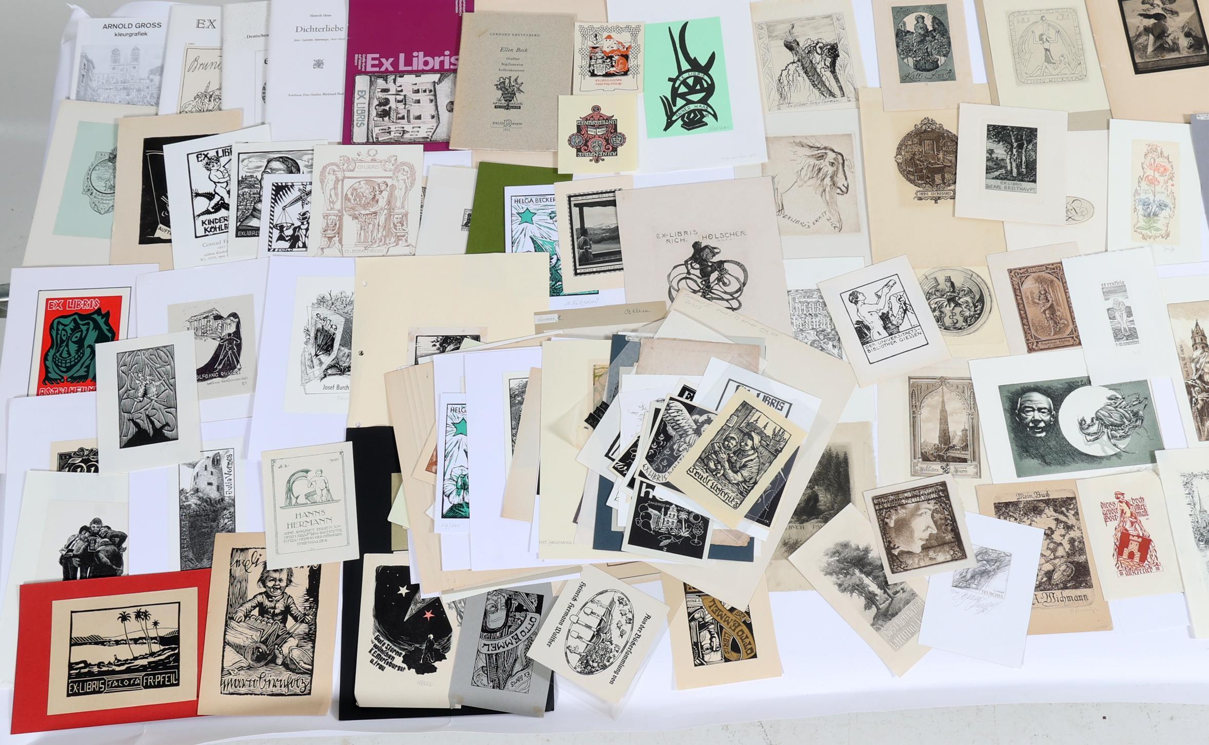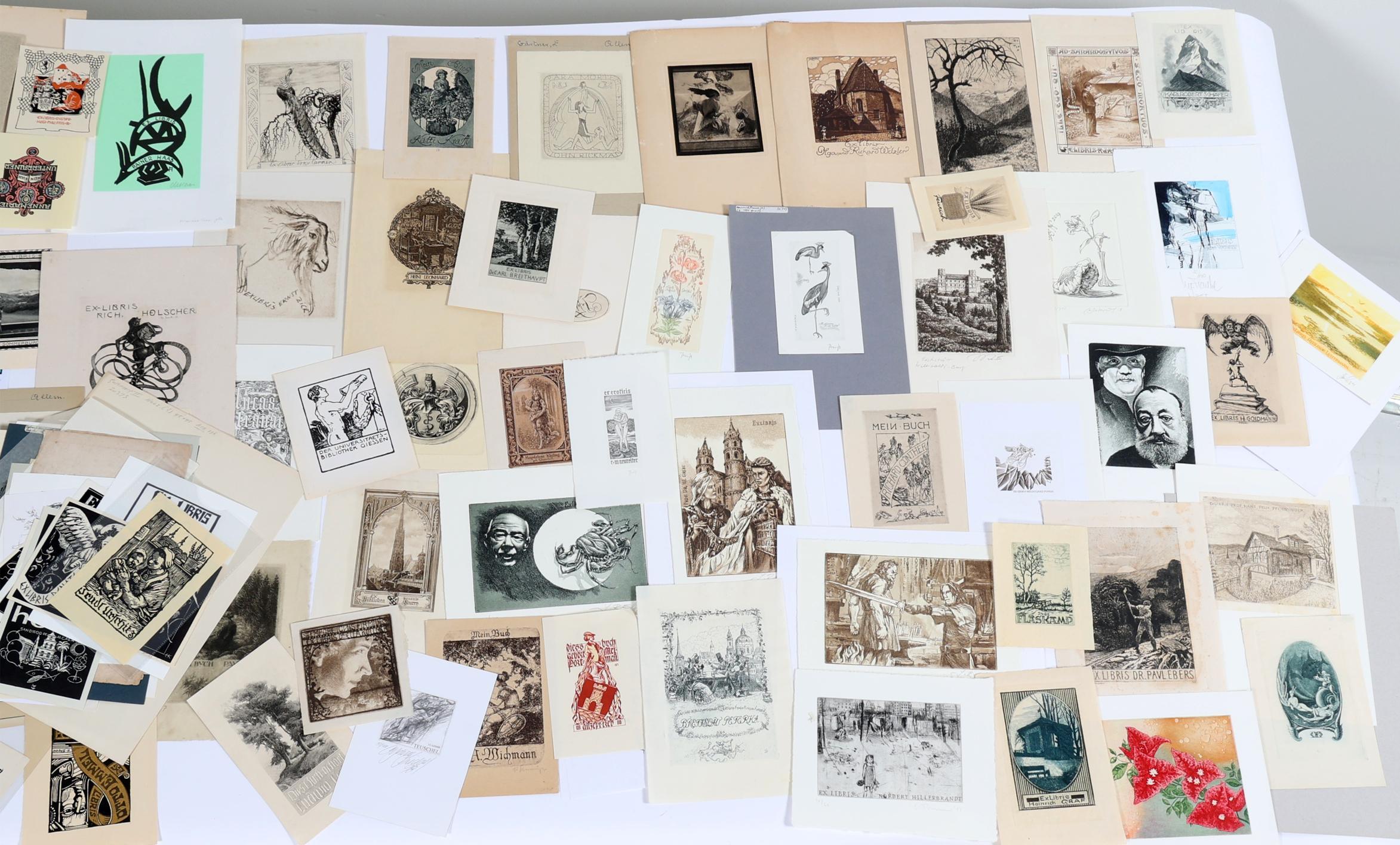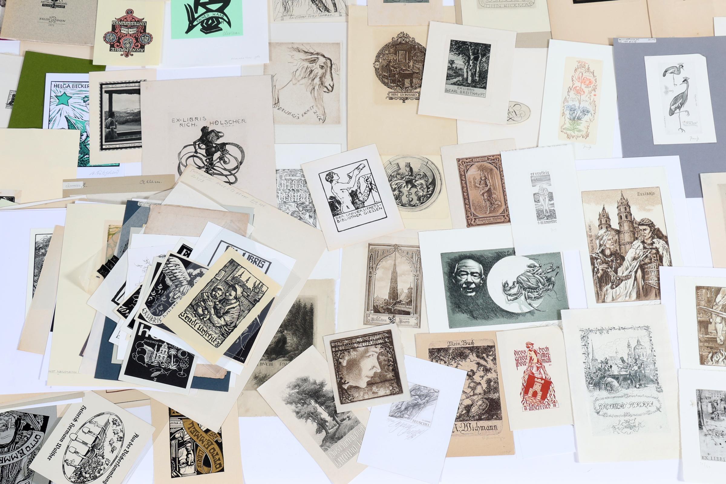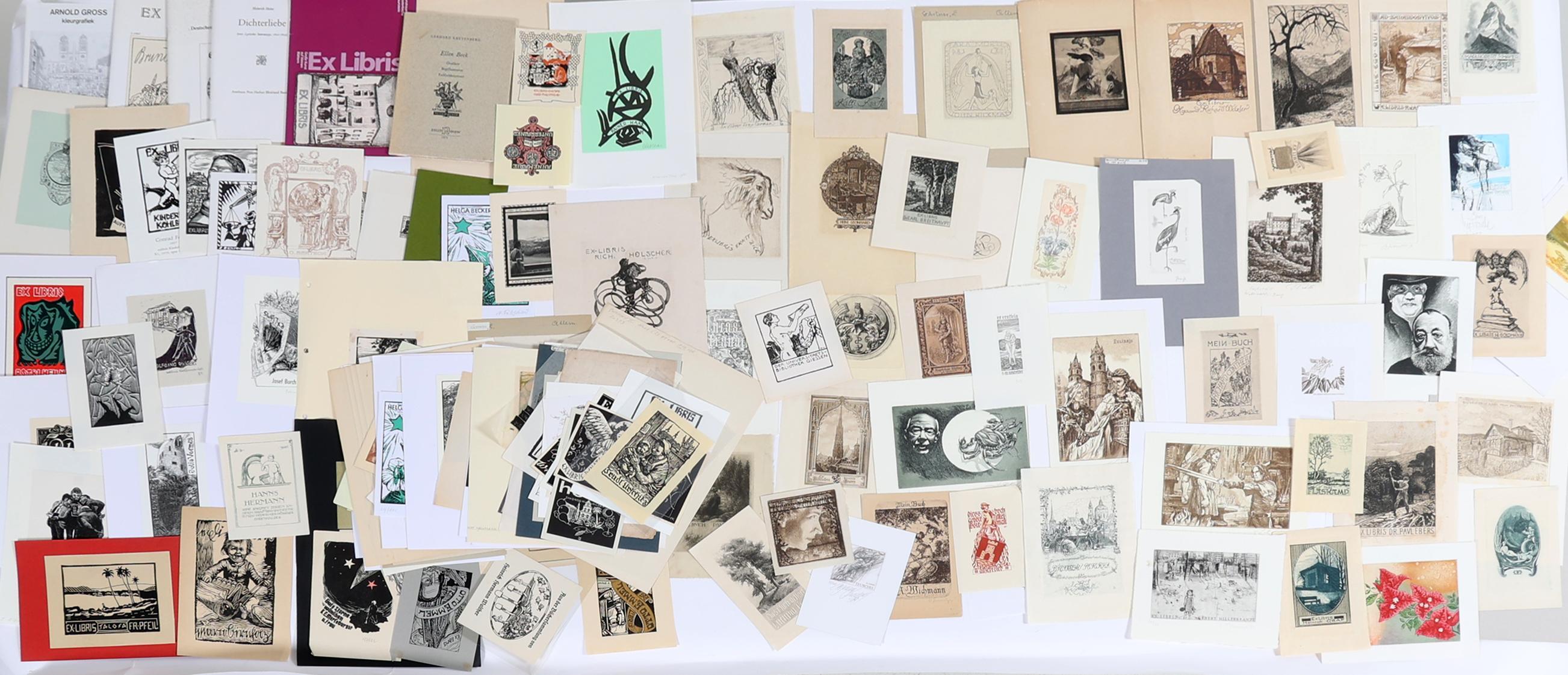 collectie plm. 140 exlibris / kleingrafiek uit Duitsland / Zwitserland. Plm. 40 x diepdruk, plm. 100 x hoogdruk / vlakdruk. Deels gesigneerd, deels opgeplakt. O.a. Krahl, Gaertner, Rusch, Preuss, Franke, Keller, Theumer, Albrecht, Fritsche, Herfurth, Busch, Haller. Toegevoegd: enkele brocgures, o.a. Heroux.