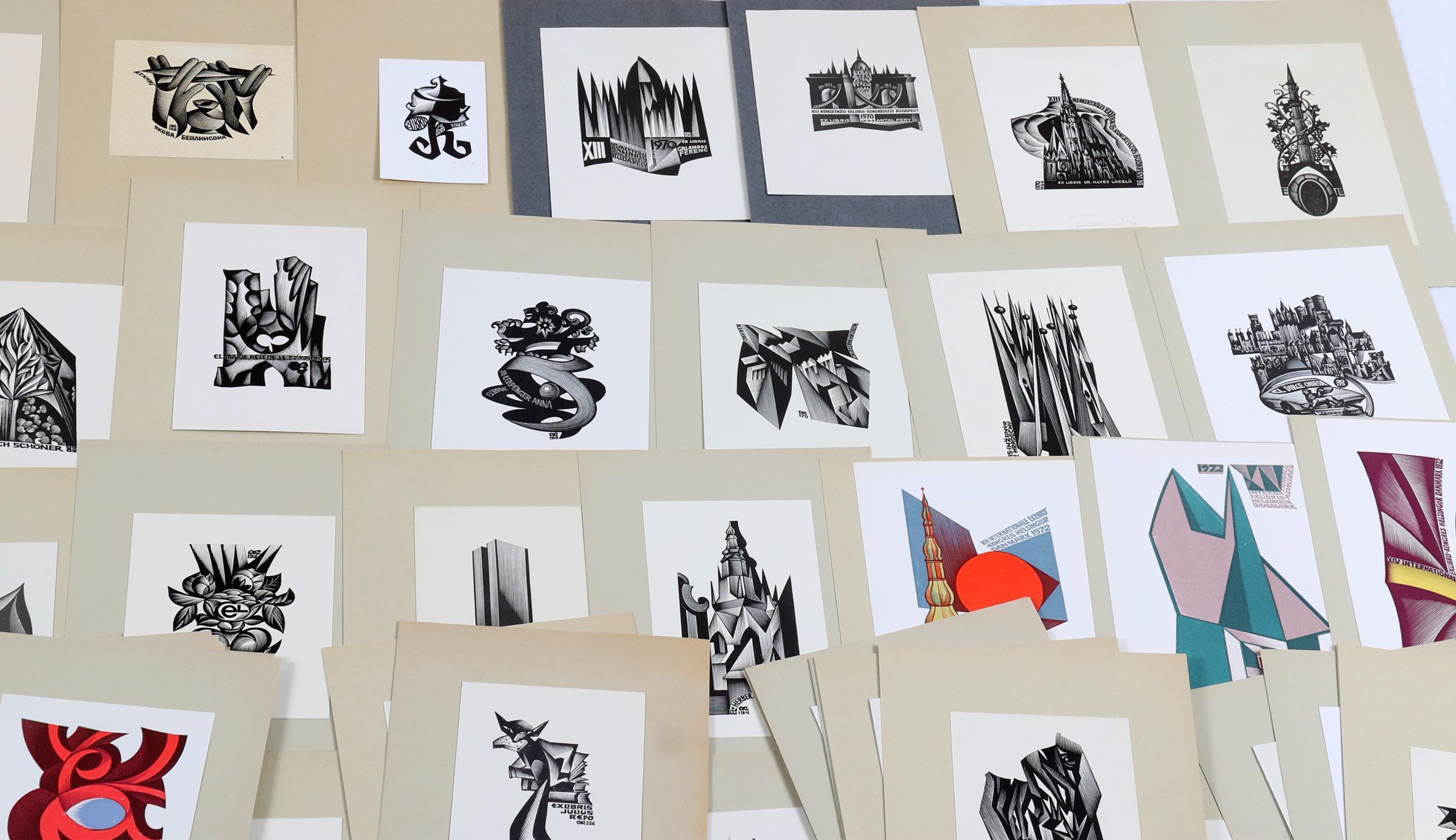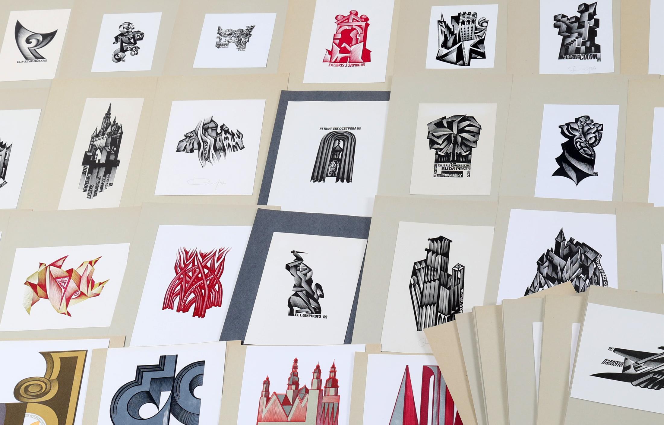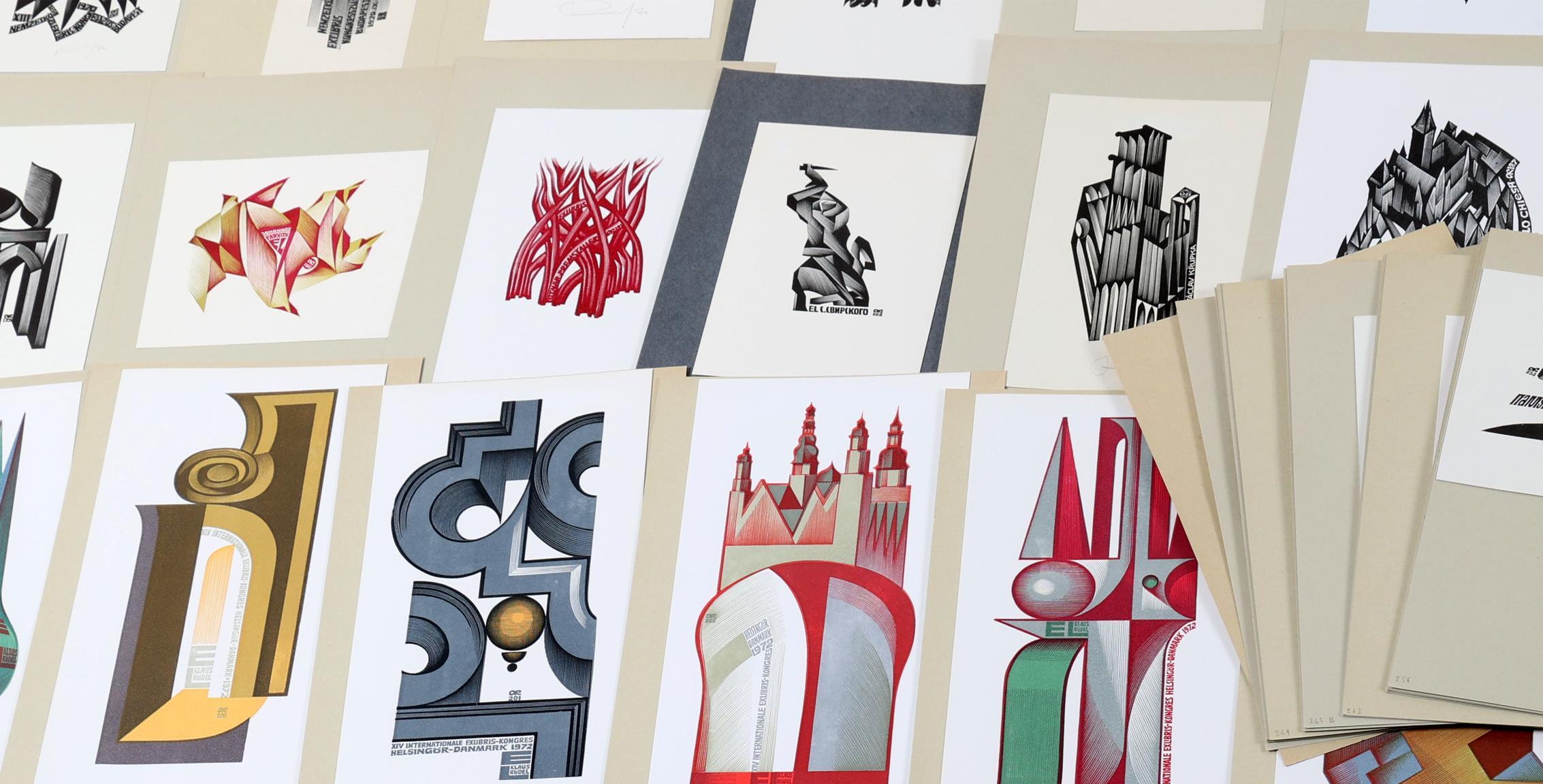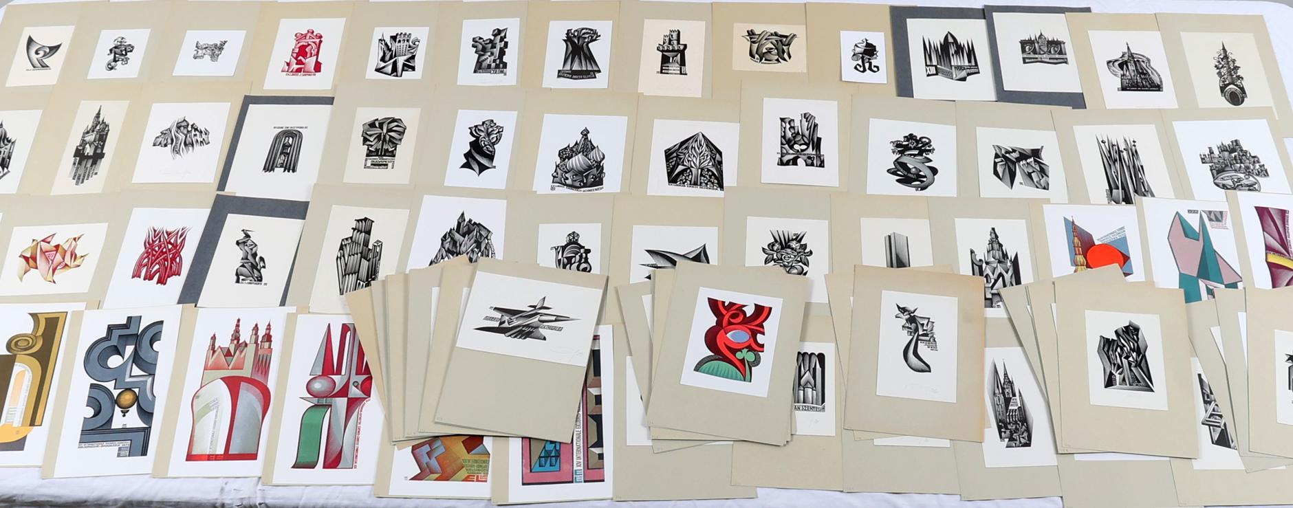 Kalaschnikov, A., plm. 100 exlibris, houtgravures, plm. 50 x gesigneerd. Sommige meerkleurig. Tussen opus 139 en 278. Opgeplakt.