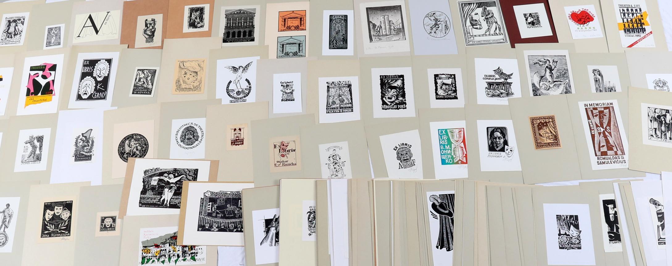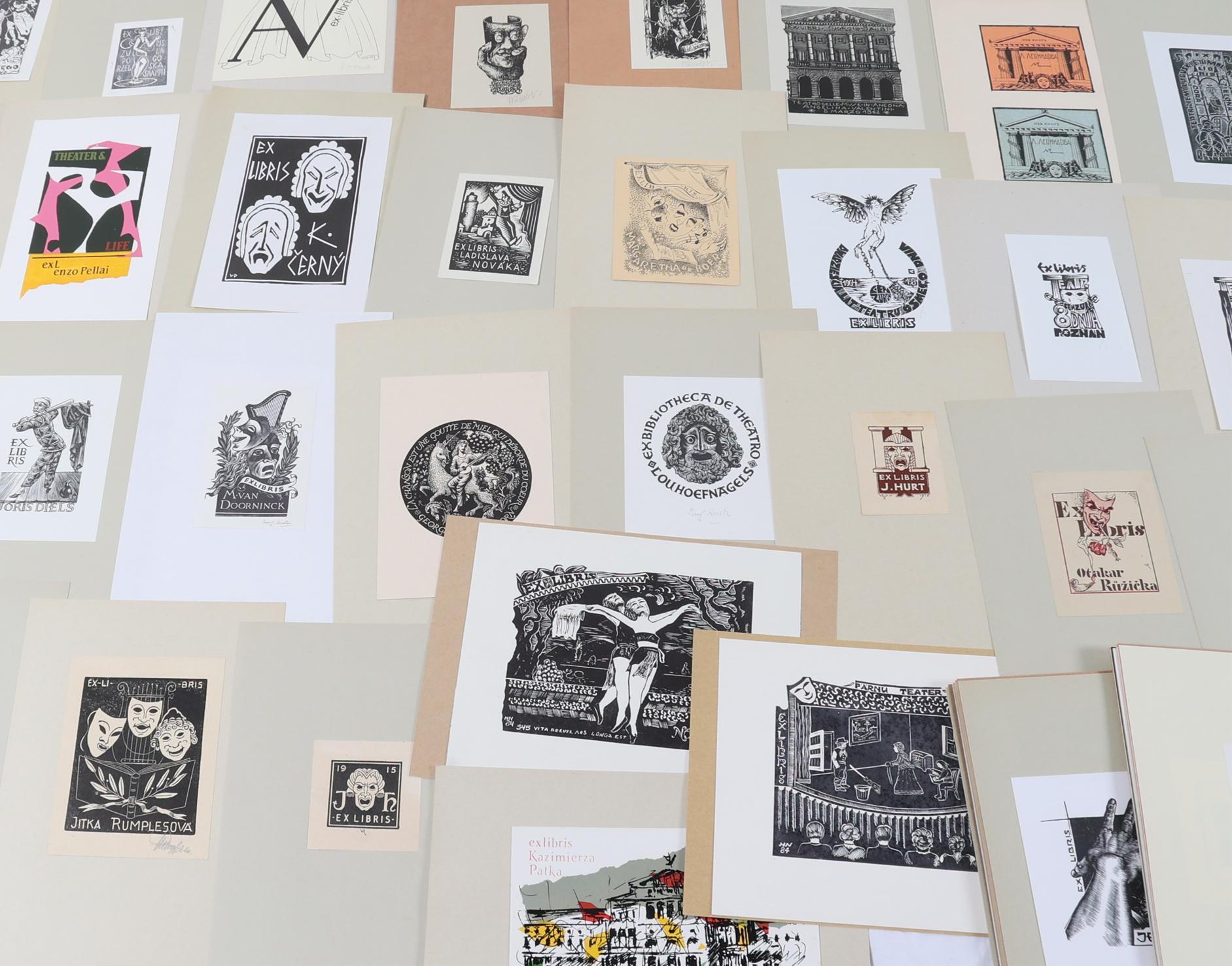 collectie van plm. 180 exlibris, thema: dramatische kunst, toneel. Hoogdruk /vlakdruk. Werk van o.a. De Wolff, Vermeylen, Sivac, Rytir, Rueter, Meeeuws. Deels gesigneerd, opgeplakt.
