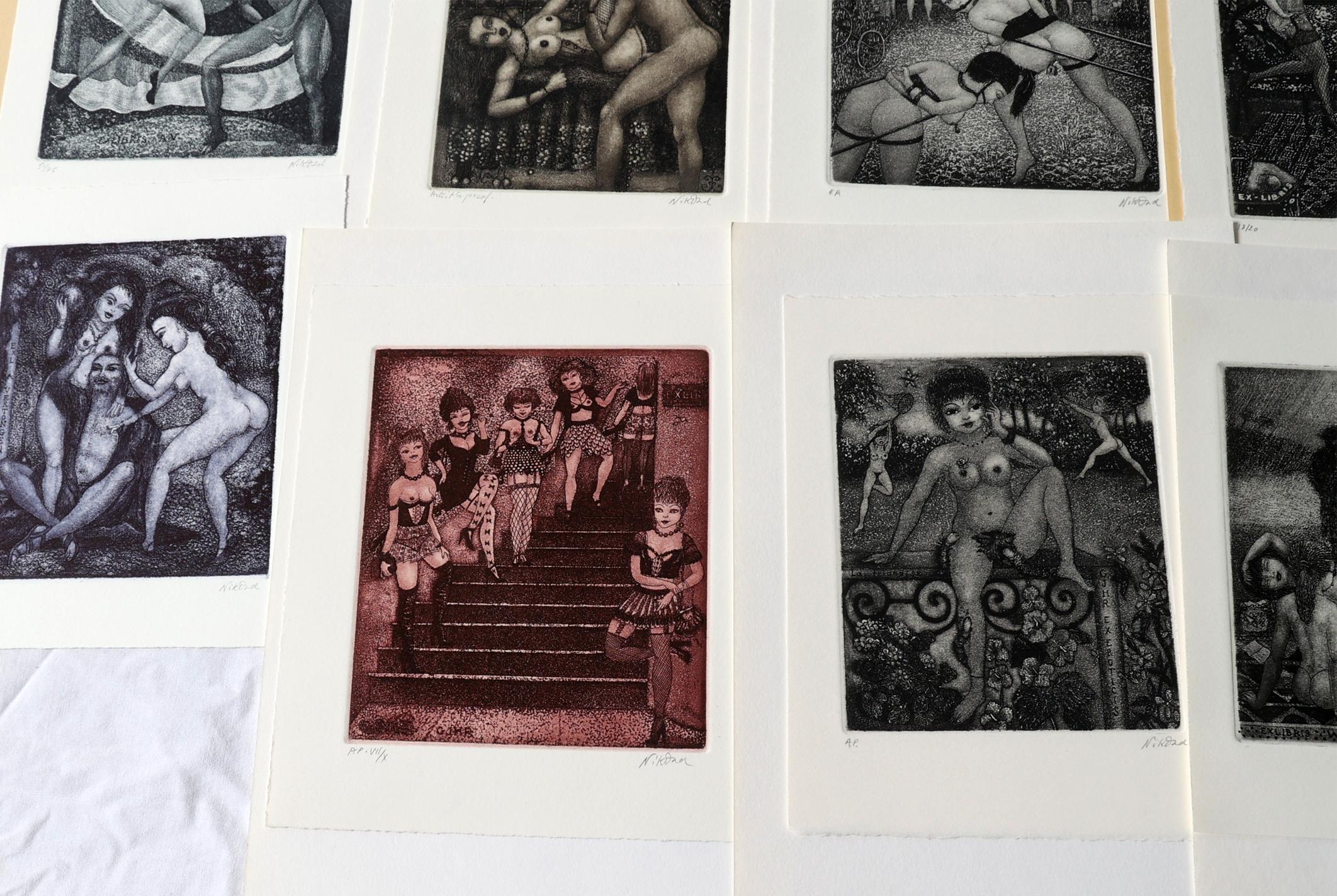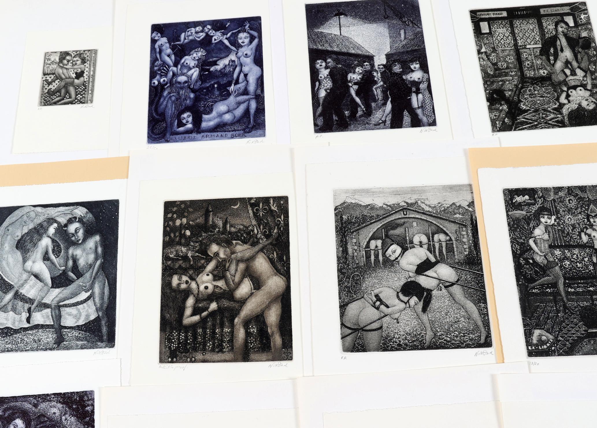 Nik-Dad, P., 15 exlibris, diepdruk, Thema: erotiek (prostitutie, SM, etc). 13 x gesigneerd, deels opgeplakt. O.a. opusnummers 7, 10, 12, 16, 34, 43, 48.