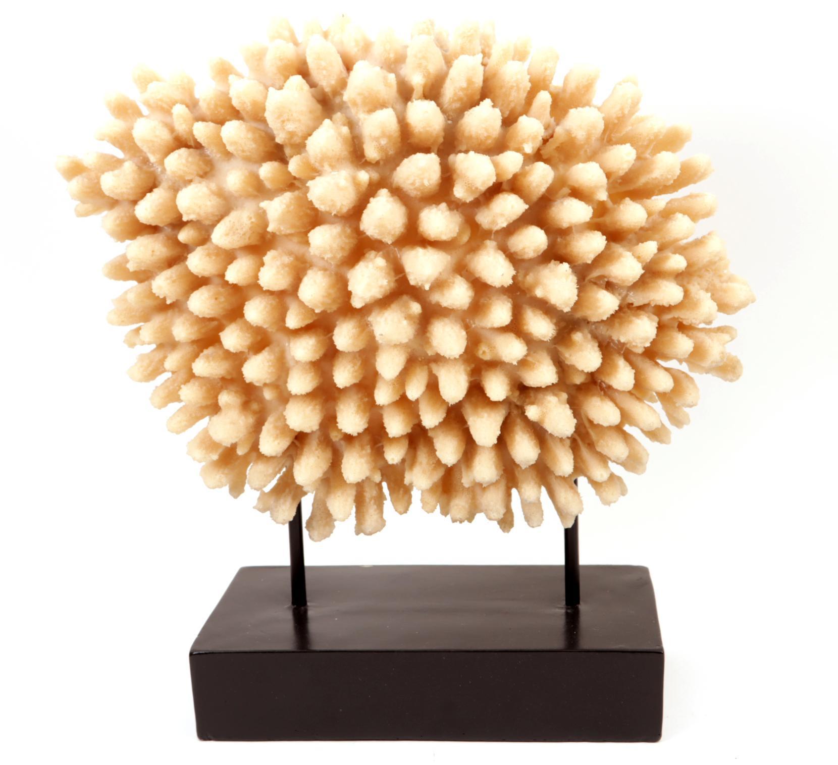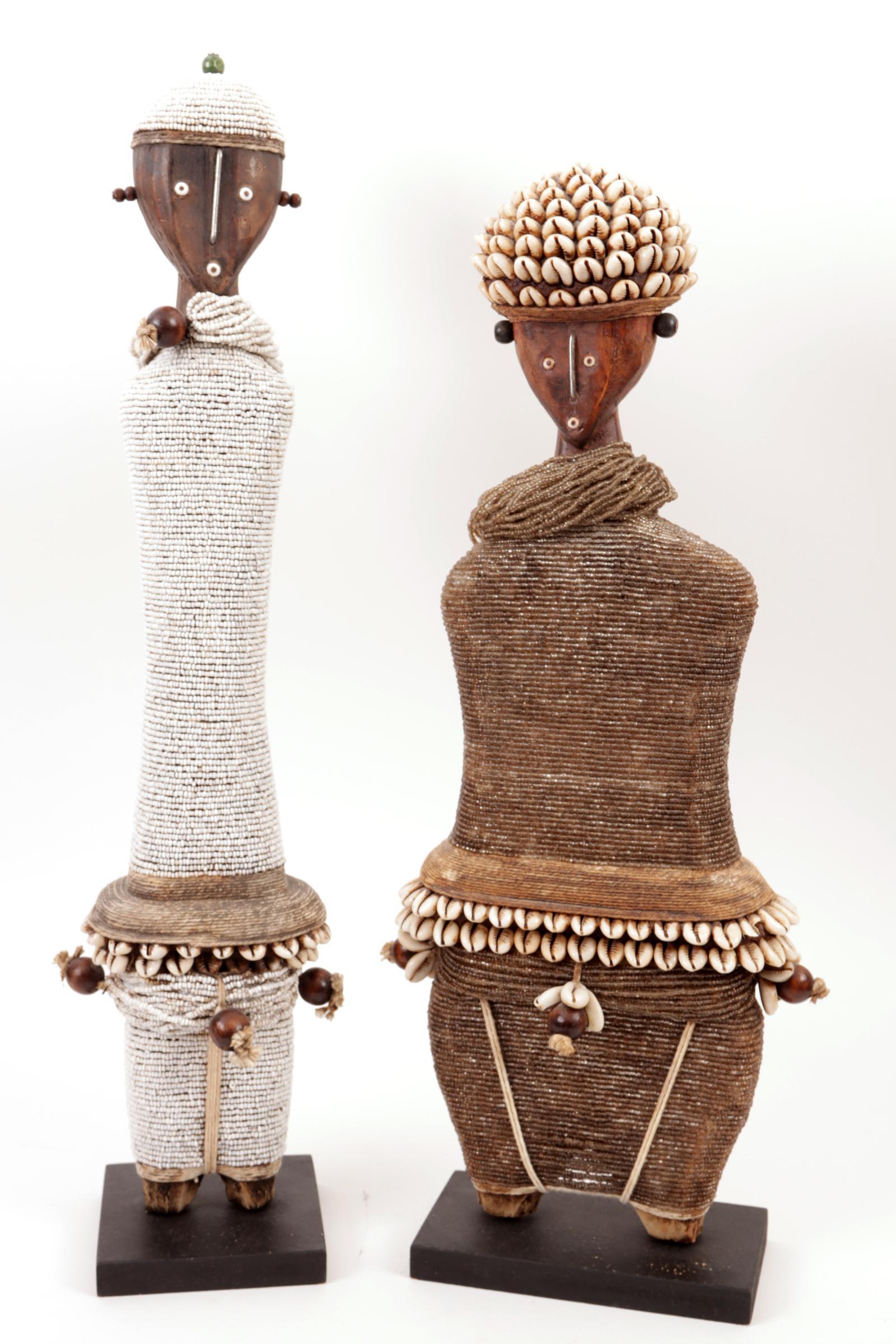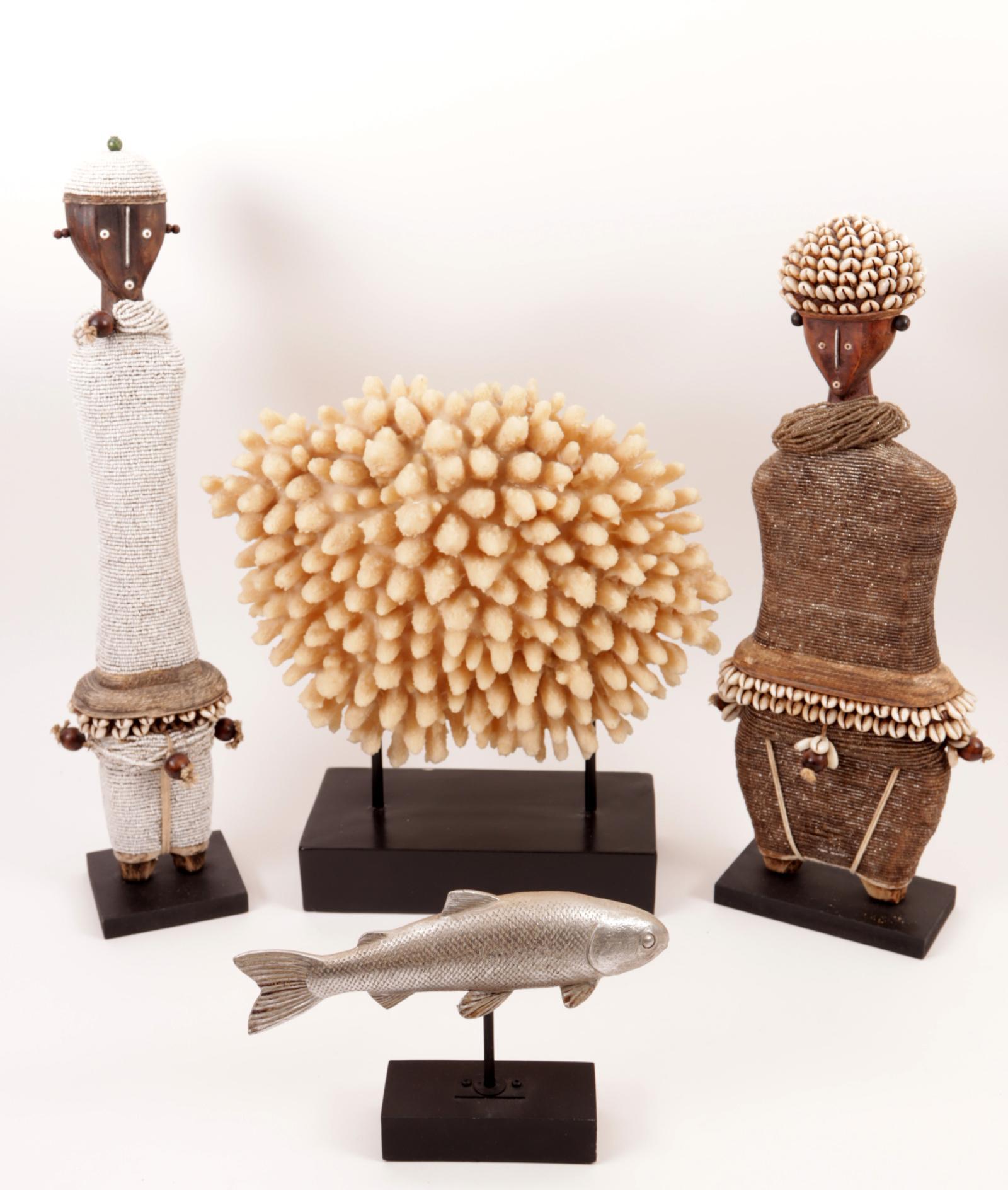 2 Houten beelden bewerkt met kralen en schelpen stuk kunst koraal en een vis