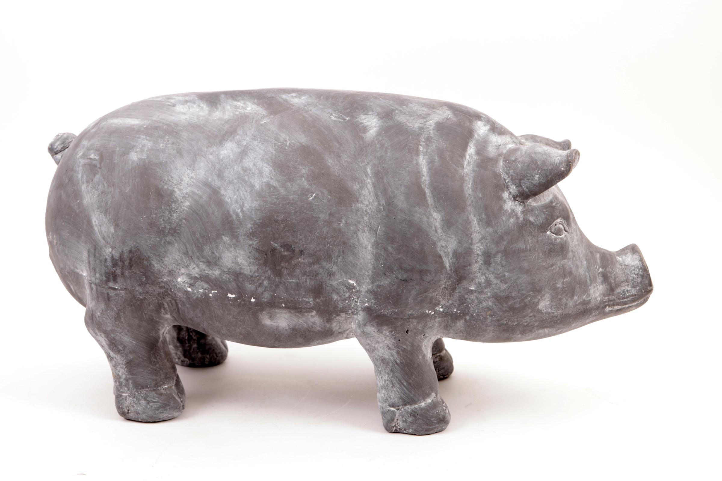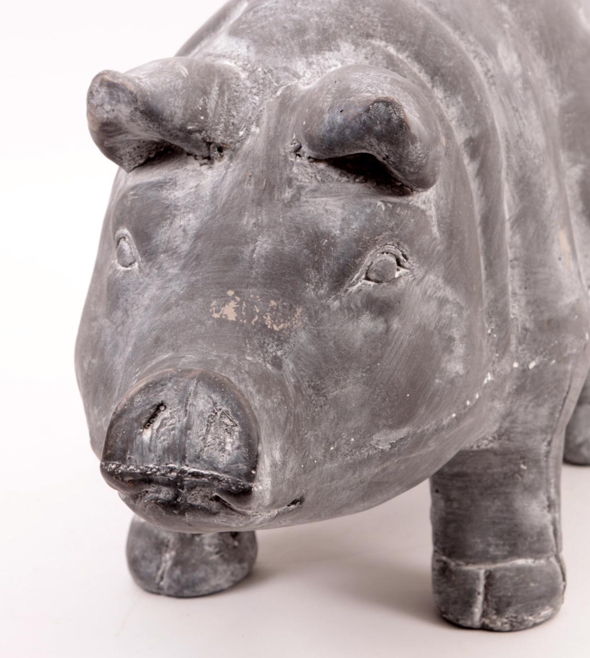 Grijs aardewerken varken, h.26 x L.53 cm.