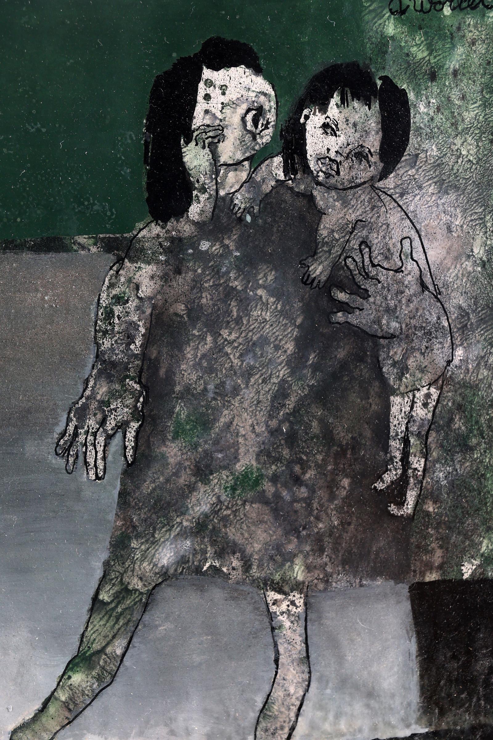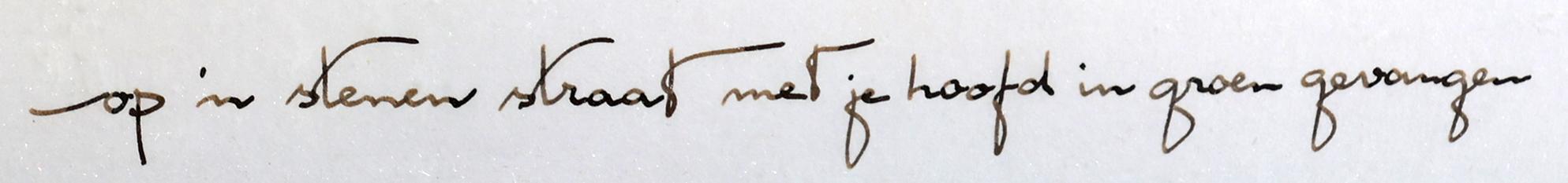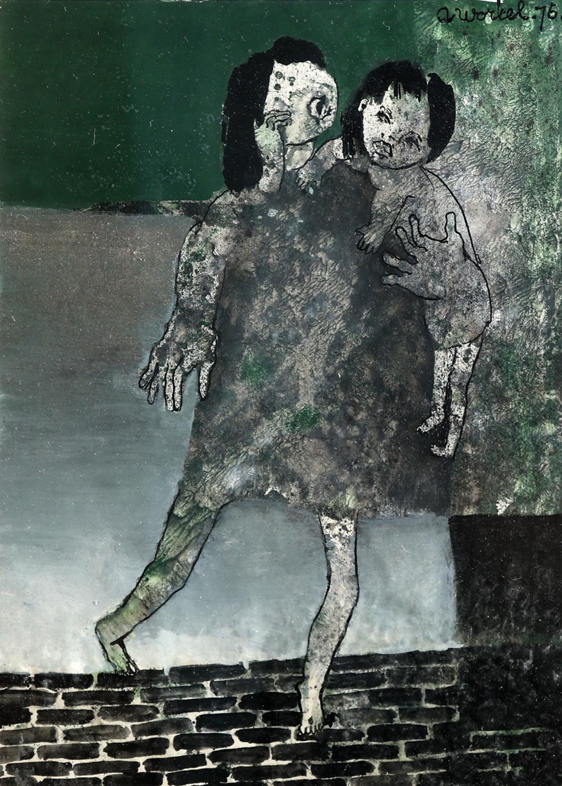 Ans Wortel (1929), "Op 'm stenenstraat met je hoofd in groen gevangen", gemengde techniek op papier, 28 x 20 cm., gesigneerd en gedateerd 1975