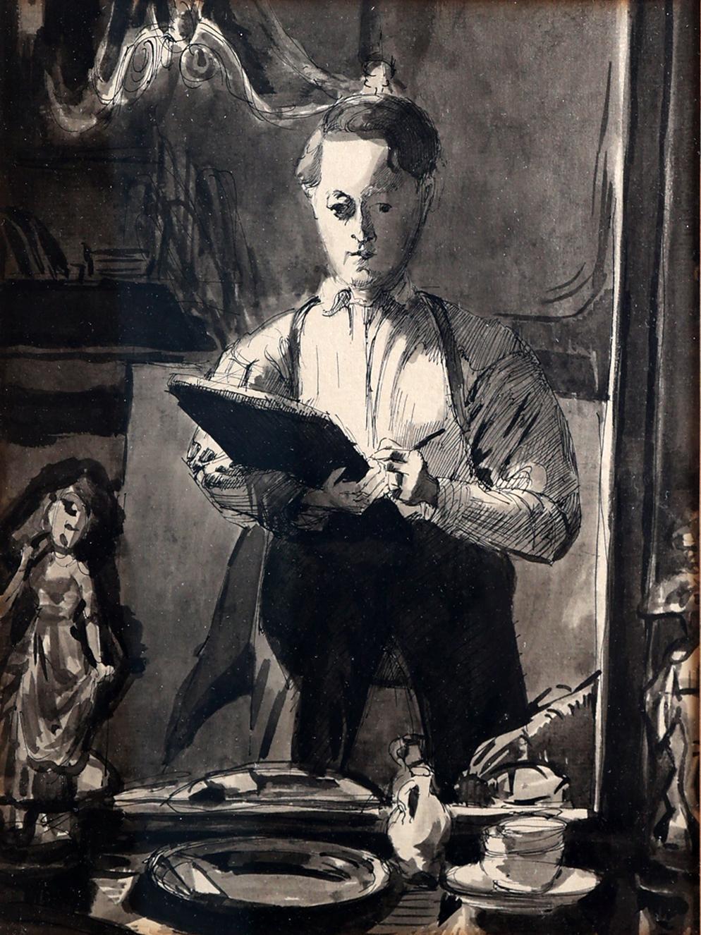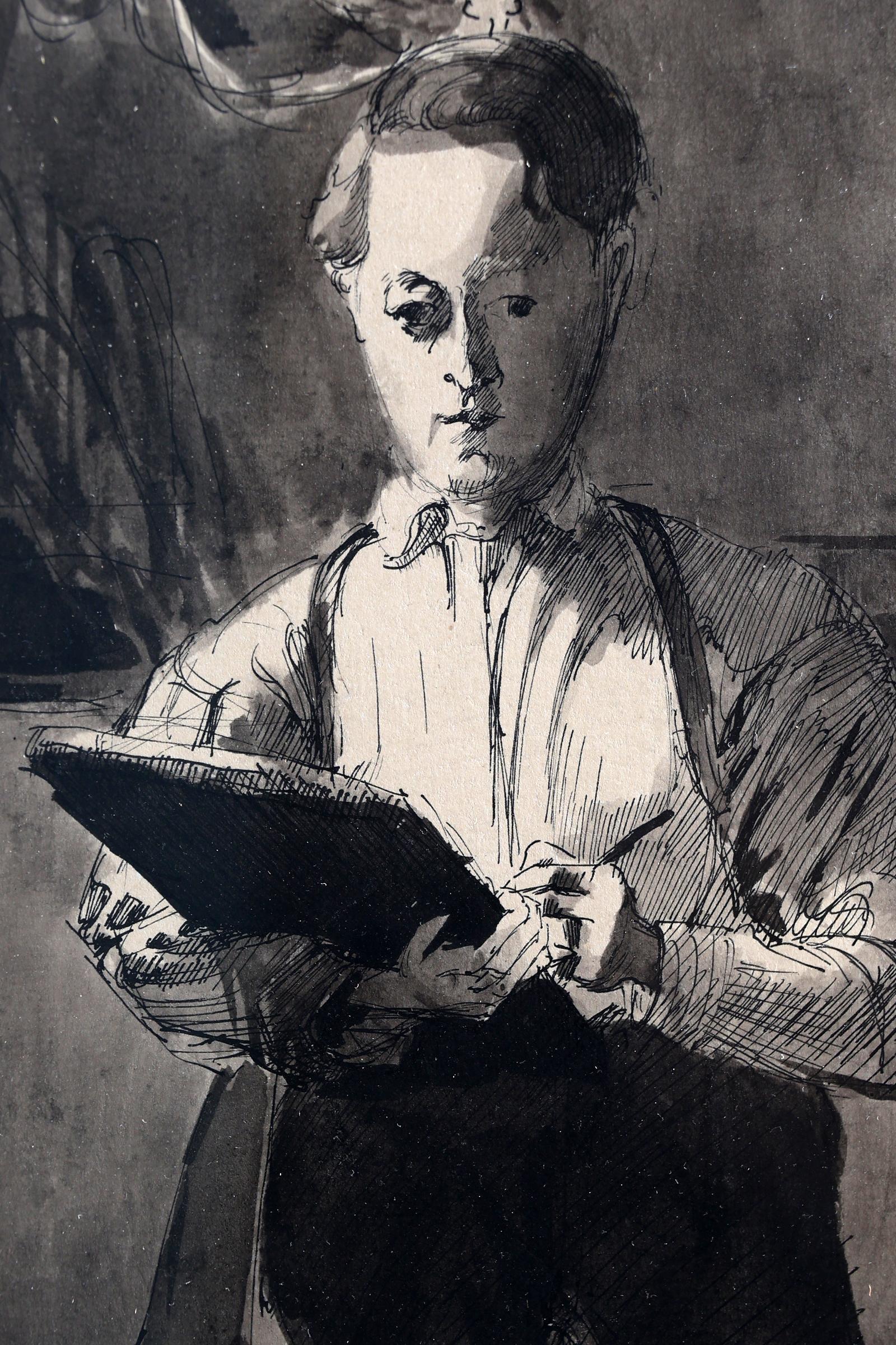 Toegeschreven aan G.C. Haverkamp, Schrijvende man in interieur, sepia/inkttekening, 28 x 21 cm.