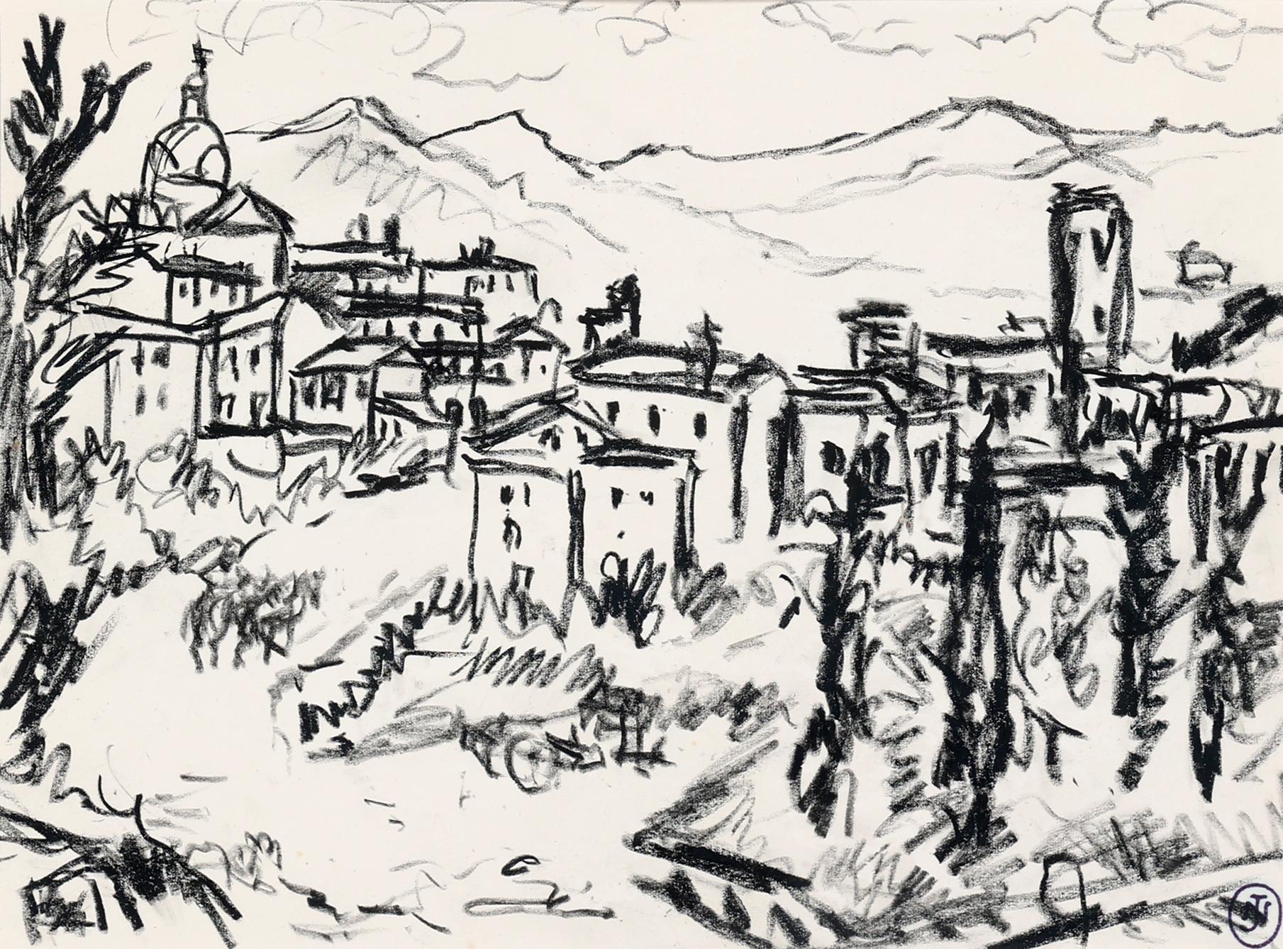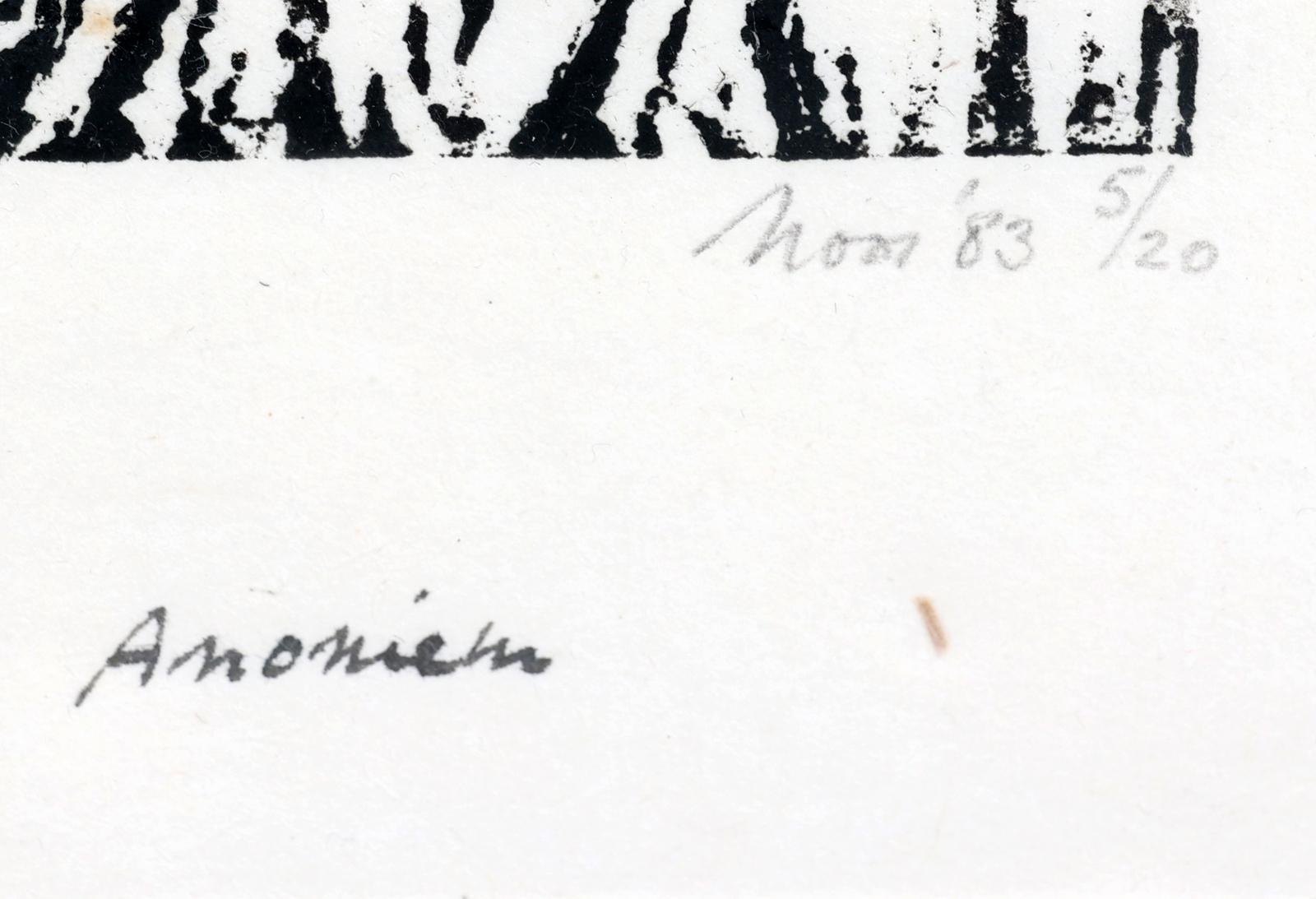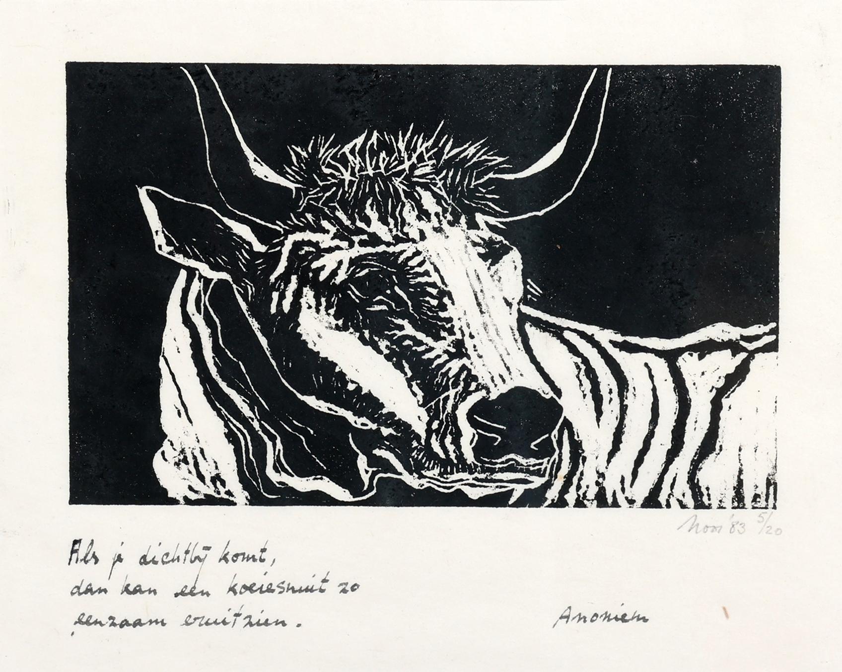 Koop van : zwart/witte litho van landschap en een ingelijste prent met de tekst "Als je dichtbij komt dan kan een koesnuit zo eenzaam eruitzien', Noor '83, nr.5/20