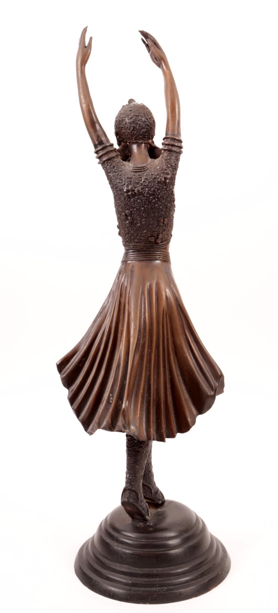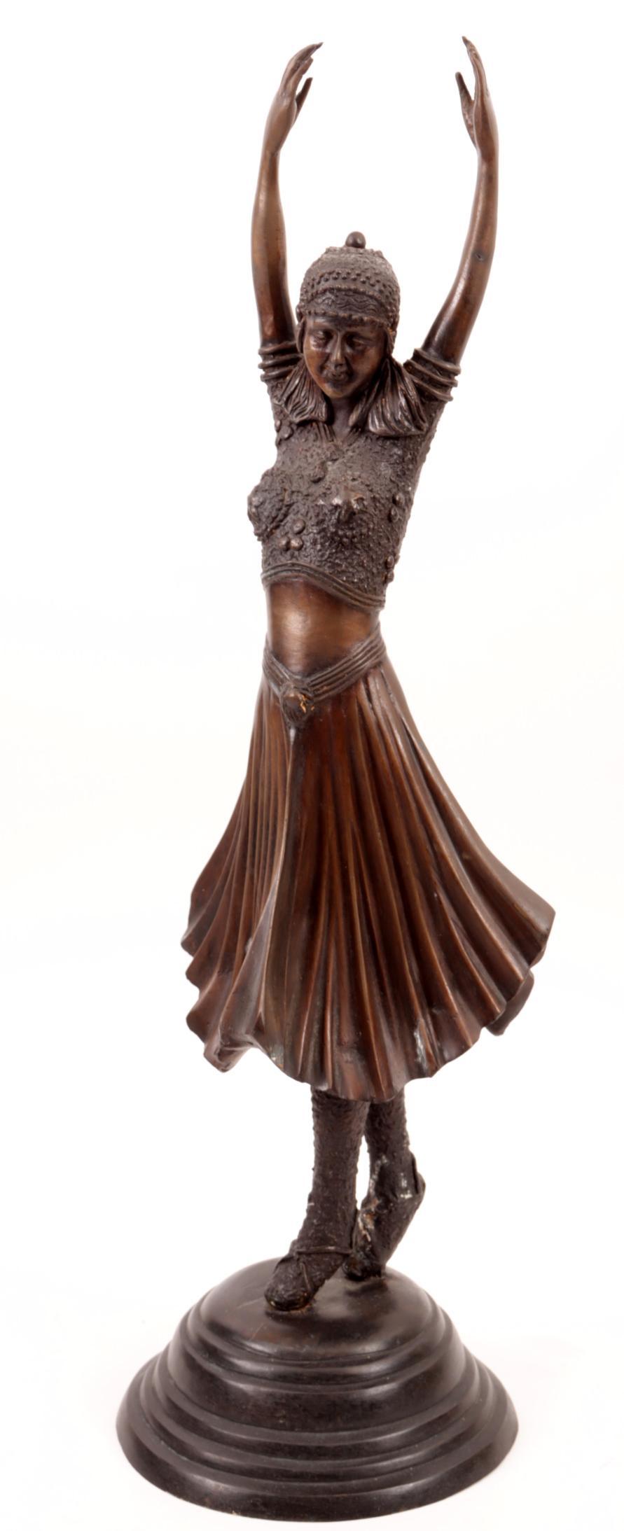 Bronzen sculptuur van danseres rustend op marmeren voetstuk, h.60 cm.