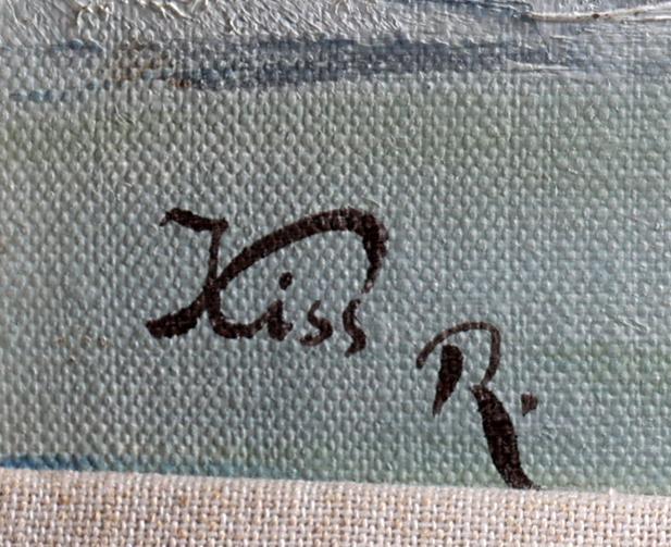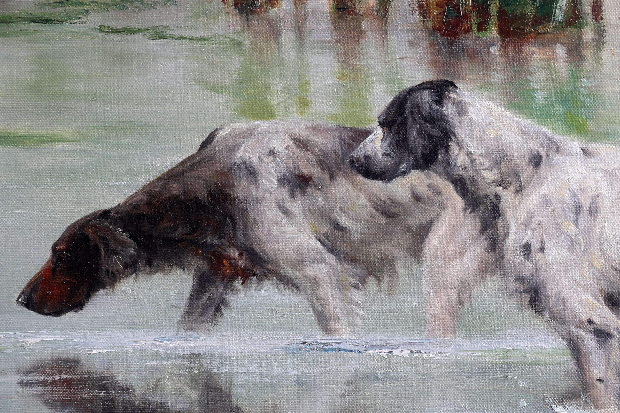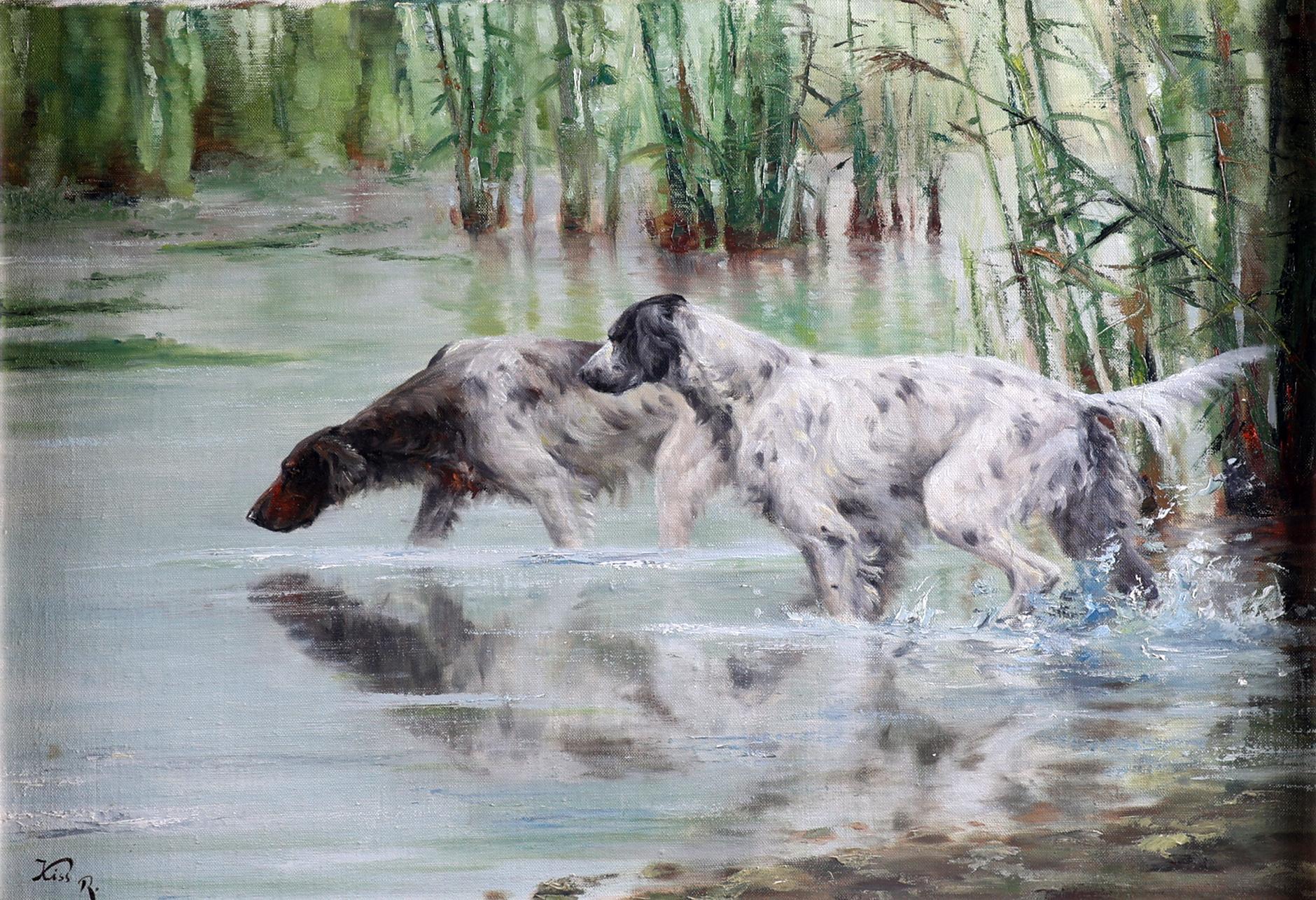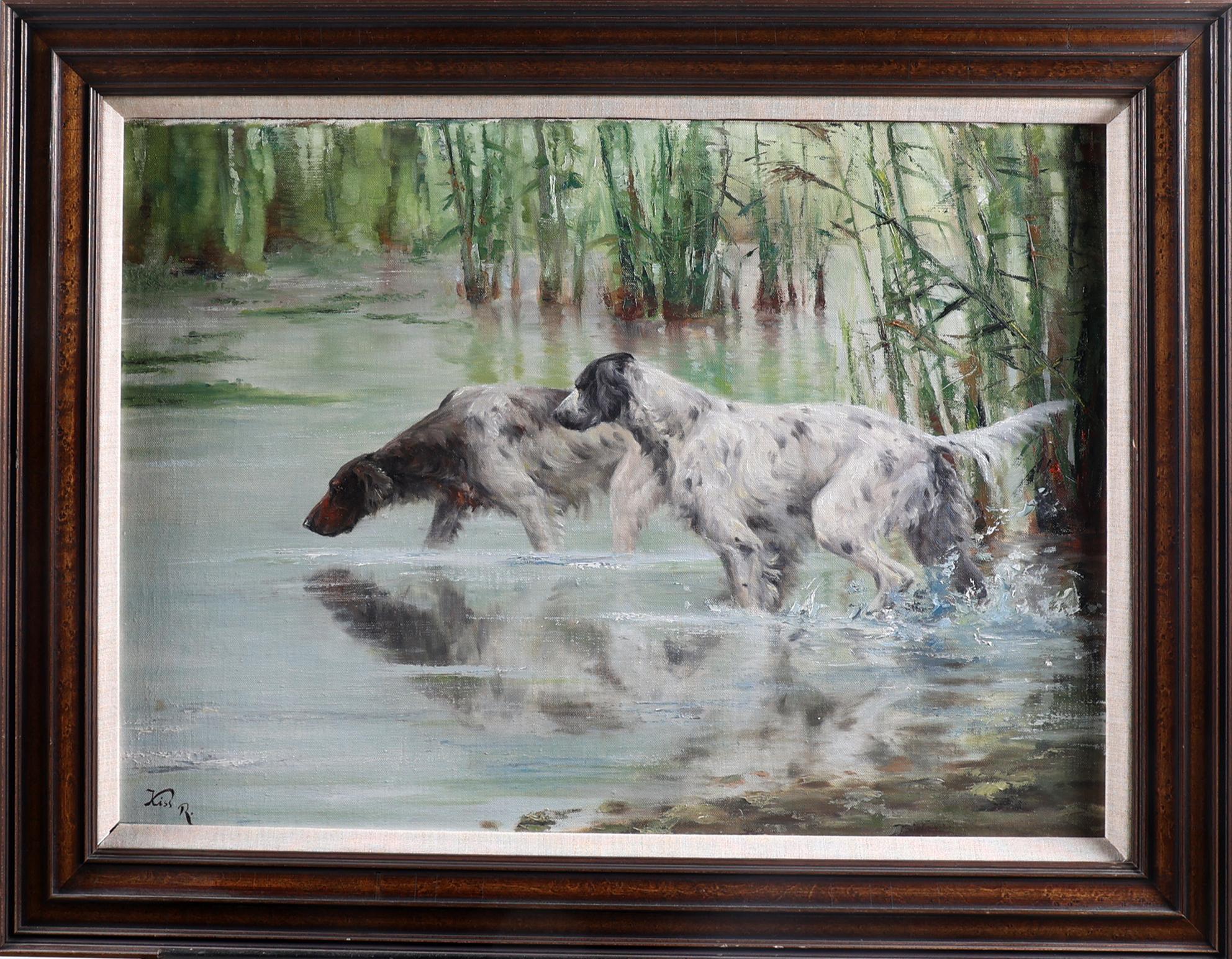 R. Kiss, Twee Engelse jachthonden in het water. maroefle, 70 x 50 cm.