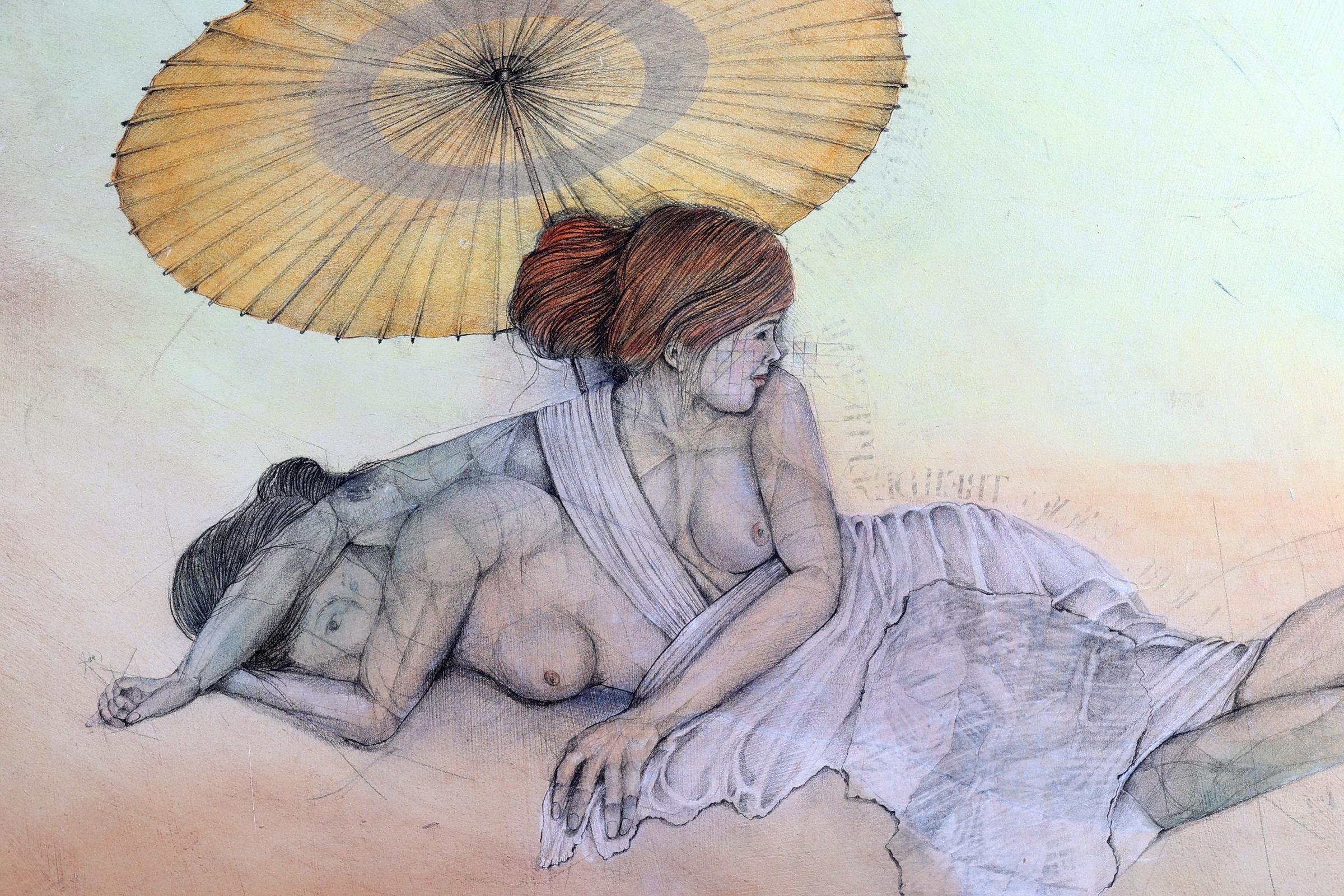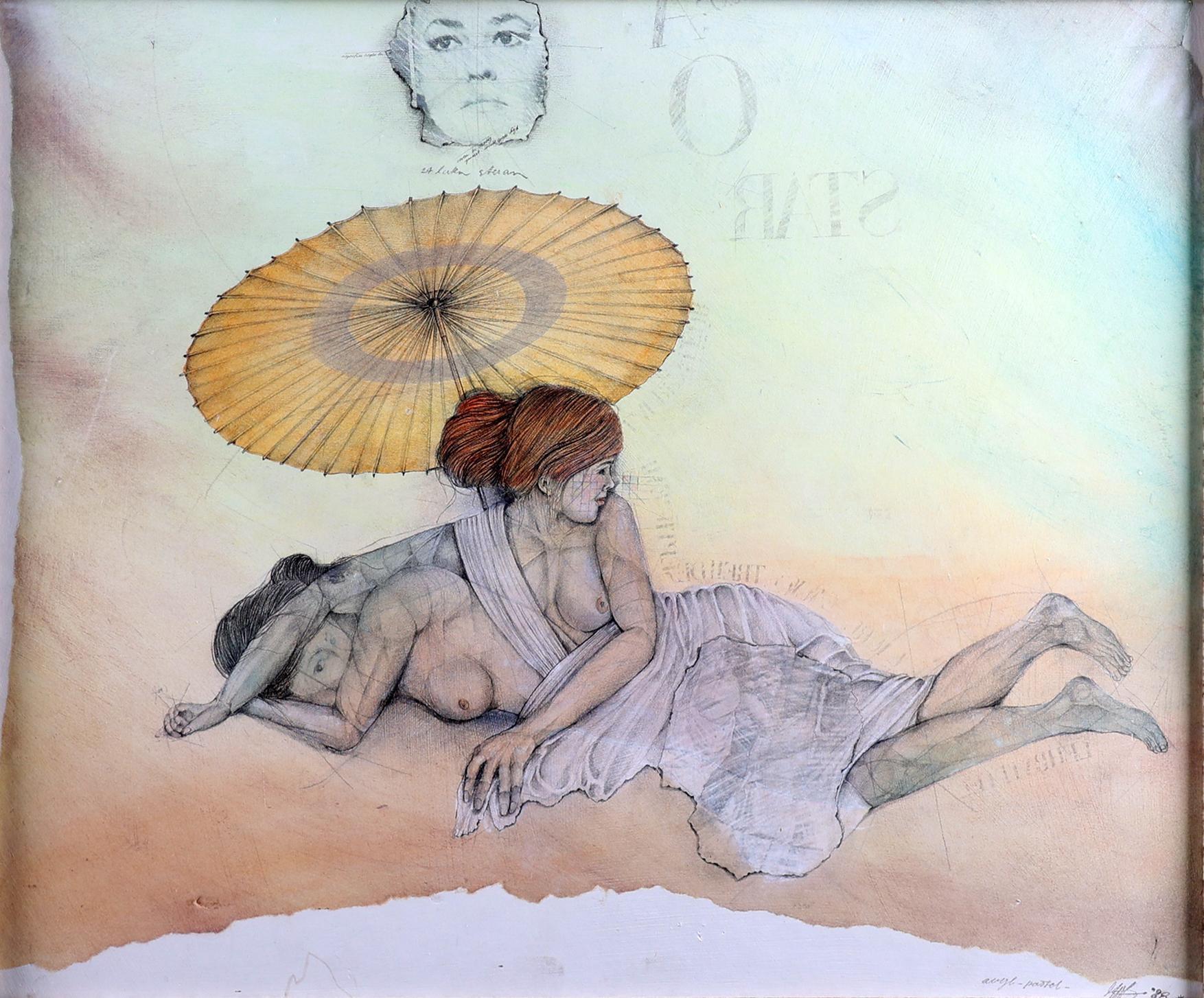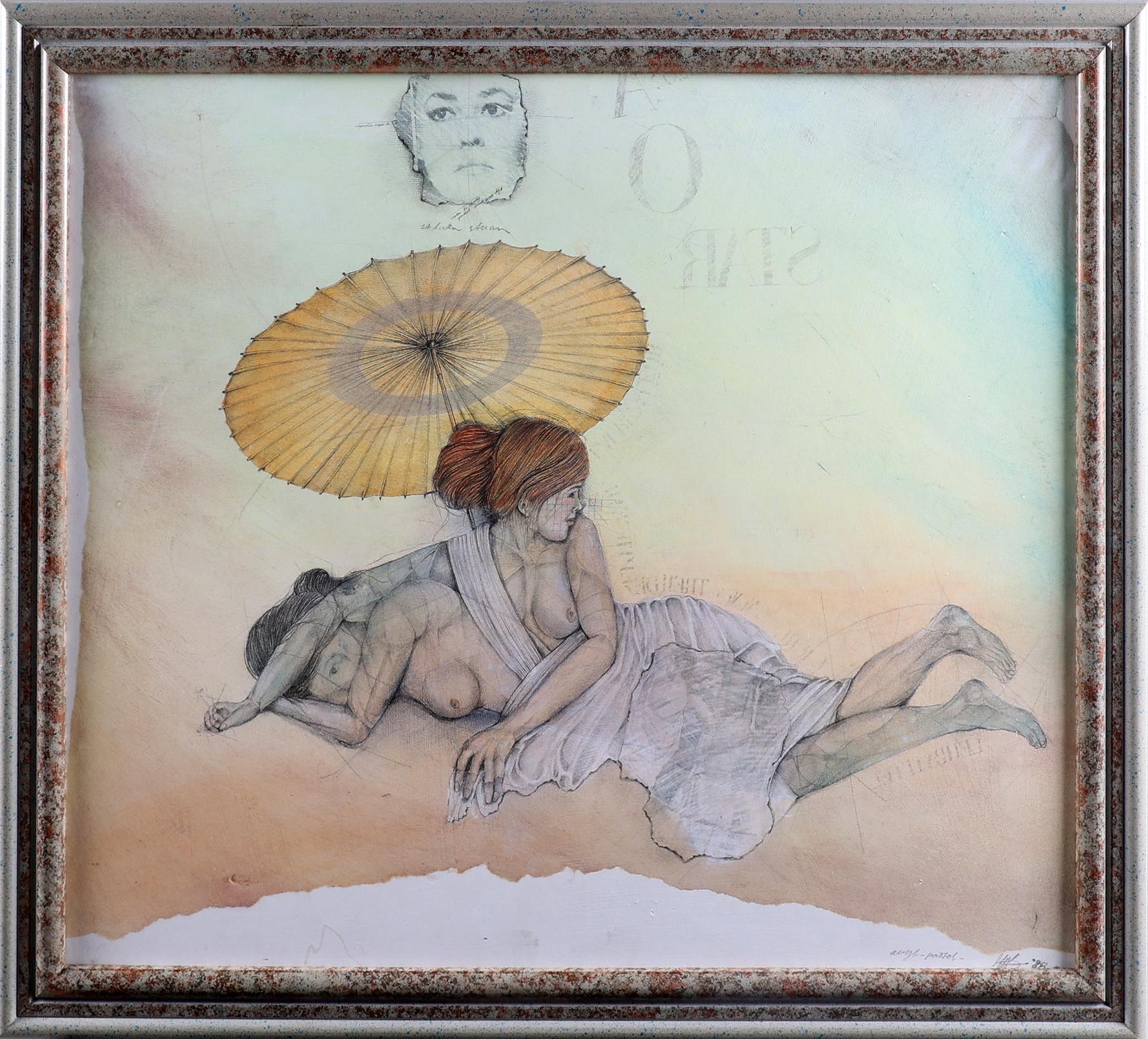 Onb,meester, Twee vrouwen op het strand, acryl/pastel op papier, 50 x 60 cm.