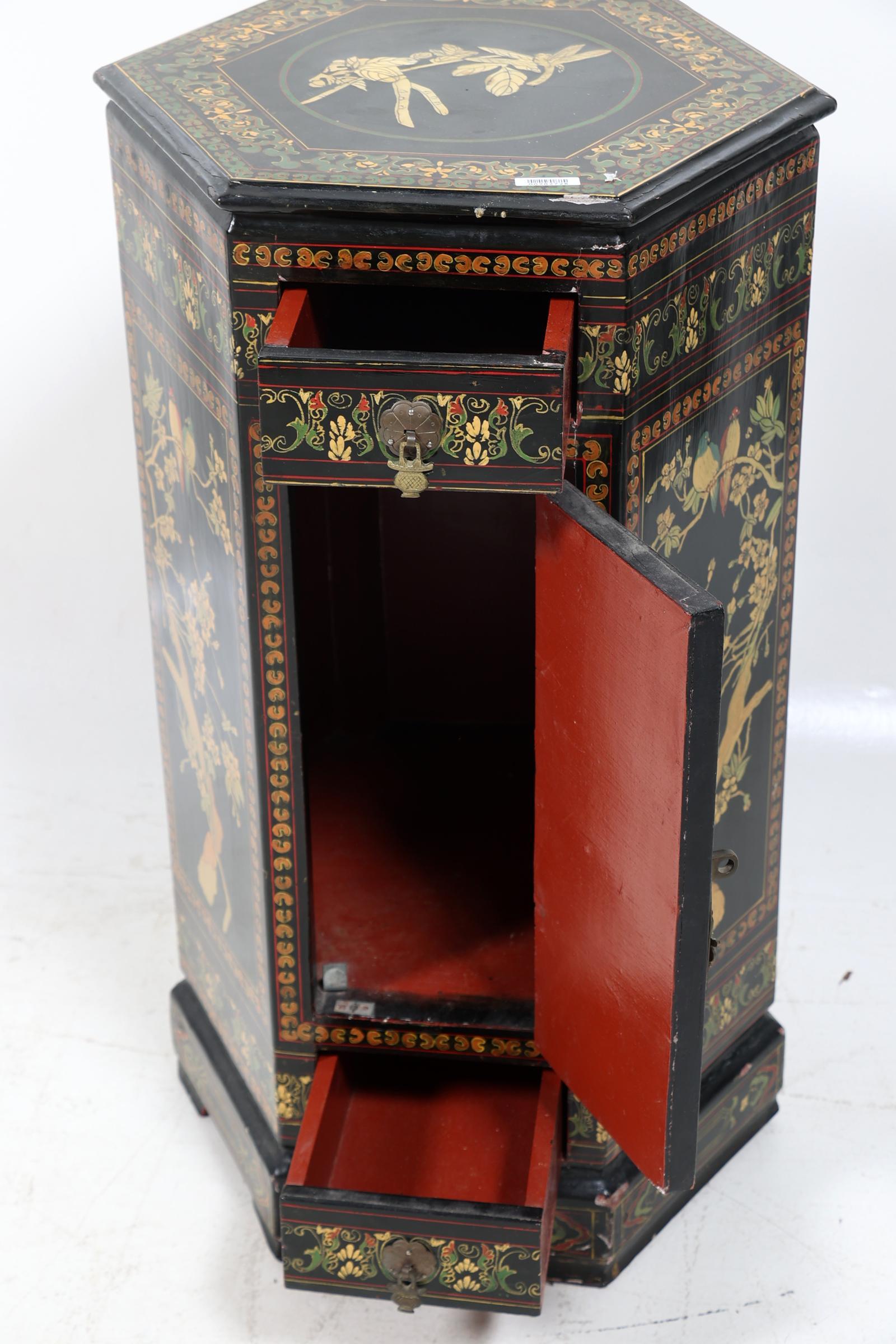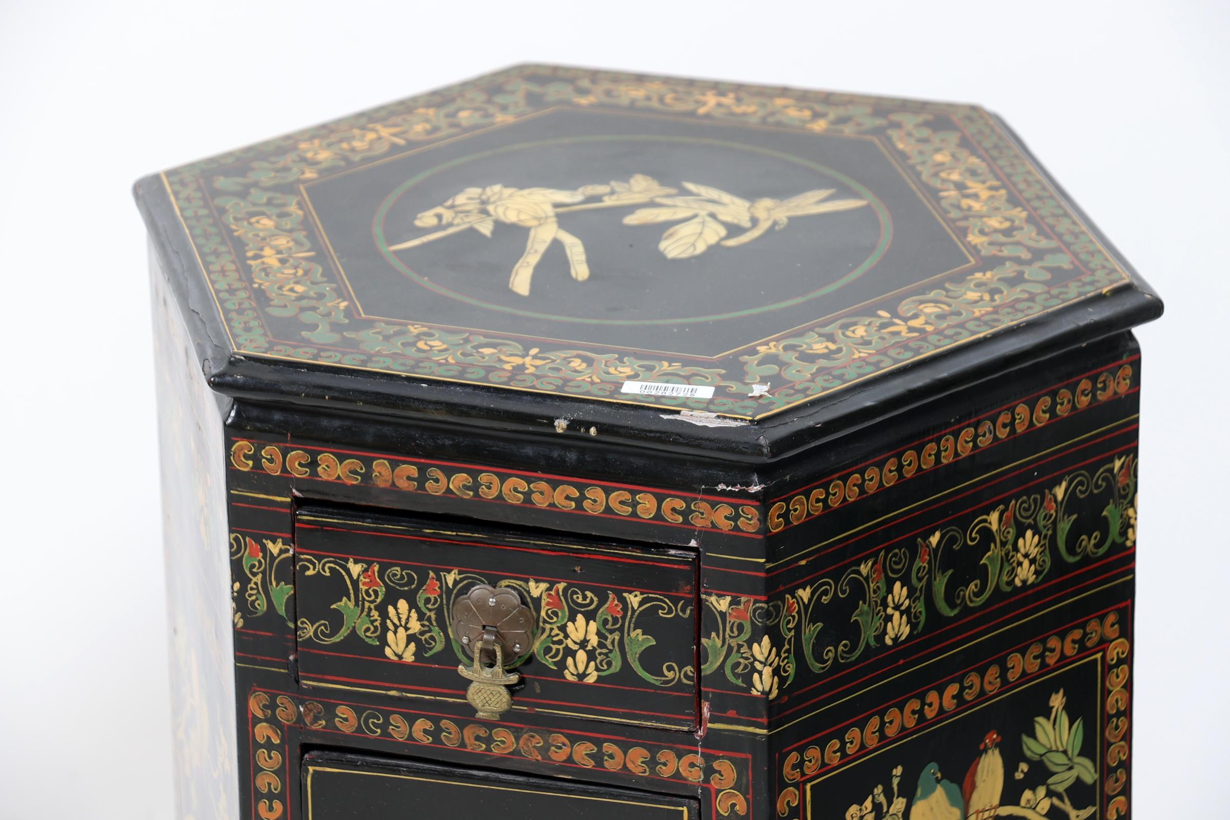 6-Kantige Chinees lakwerk 1-deurs kast, h.73 x b.36 x d.41 cm.