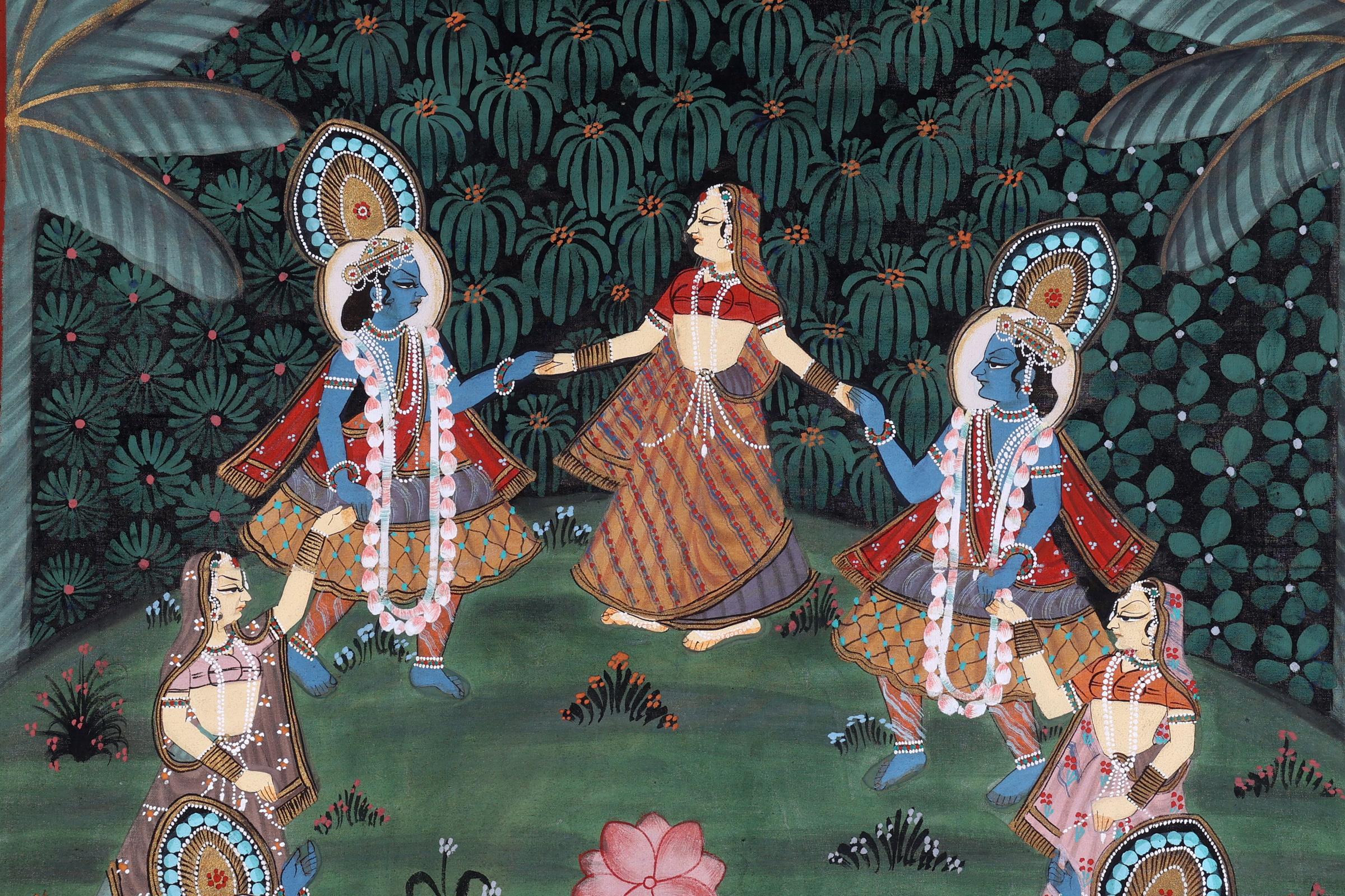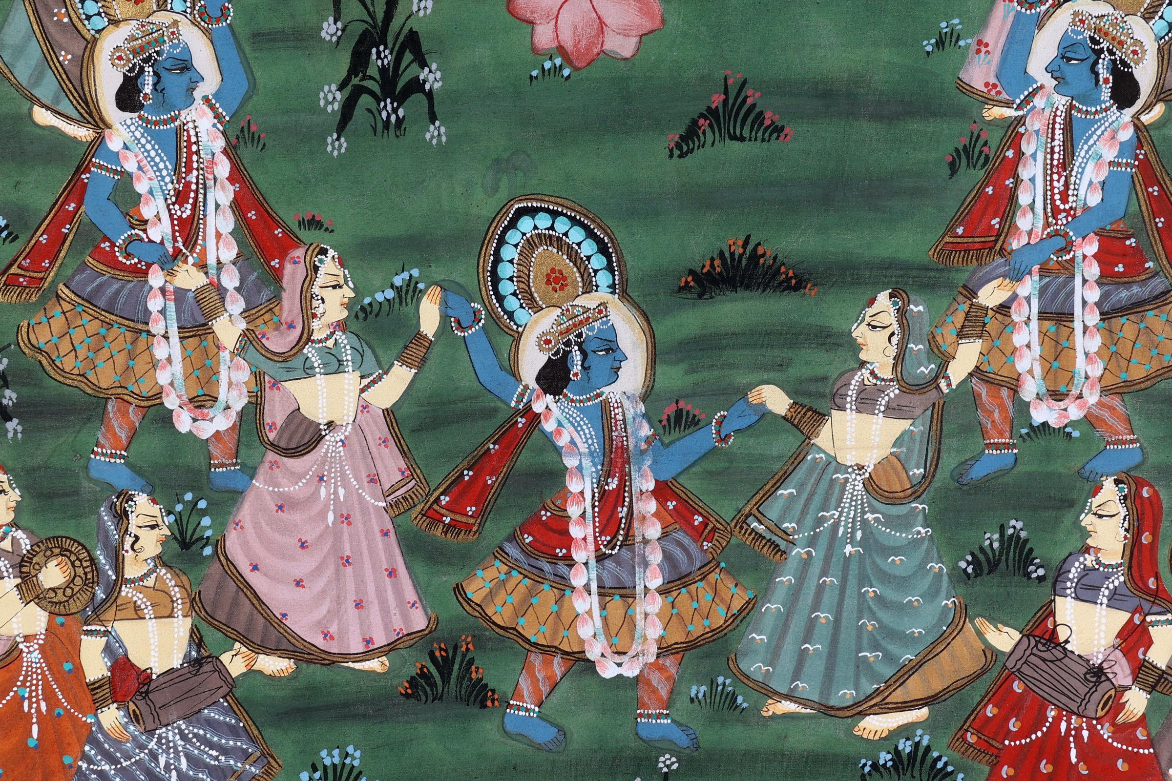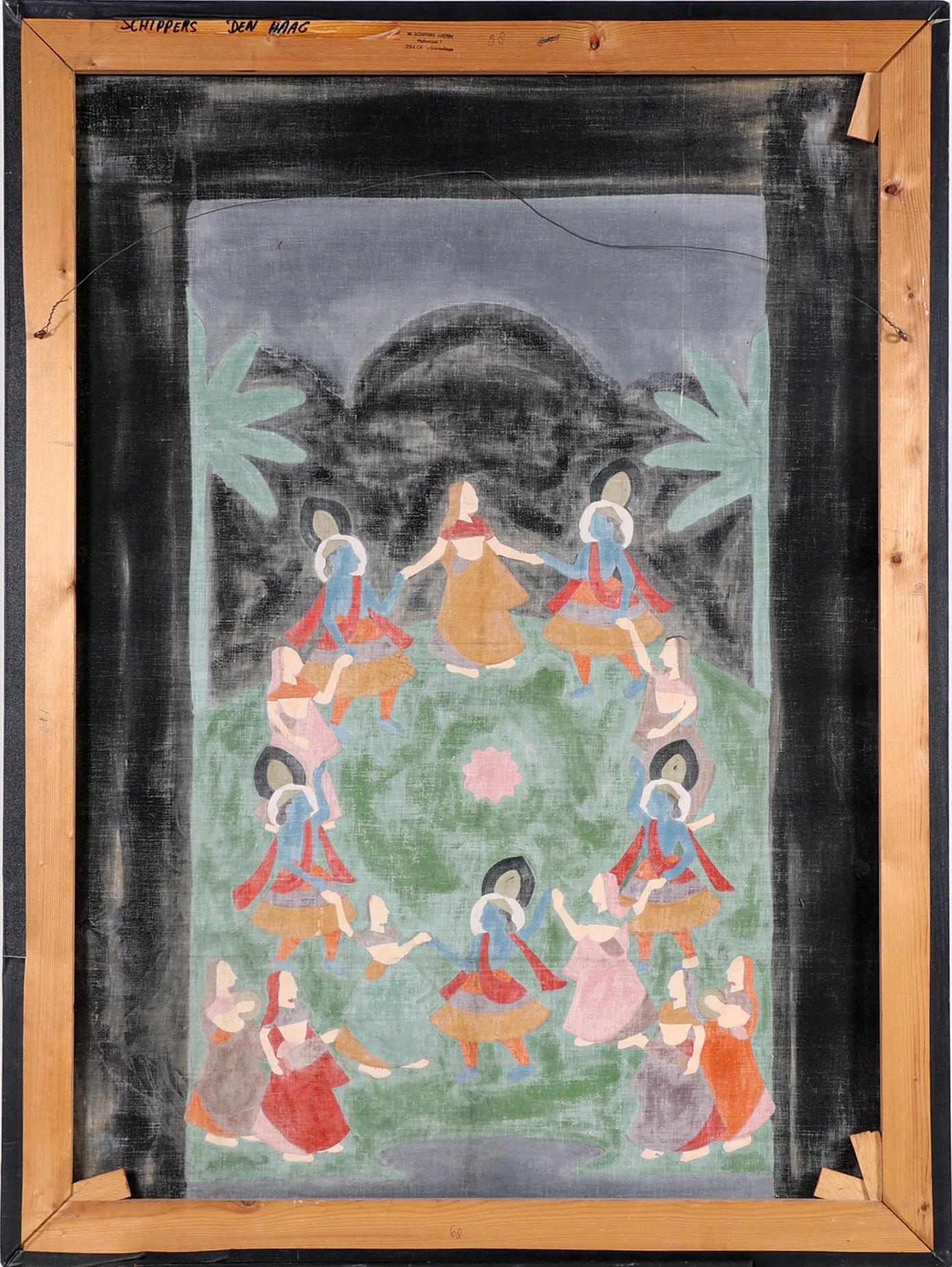 Handgeschilderde Indiase voorstelling op doek van personen dansend in landschap, 120 x 89 cm.