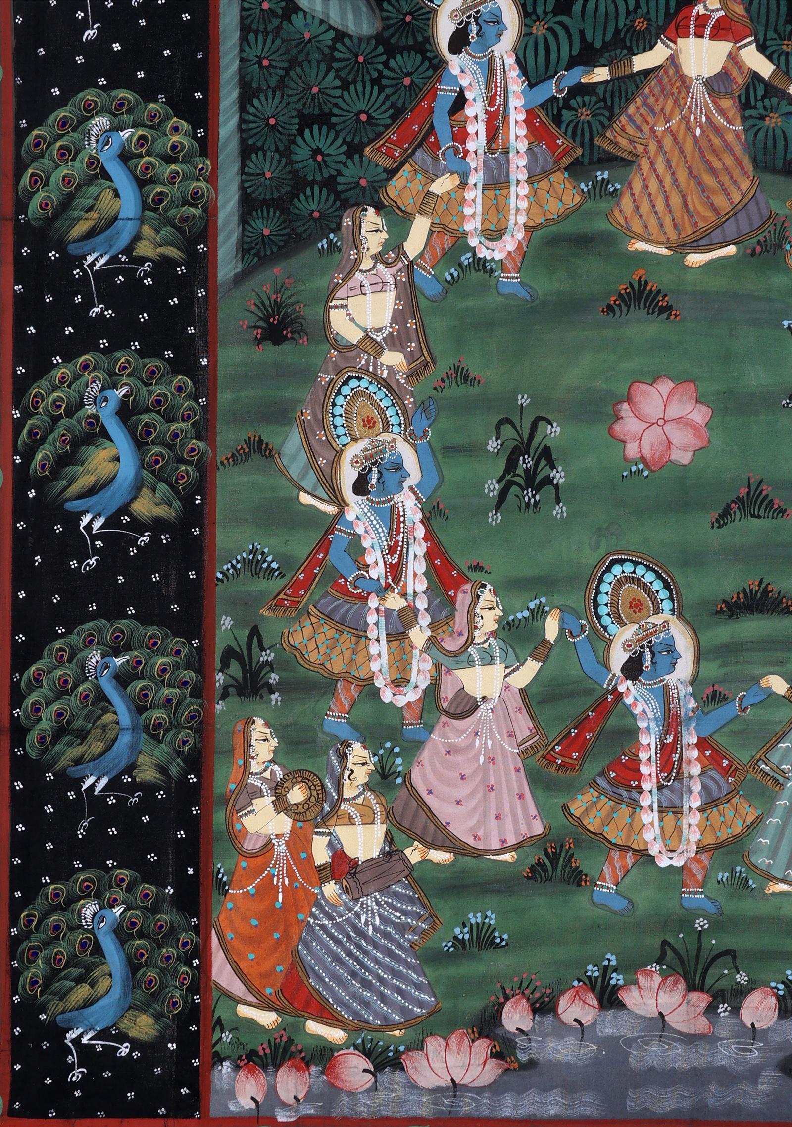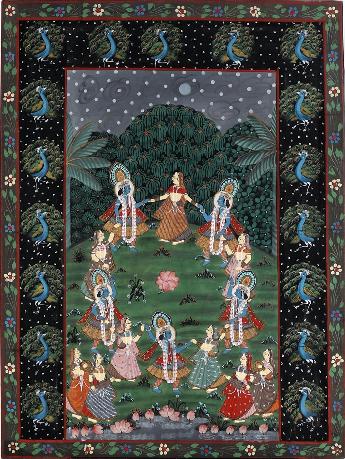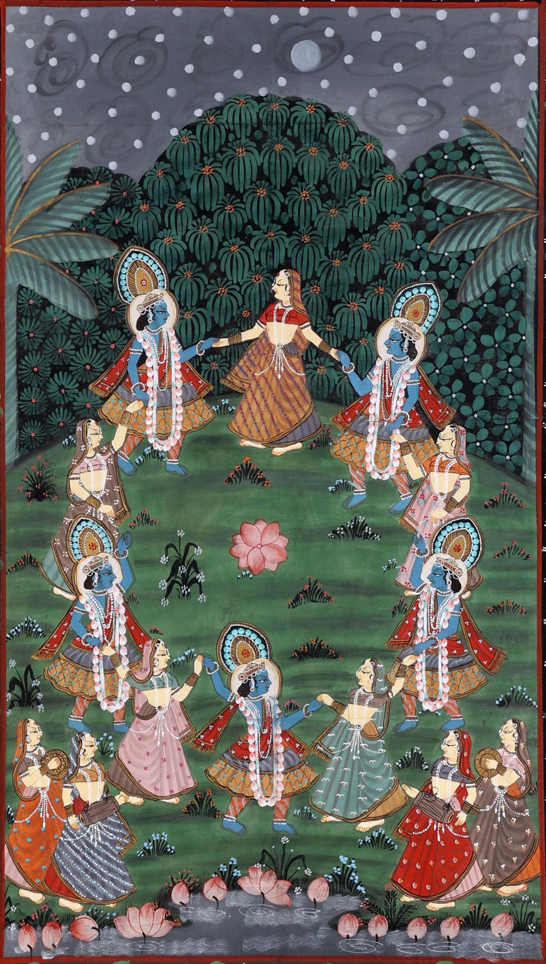 Handgeschilderde Indiase voorstelling op doek van personen dansend in landschap, 120 x 89 cm.