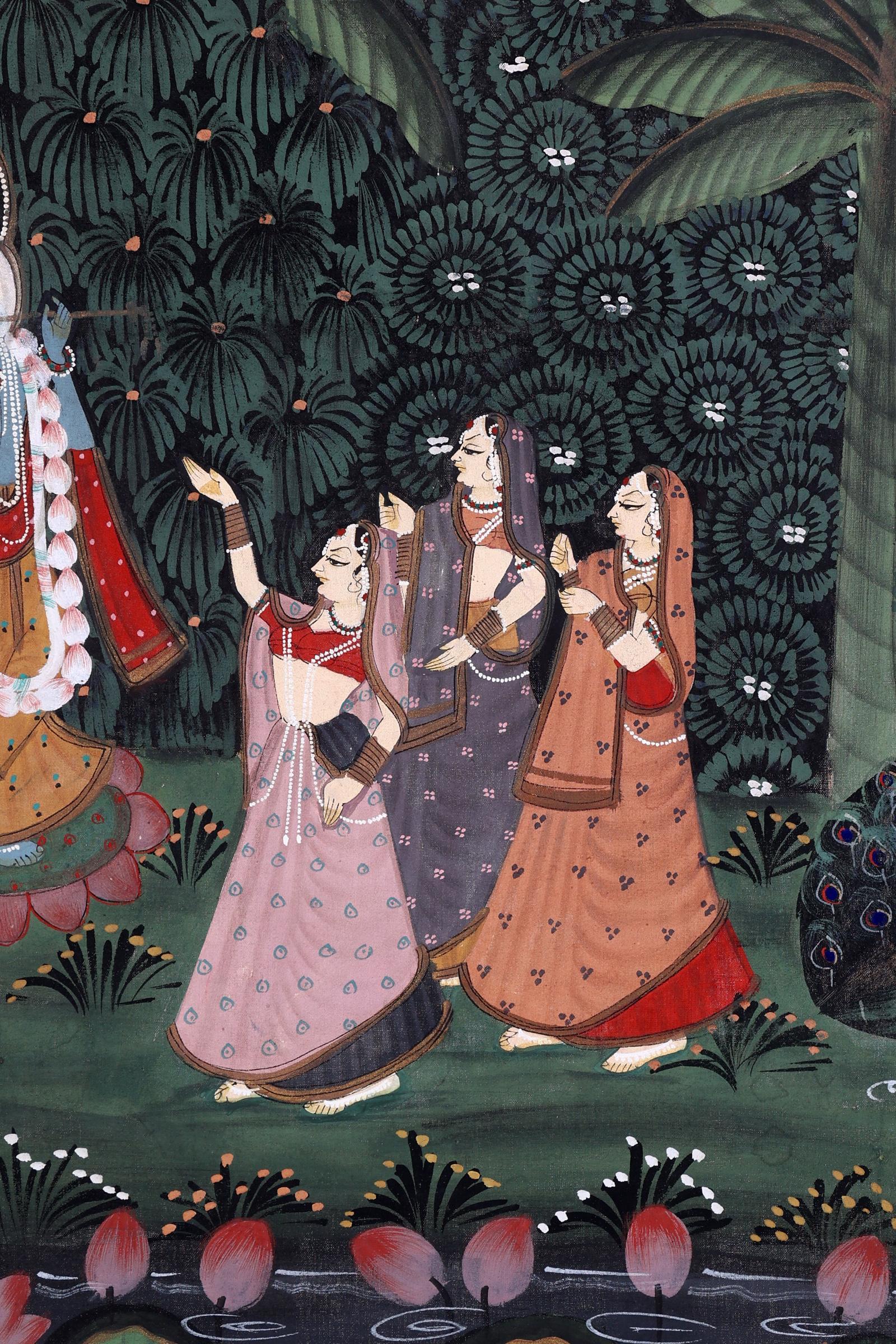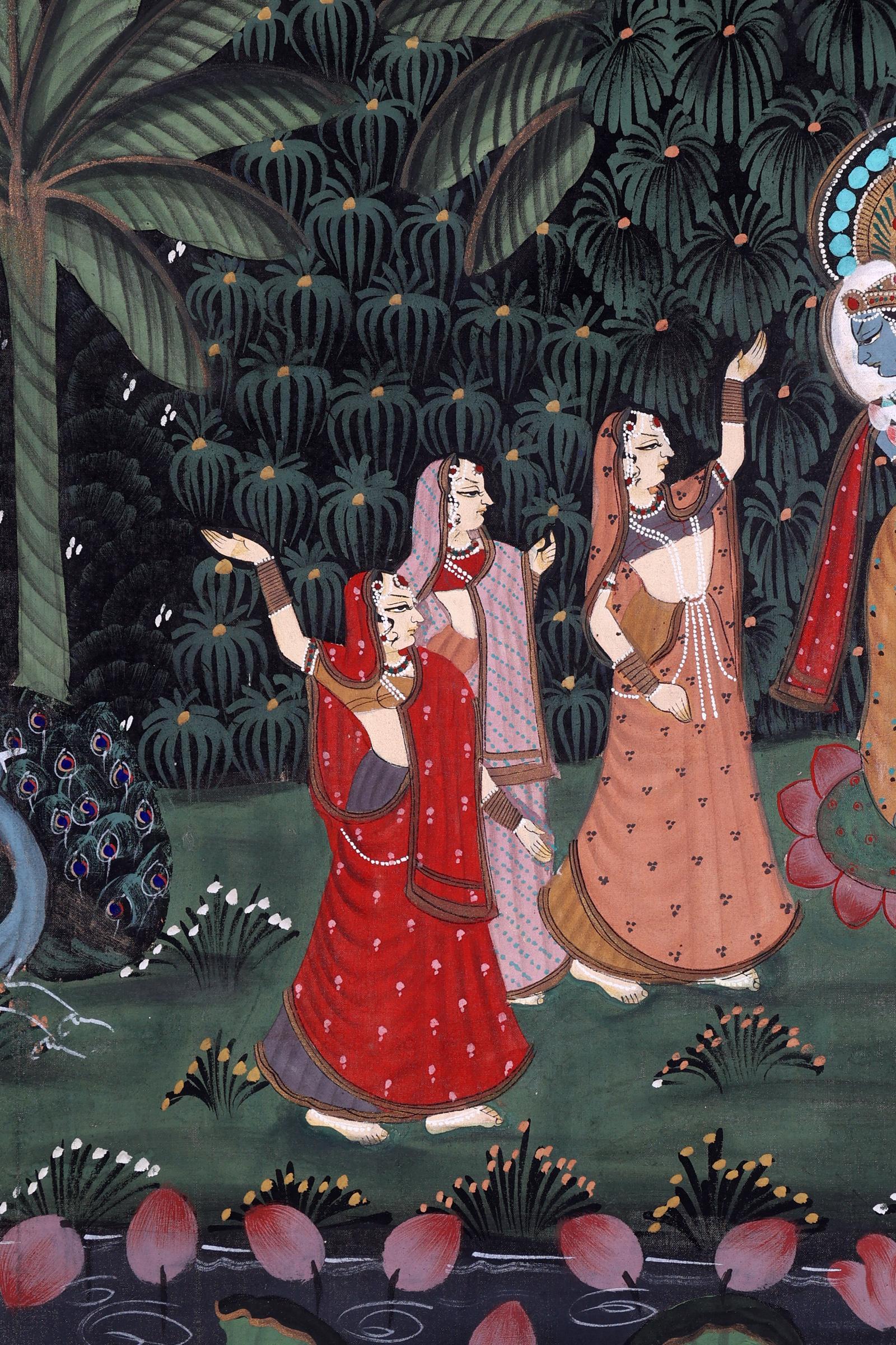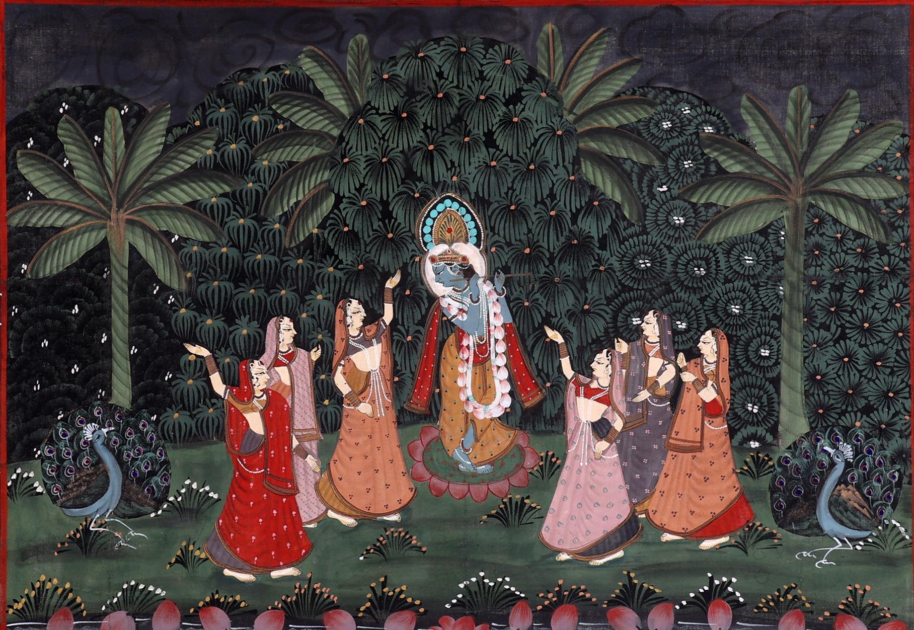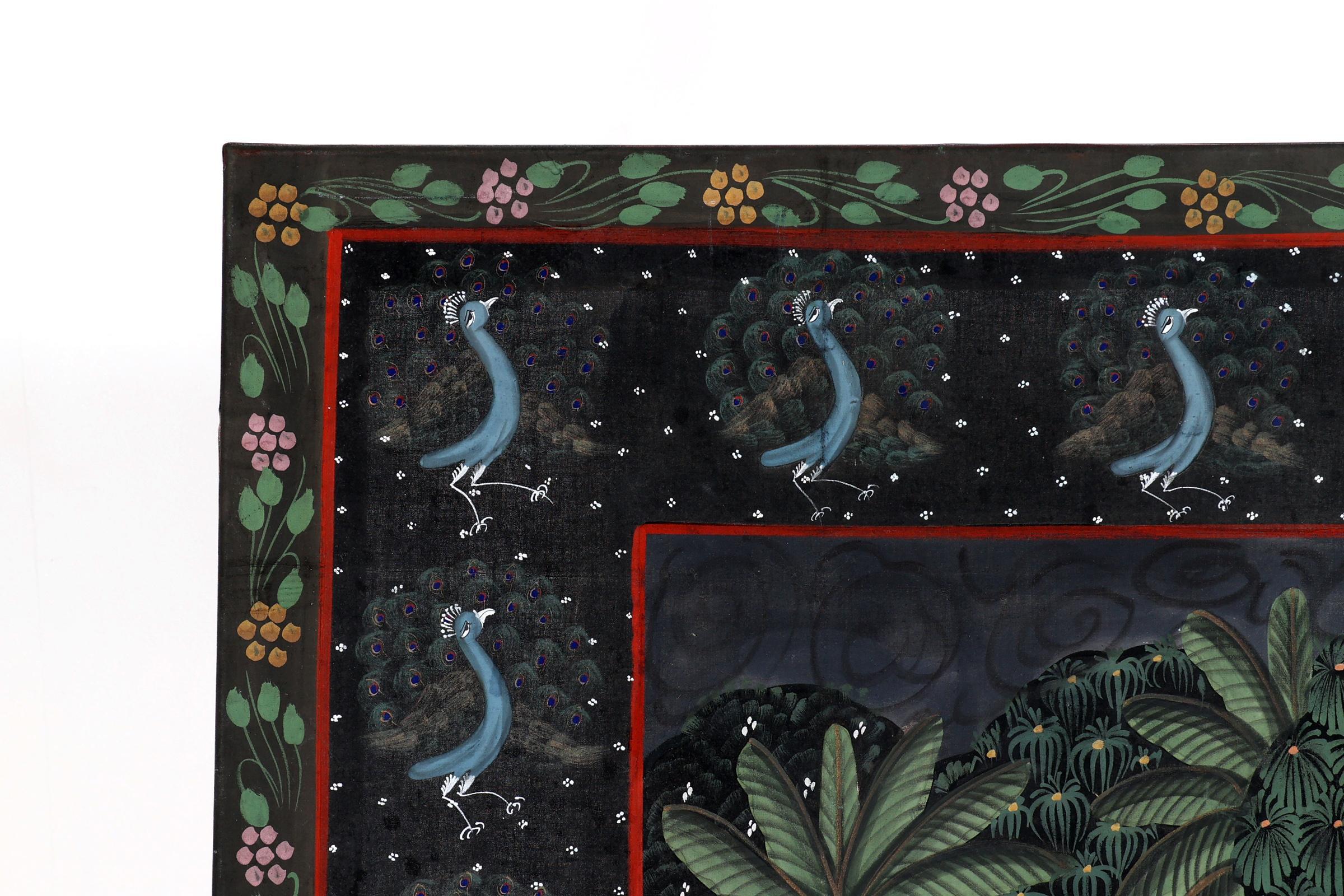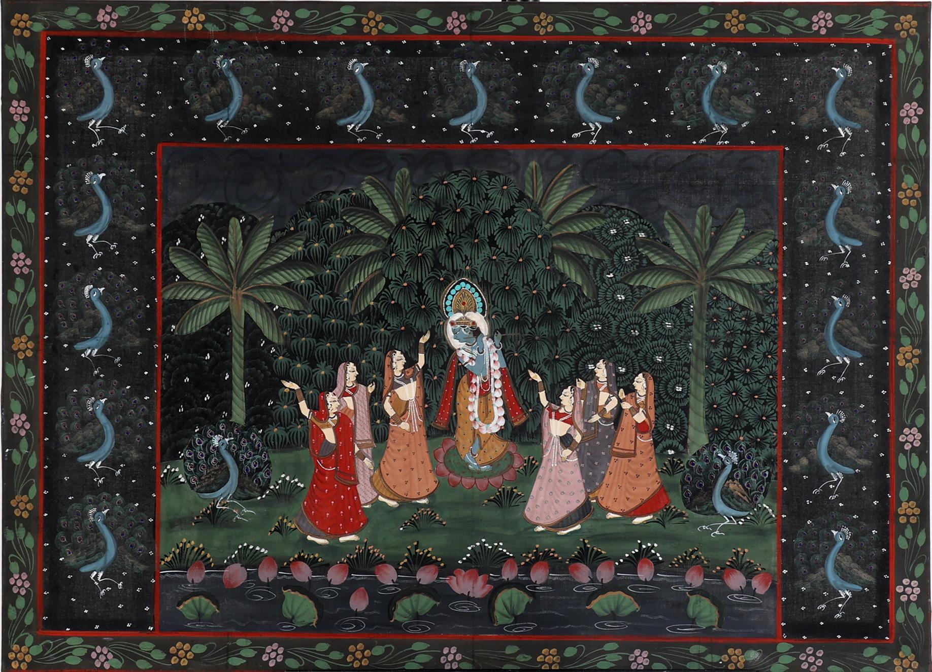 Handgeschilderde Indiase voorstelling op doek van personen dansend in landschap, 84 x 114 cm.