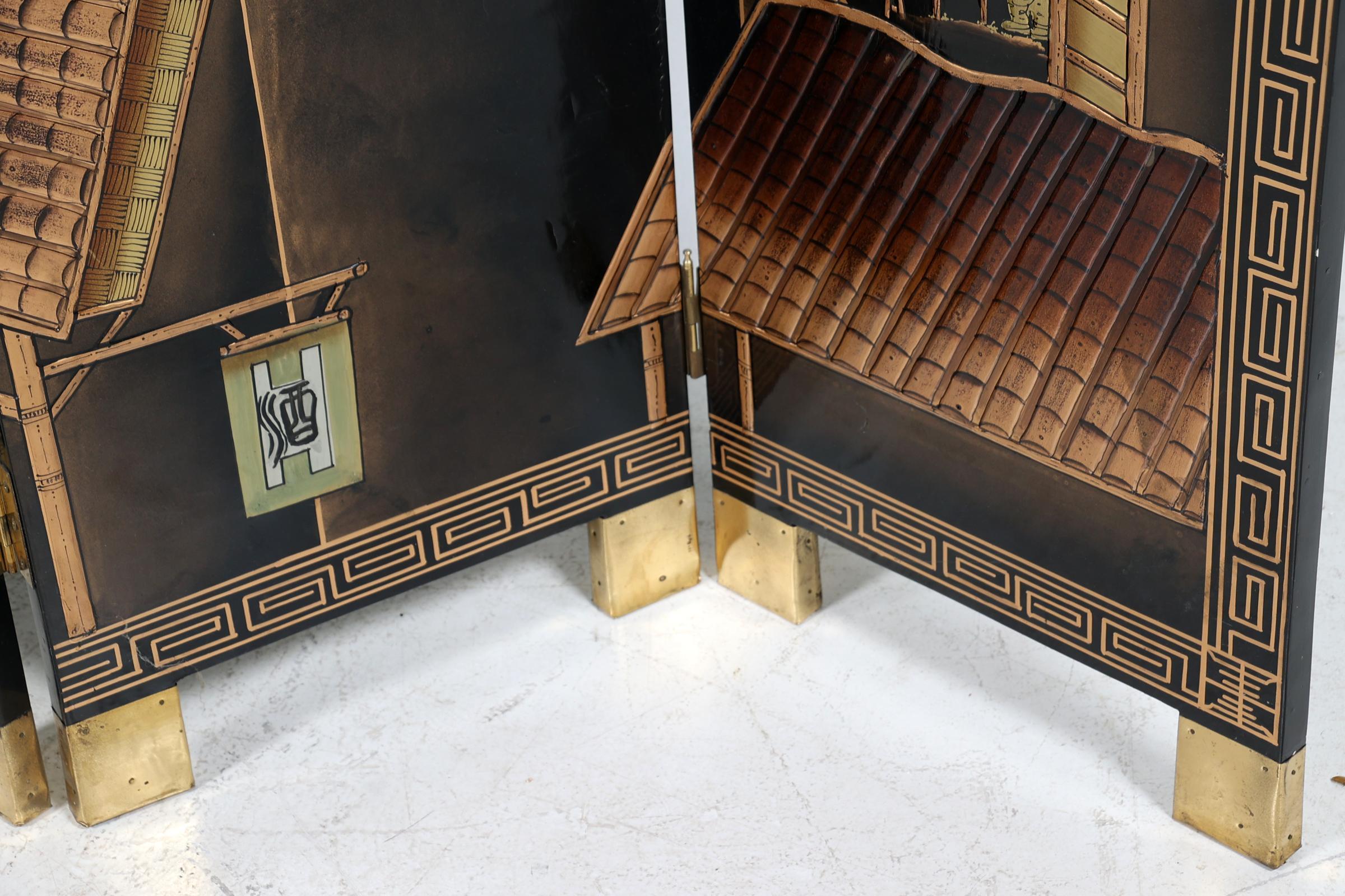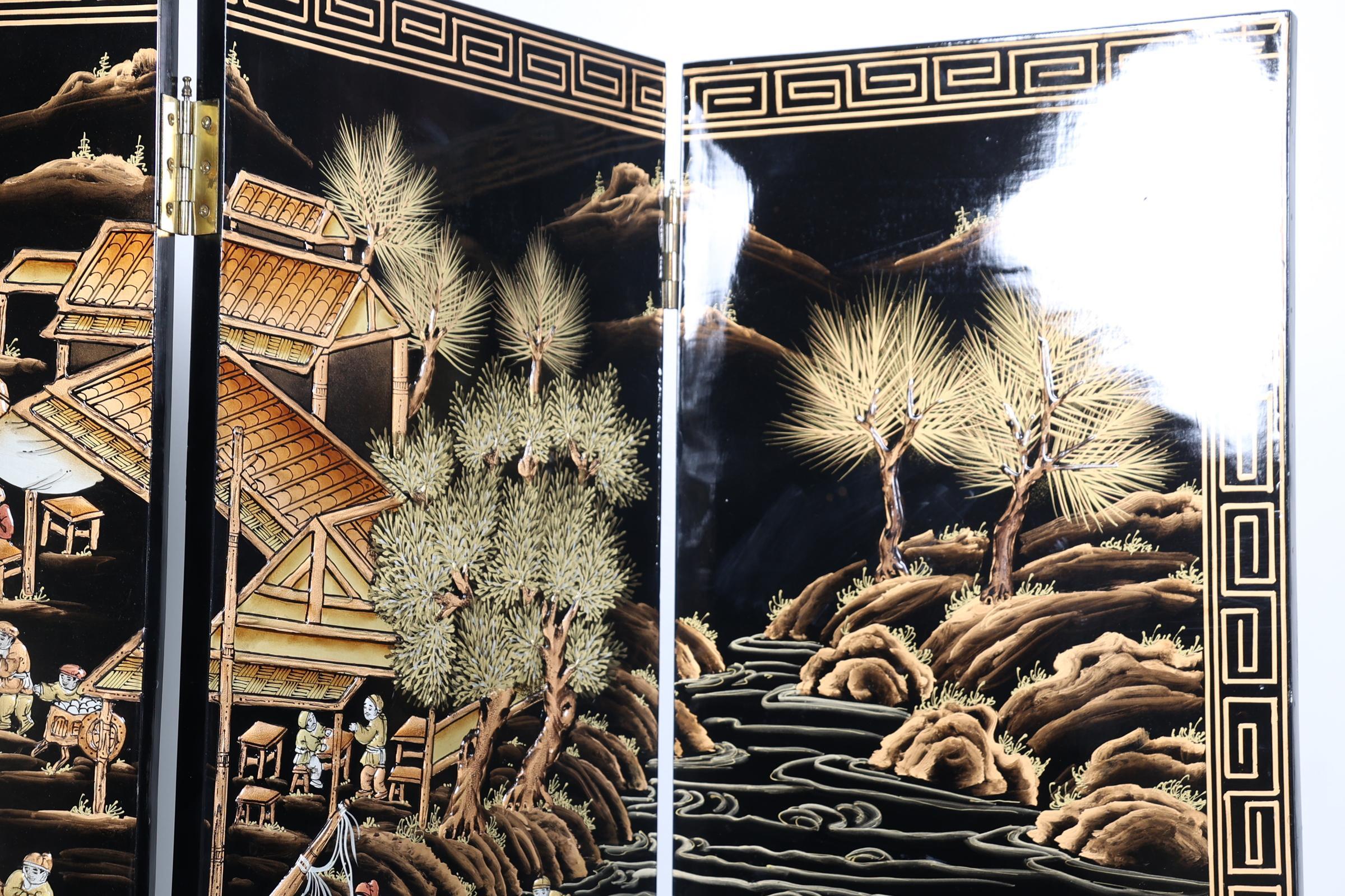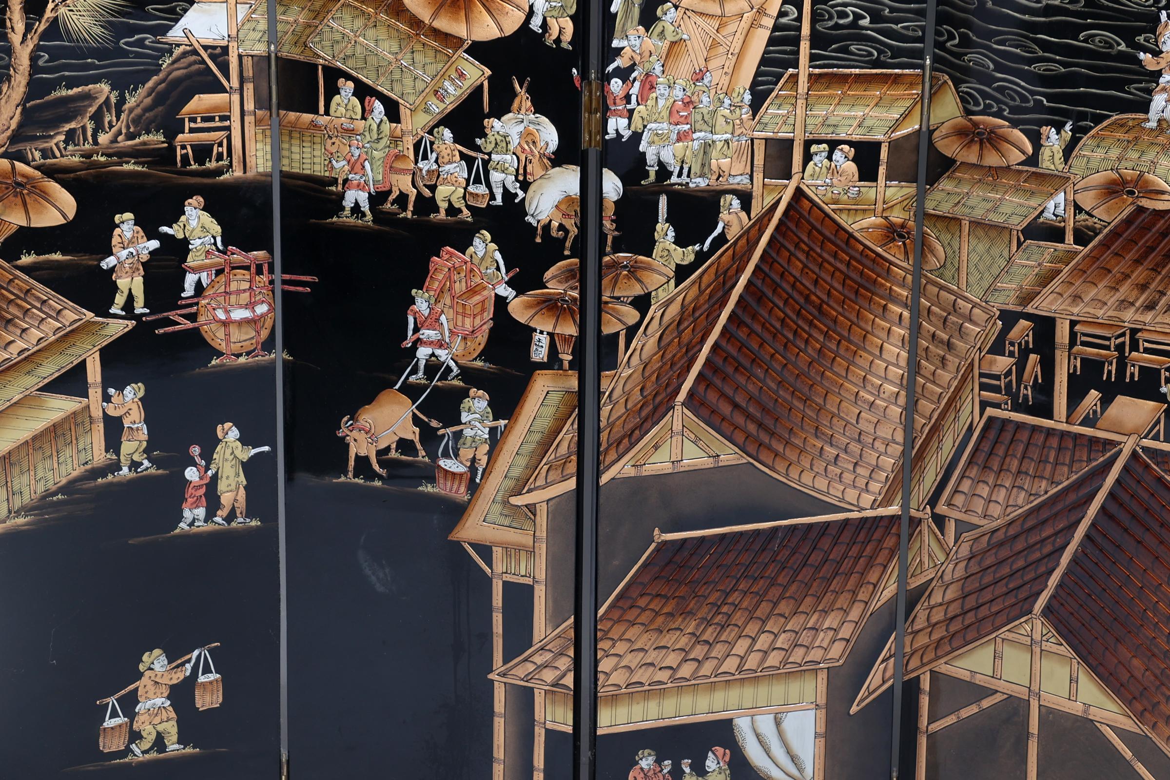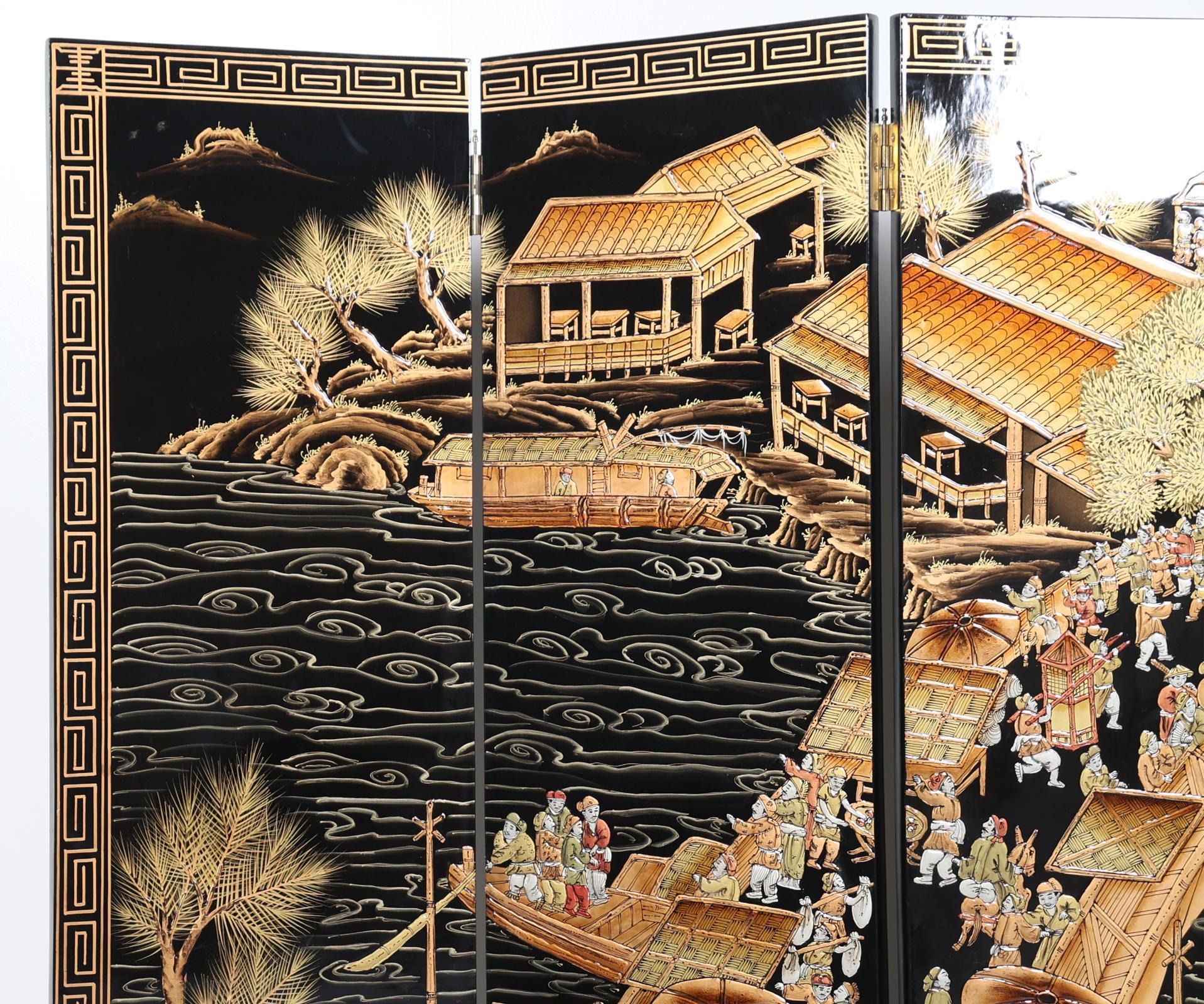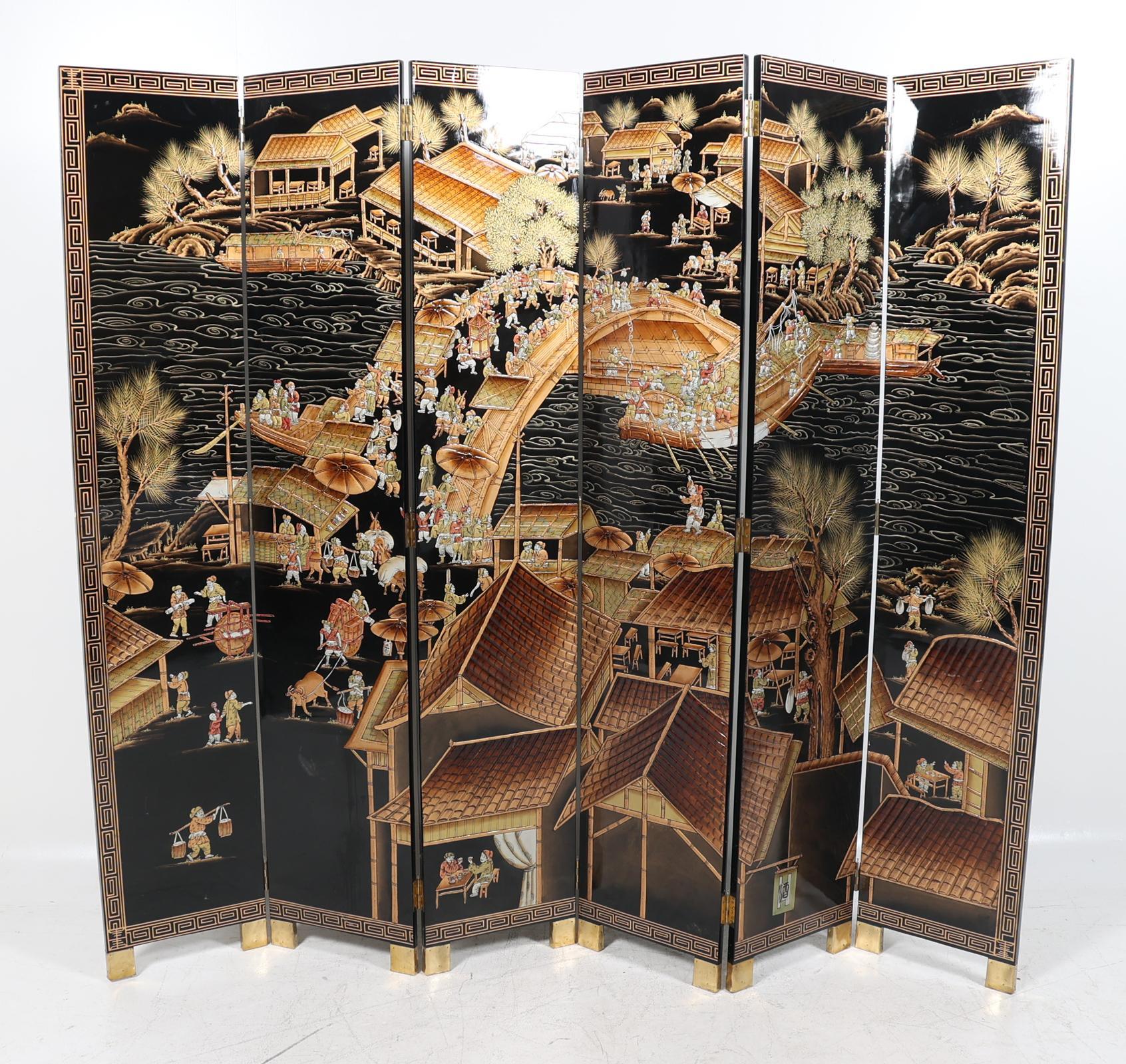 Chinees lakwerk 6-slag kamerscherm met voorstelling van personen in dorpen langs het water, h.213 x b.240 cm.