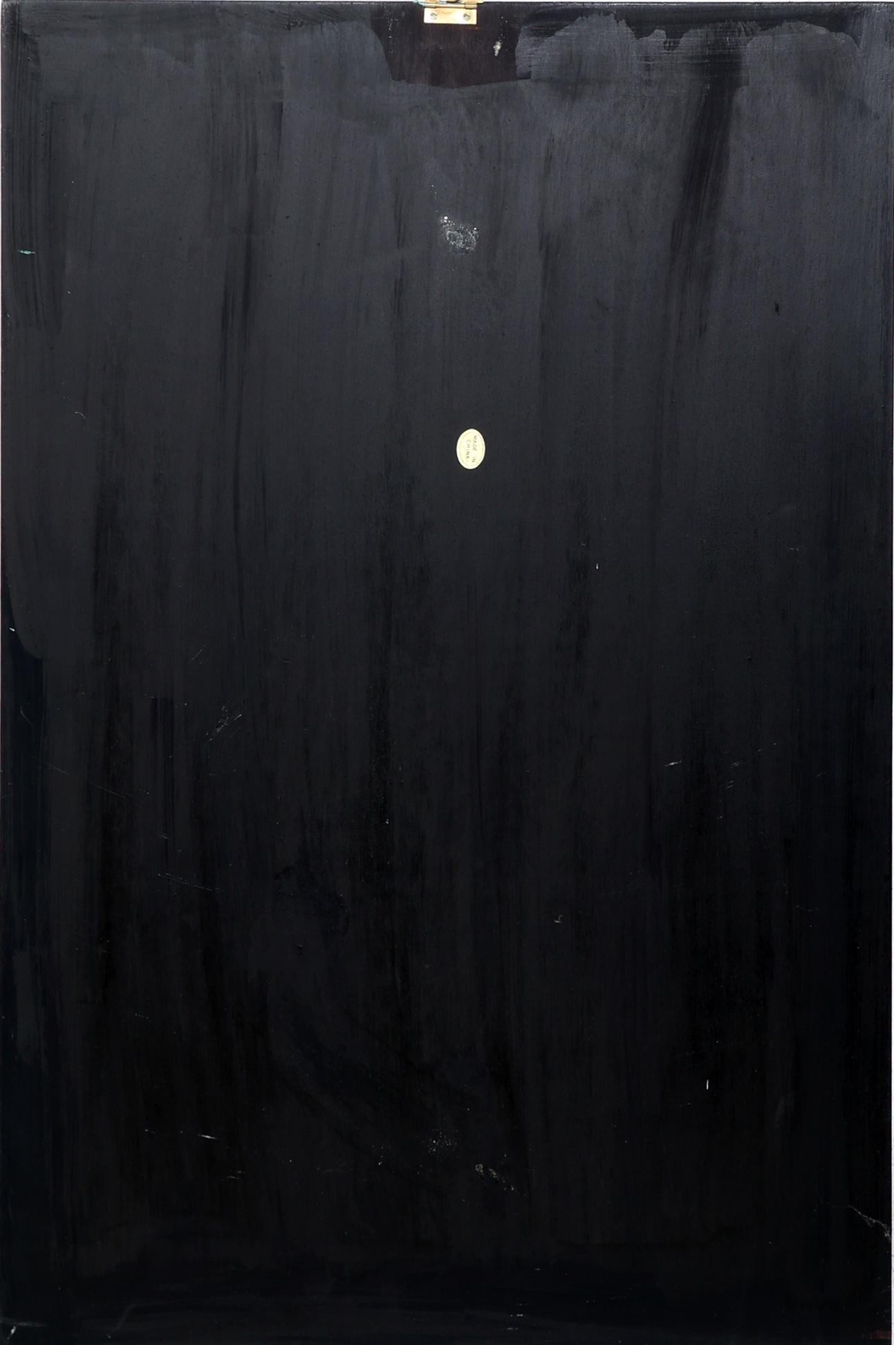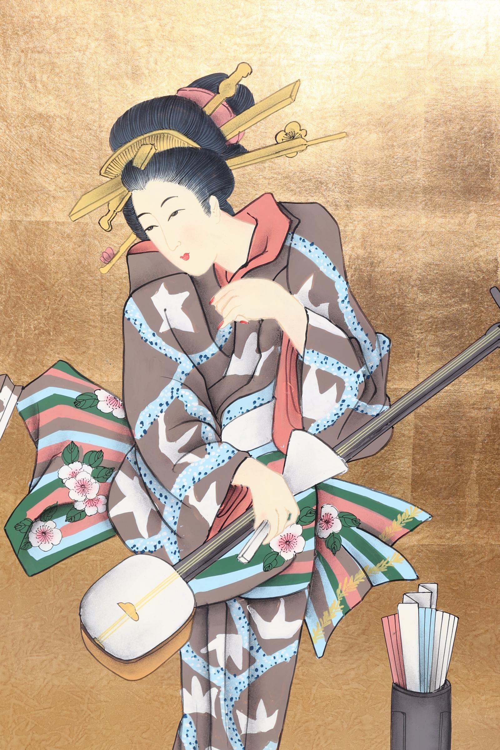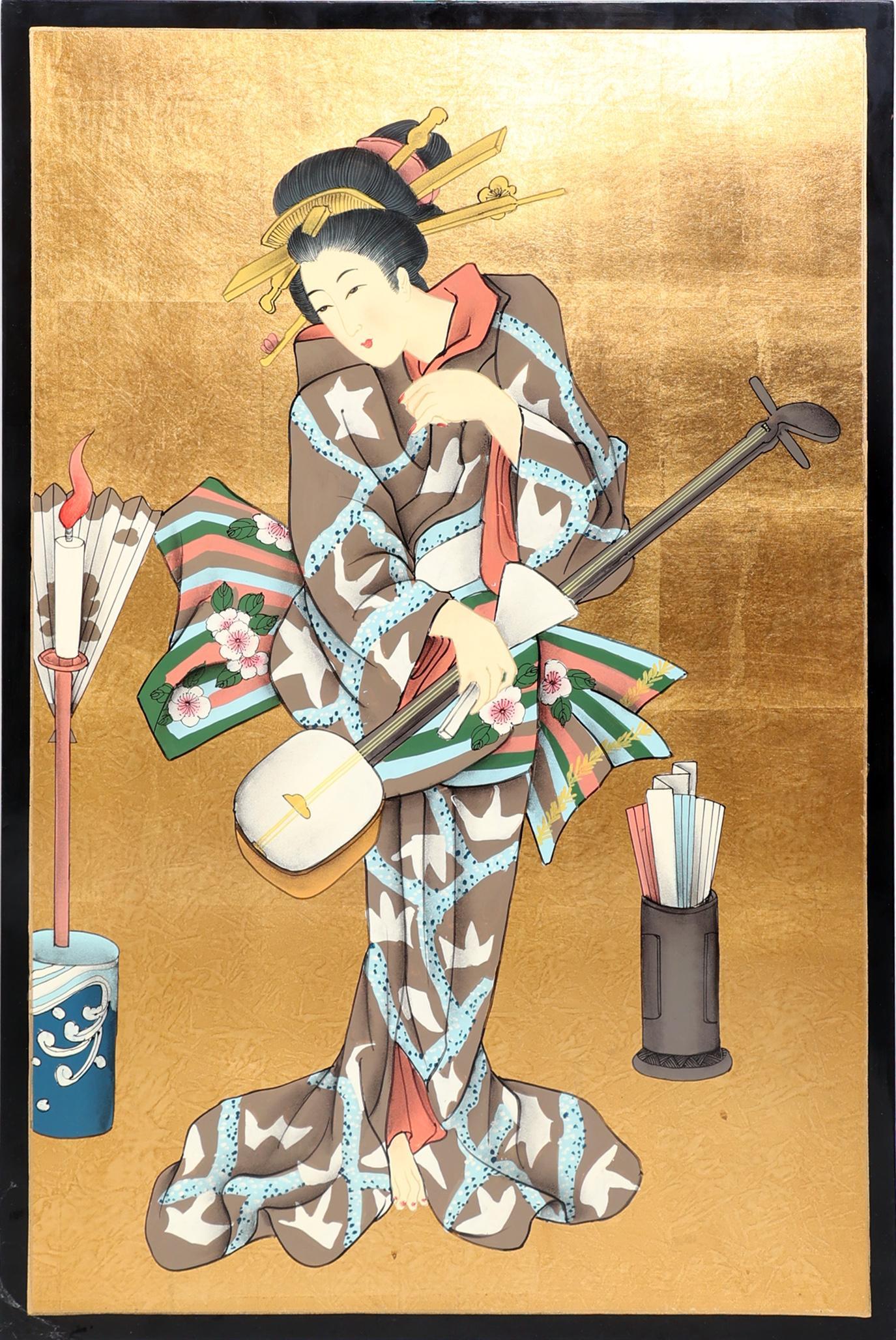 Lakwerk paneel met voorstelling van een dame met muziekinstrument, 91 x 60 cm.