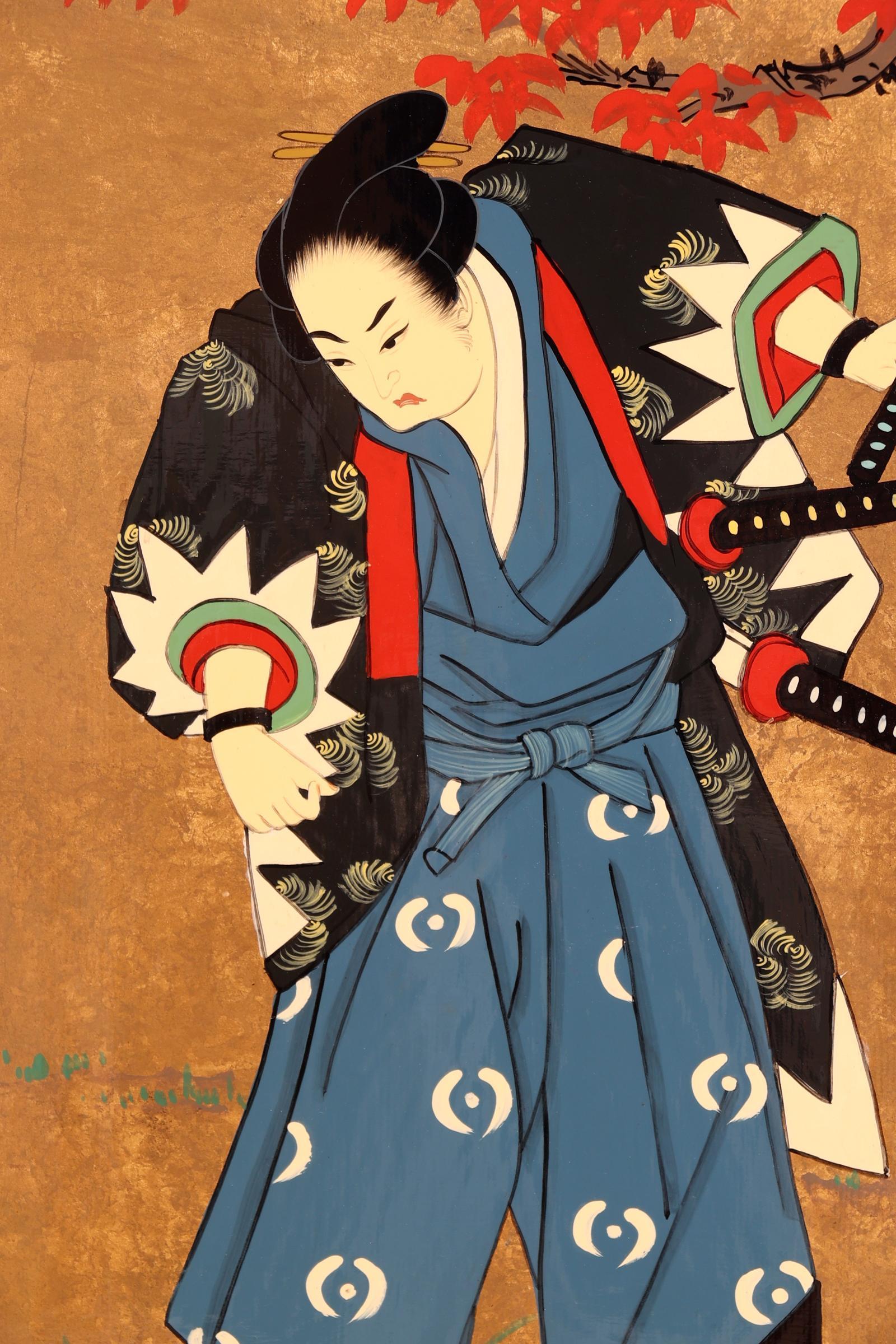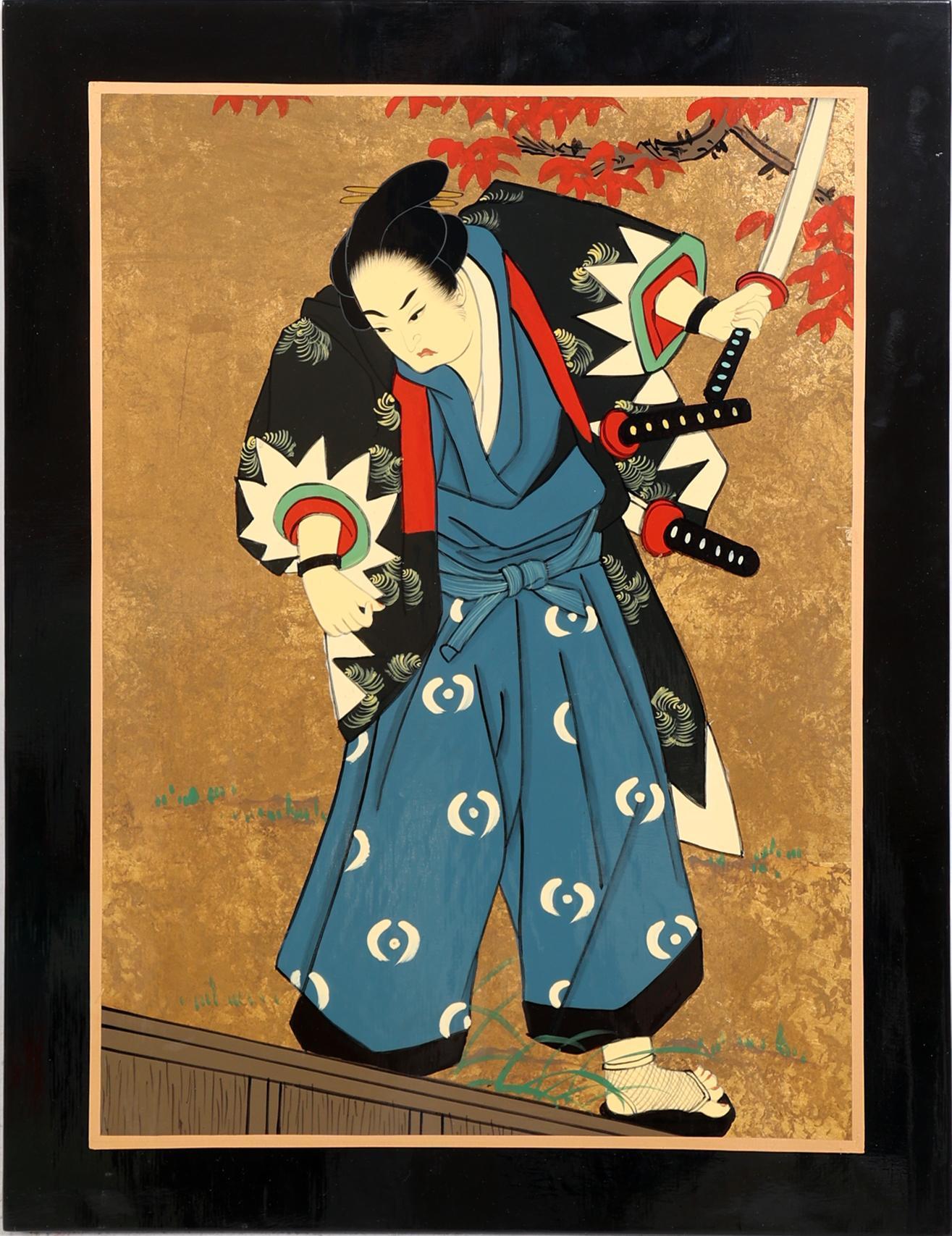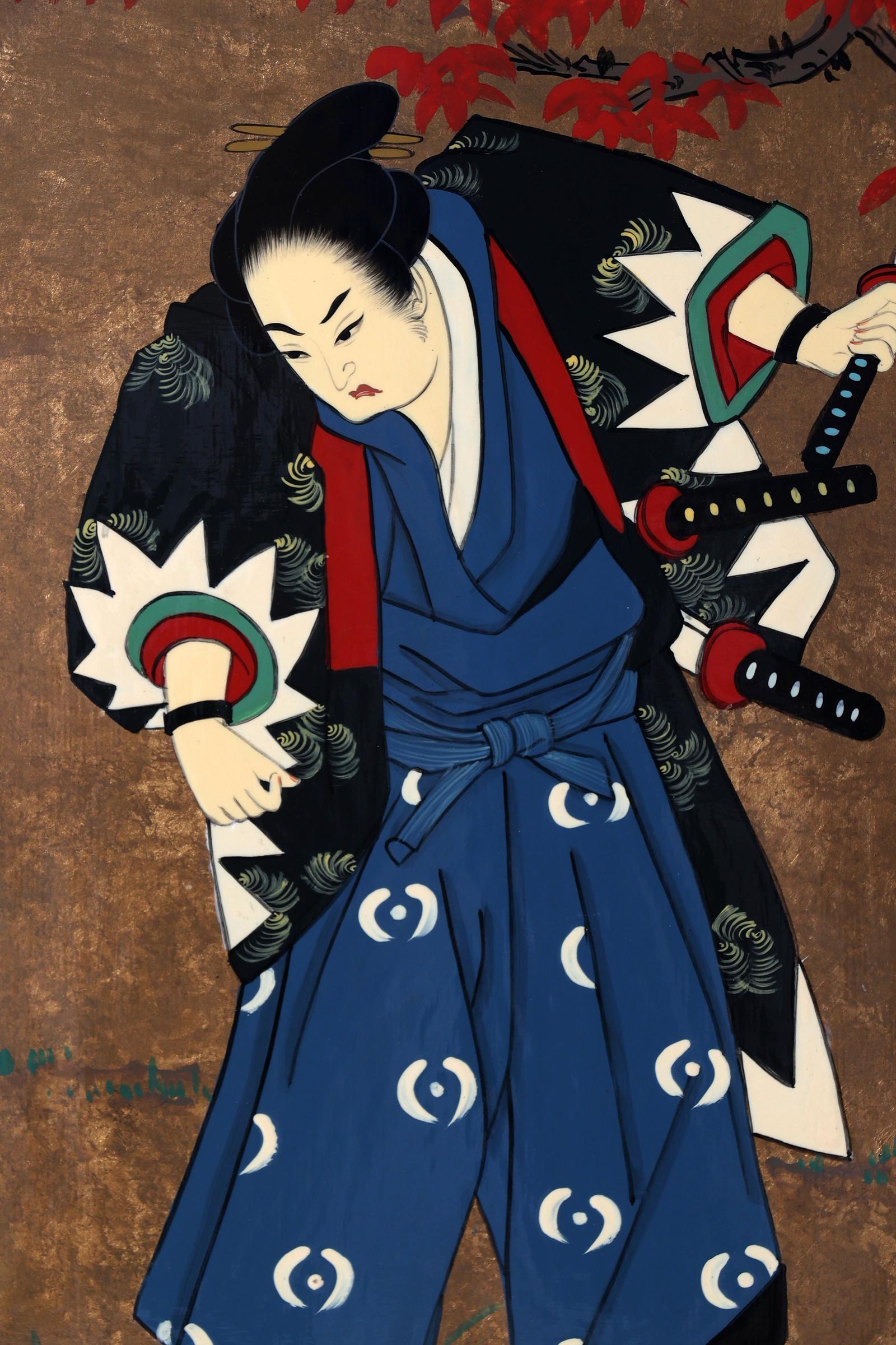 Lakwerk paneel met voorstelling van een Samurai, 61 x 46 cm.