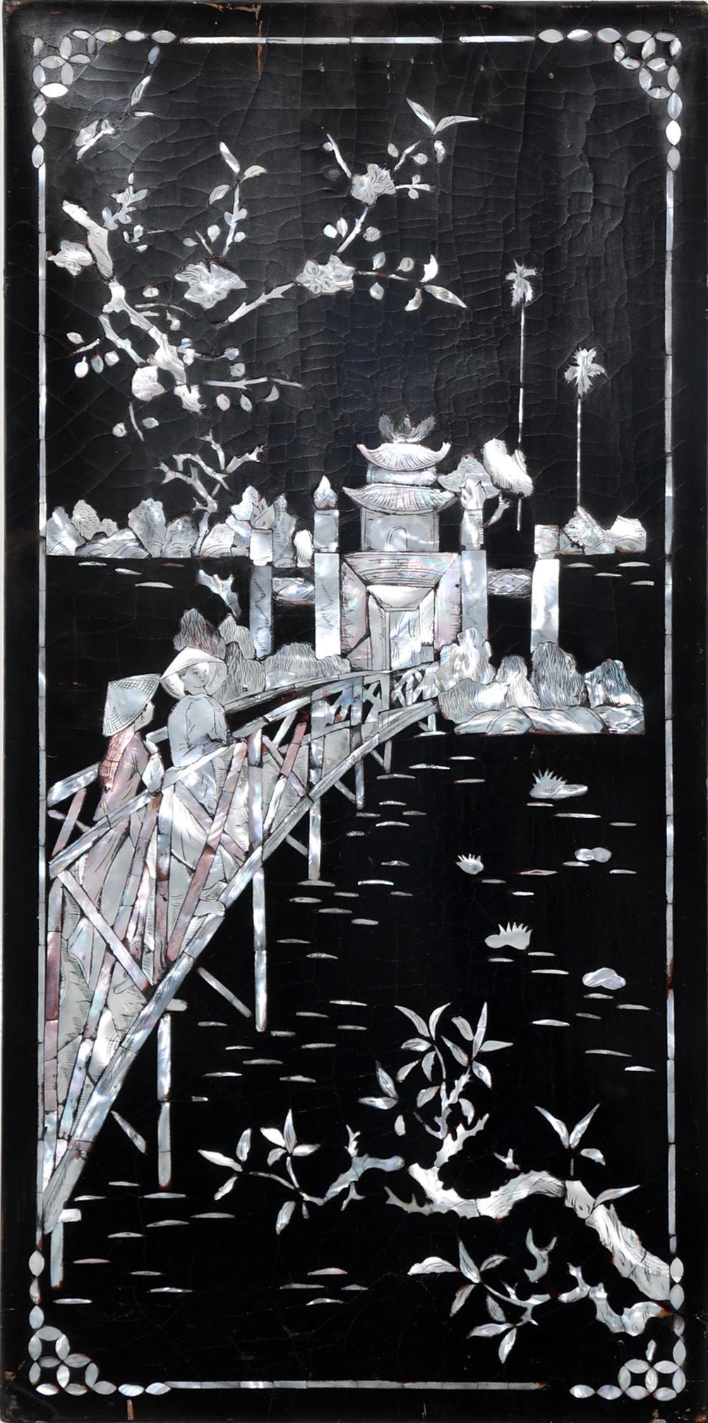 Lakwerk paneel met parelmoer inlegwerk, 60 x 30 cm.