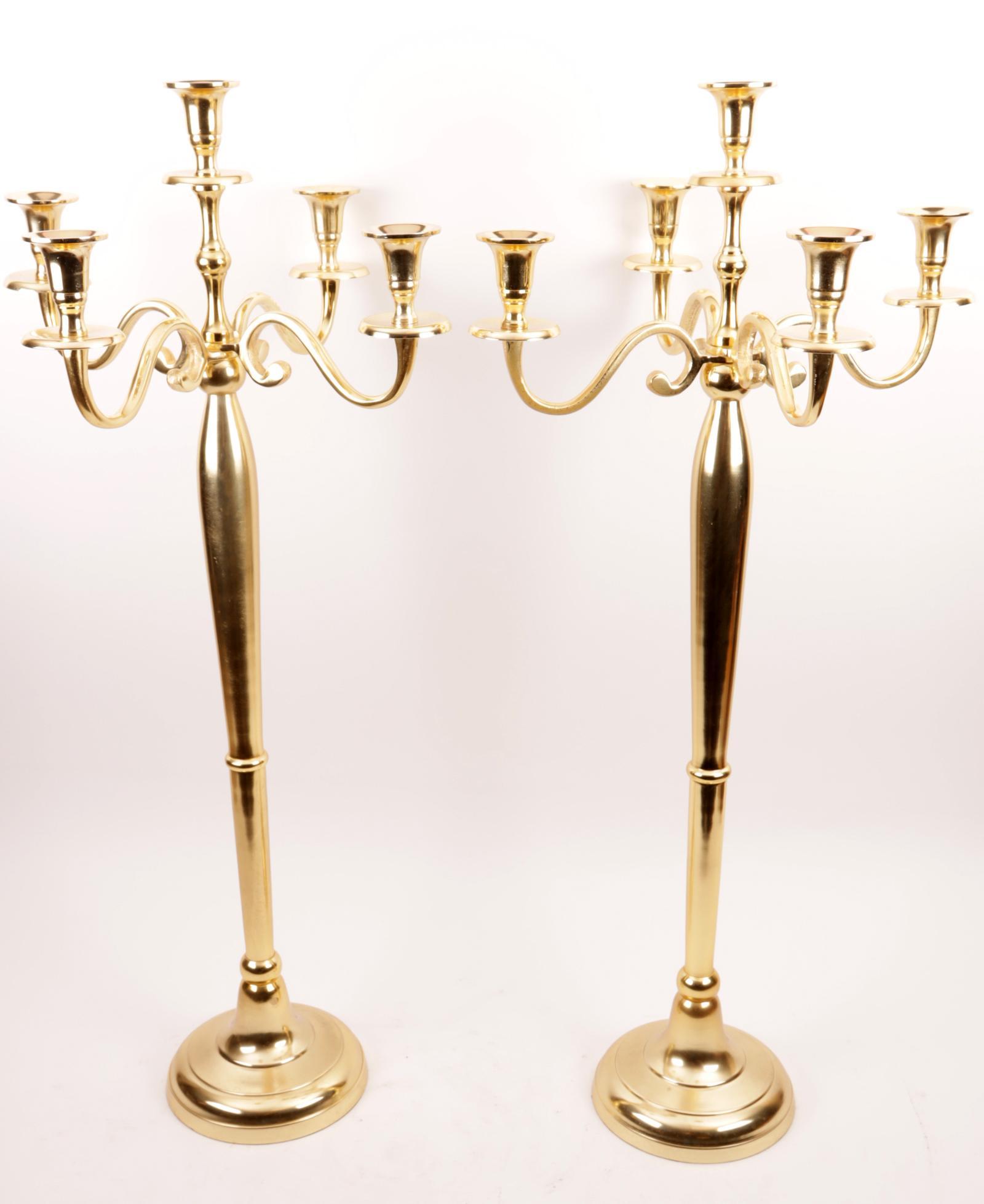 Stel goudkleurige metalen 5-lichts kandelaars, h.80 cm.