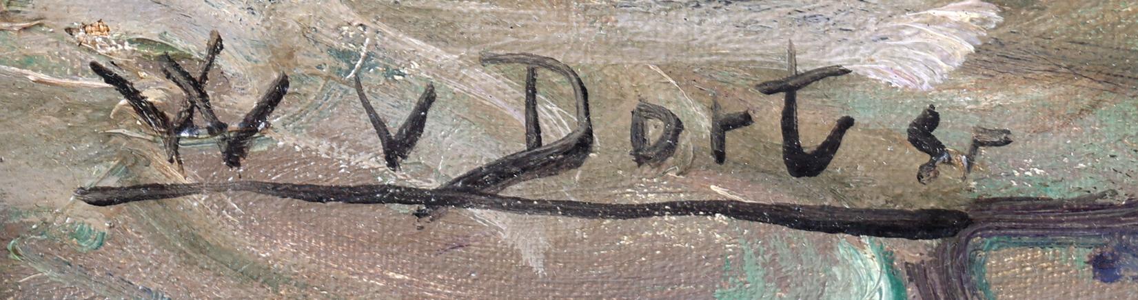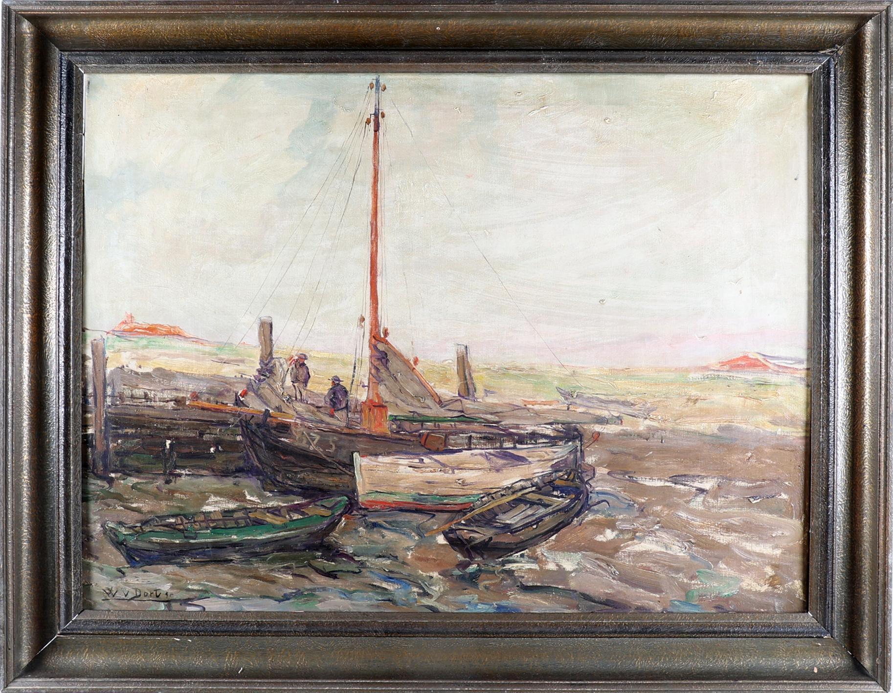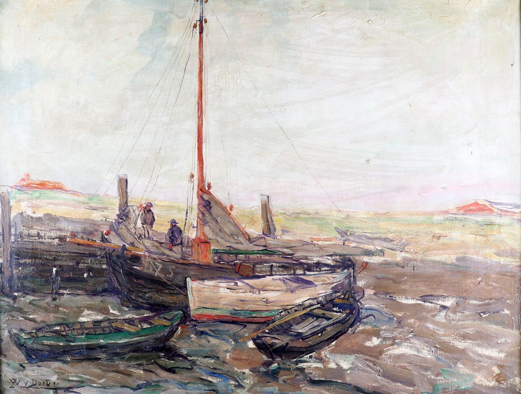 Willem van Dort (1875-1949), Afgemeerde boten langs de kust, olieverf op doek, 70 x 90 cm.