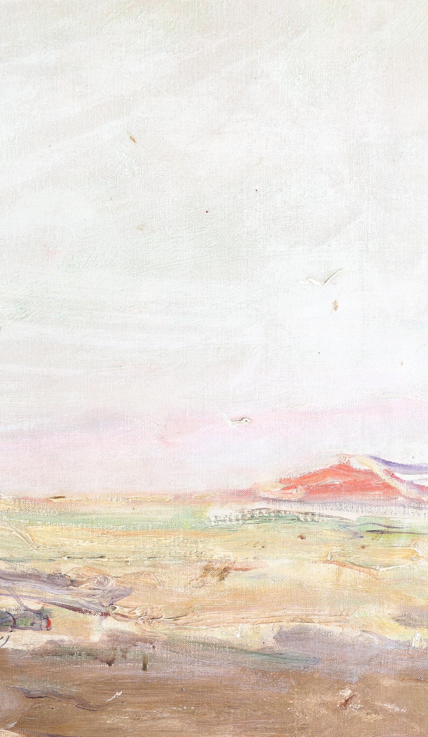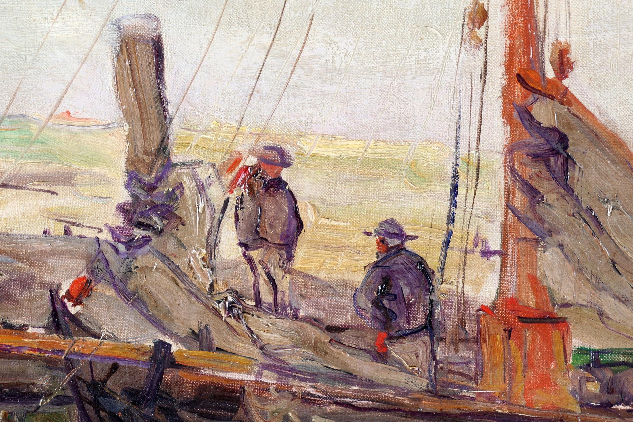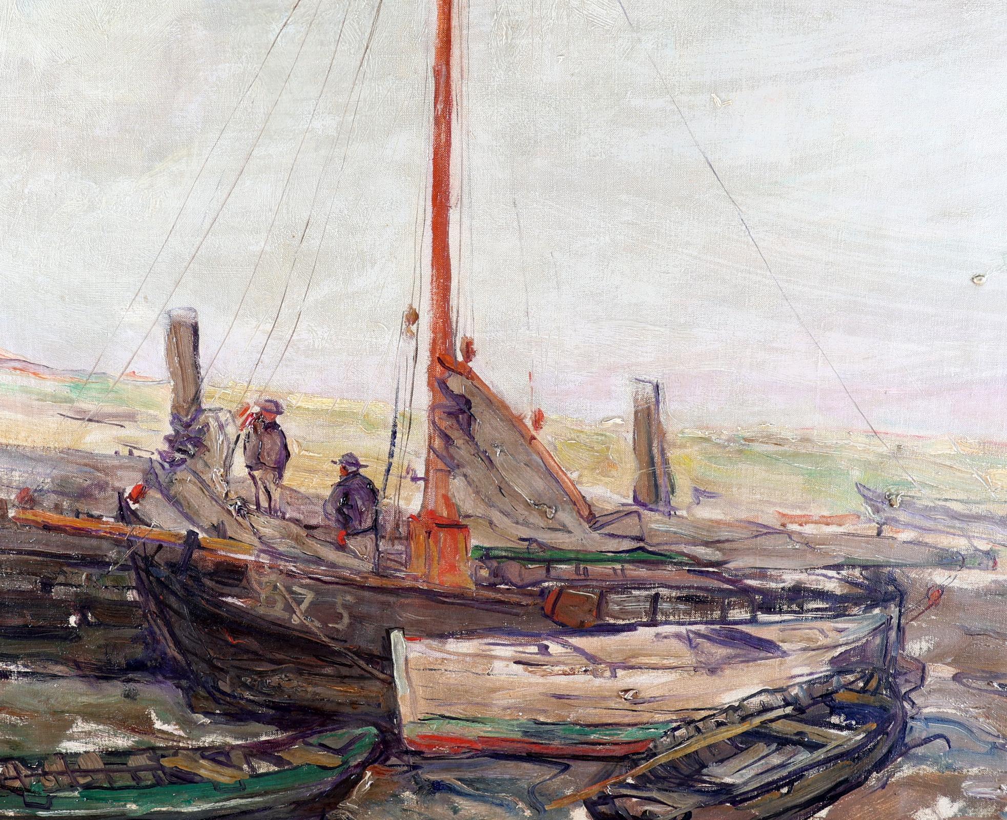 Willem van Dort (1875-1949), Afgemeerde boten langs de kust, olieverf op doek, 70 x 90 cm.