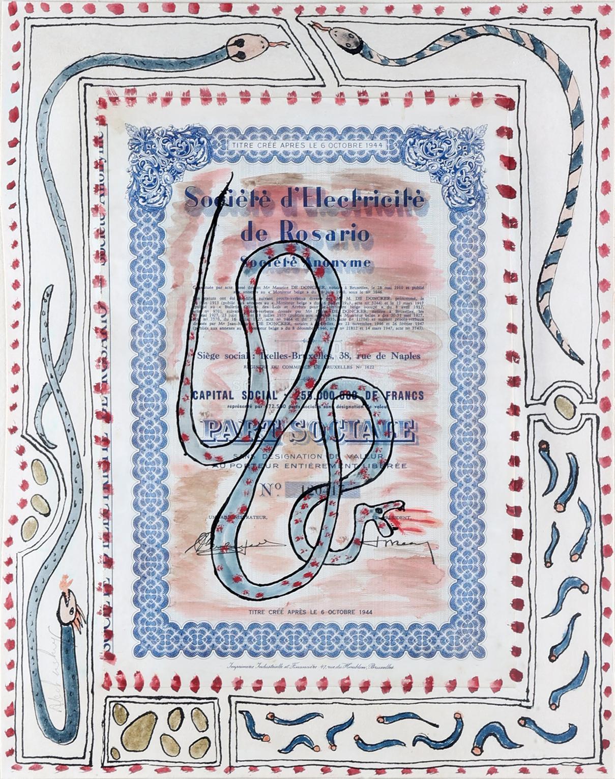 Pierre Alechinsky (1927), Part Sociale, collage, aquarel en inkt op papier, 42 x 33 cm.