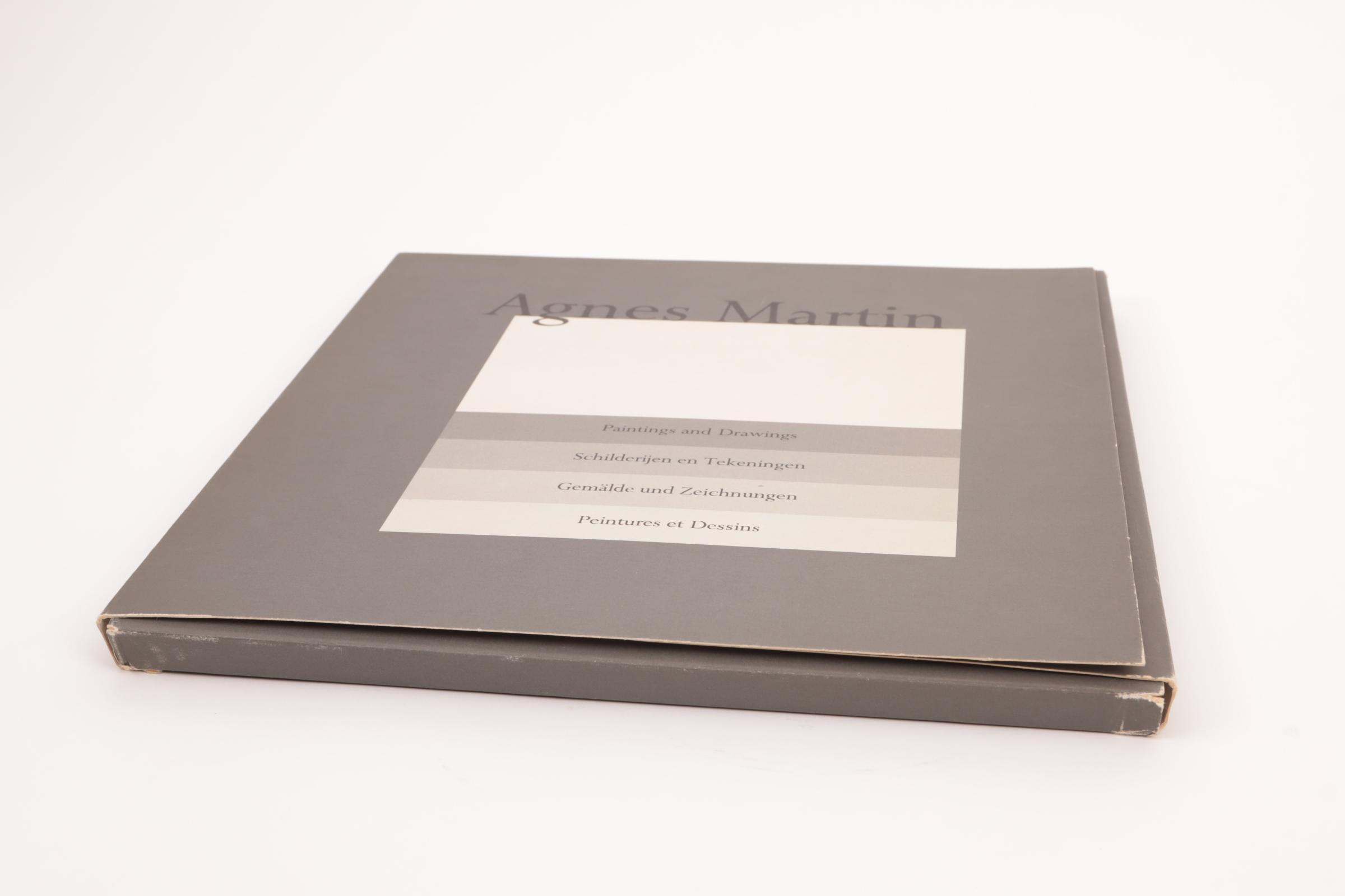 Agnes Martin: Paintings and drawings / Schilderijen en tekeningen / Gemälde und Zeichnungen / Peintures et Dessins 1974-1990, de complete set van 10 lithografieën geprint in kleur, editie 2500, op vellum transparant papier, geprint door Lecturis, Eindhoven en het Stedelijk Museum, Amsterdam, de lithografieën door Nemela & Lenzen GmbH, Monchengladbach in het originele grijze portfolio, elke lithografie 29,8 x 29,8 cm., de catalogus gepubliceerd met een oplage van 5000, catalogus nummer 744