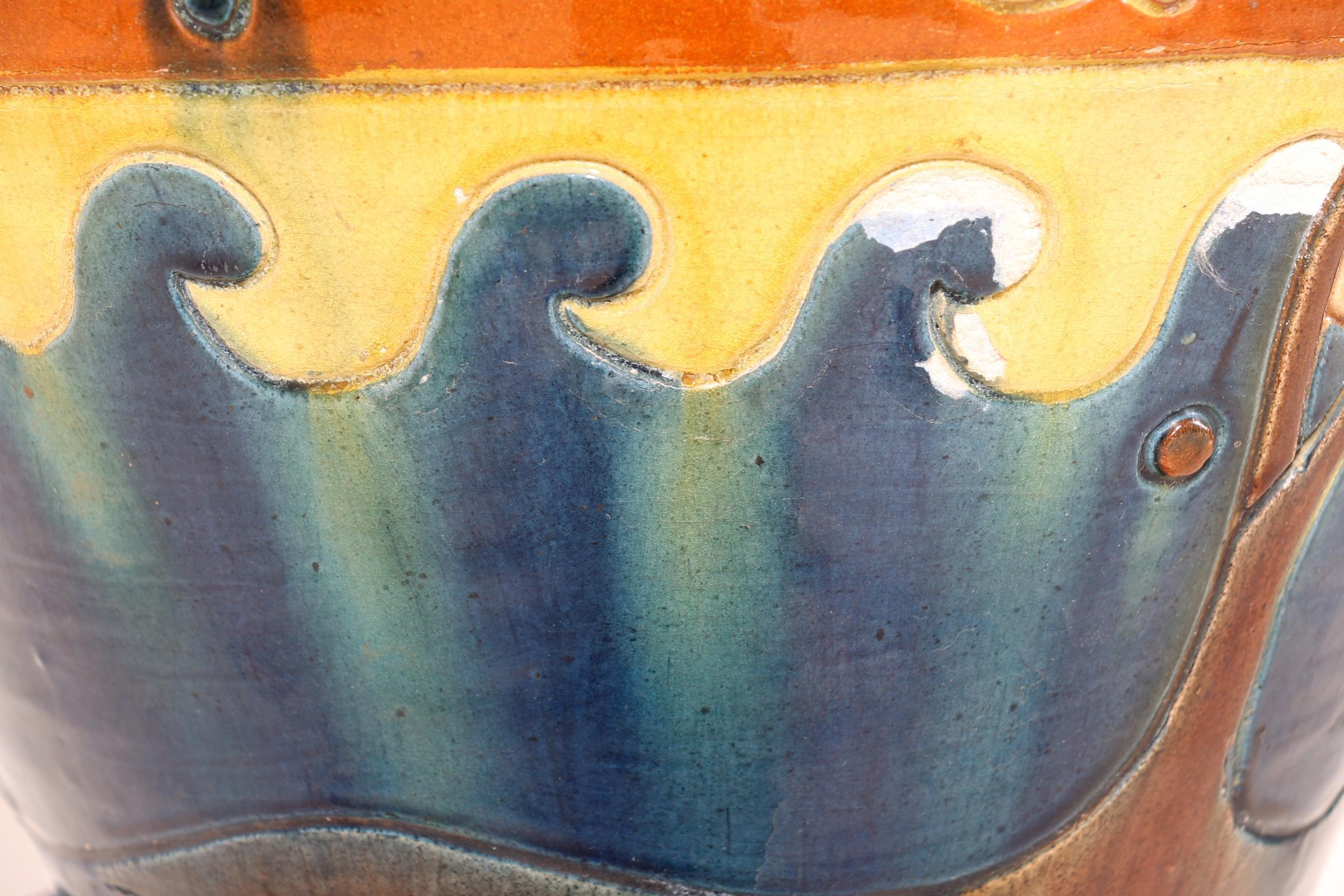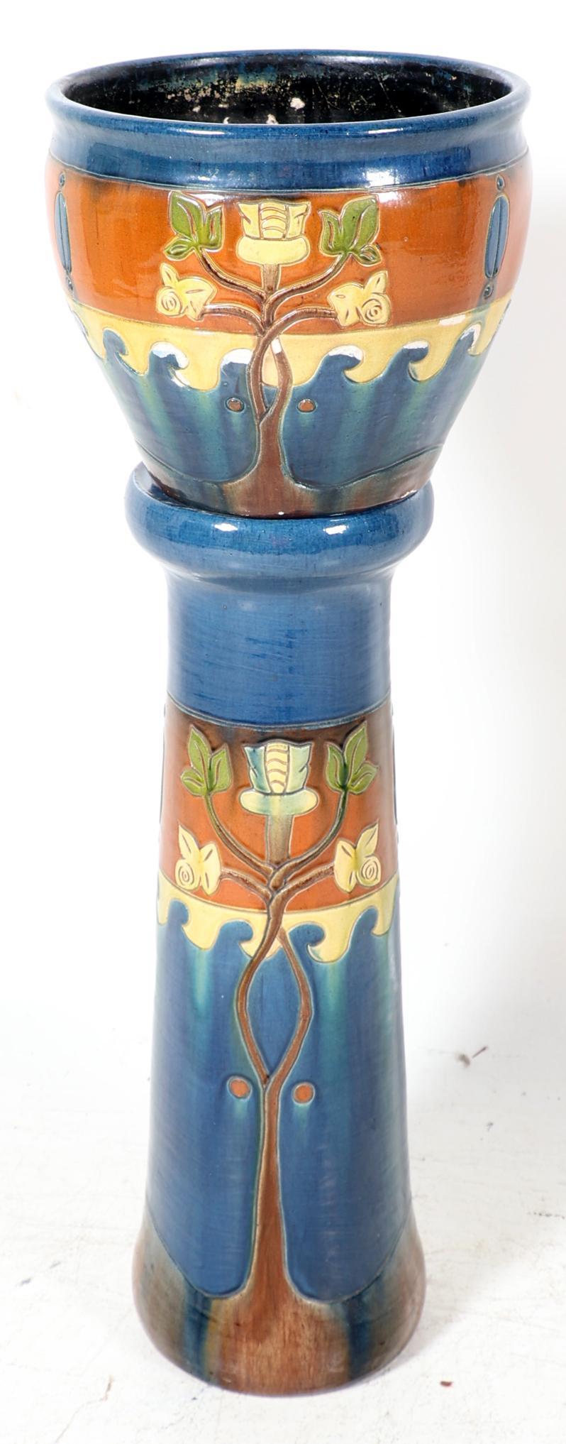 Geglazuurde aardewerken cachepot op zuil met Jugendstil motieven (beschadigingen), h.110 x diam.36 cm.