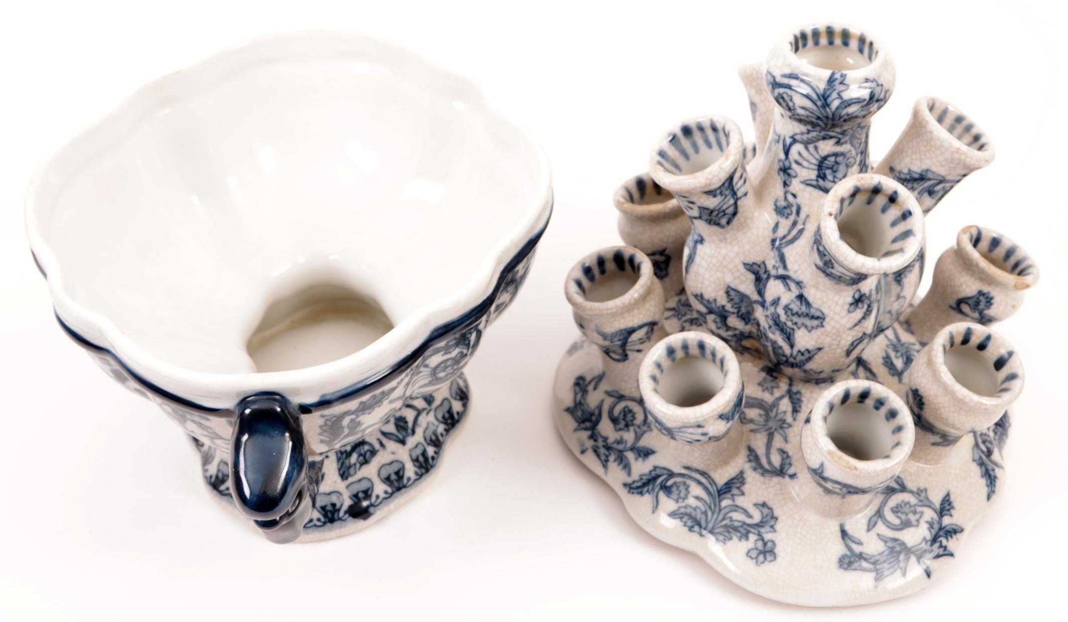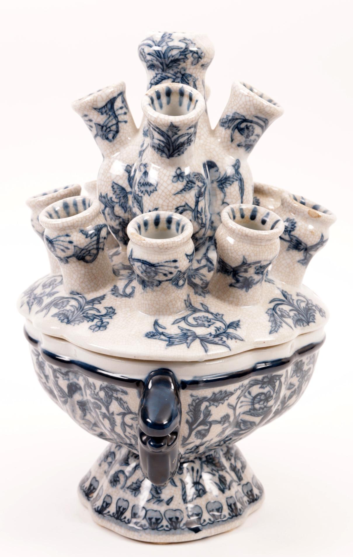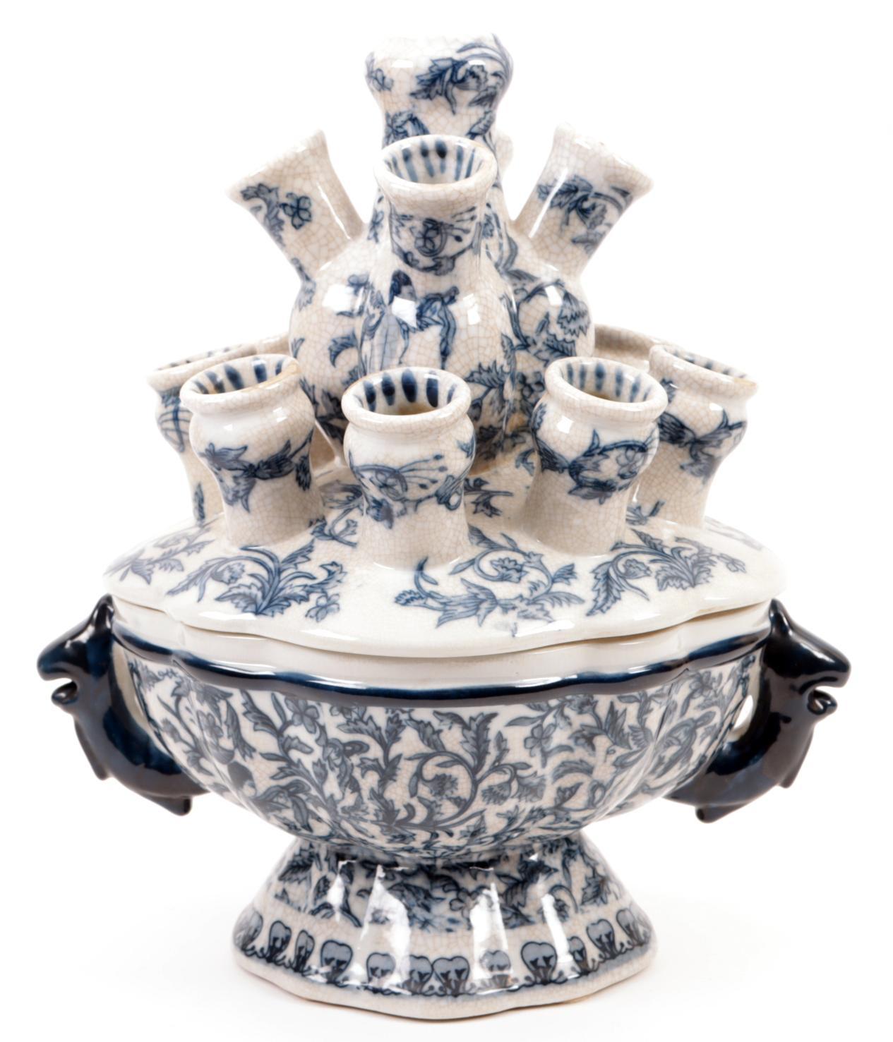 Blauw/wit gedecoreerd aardewerken tulpenvaas, h.36 cm.