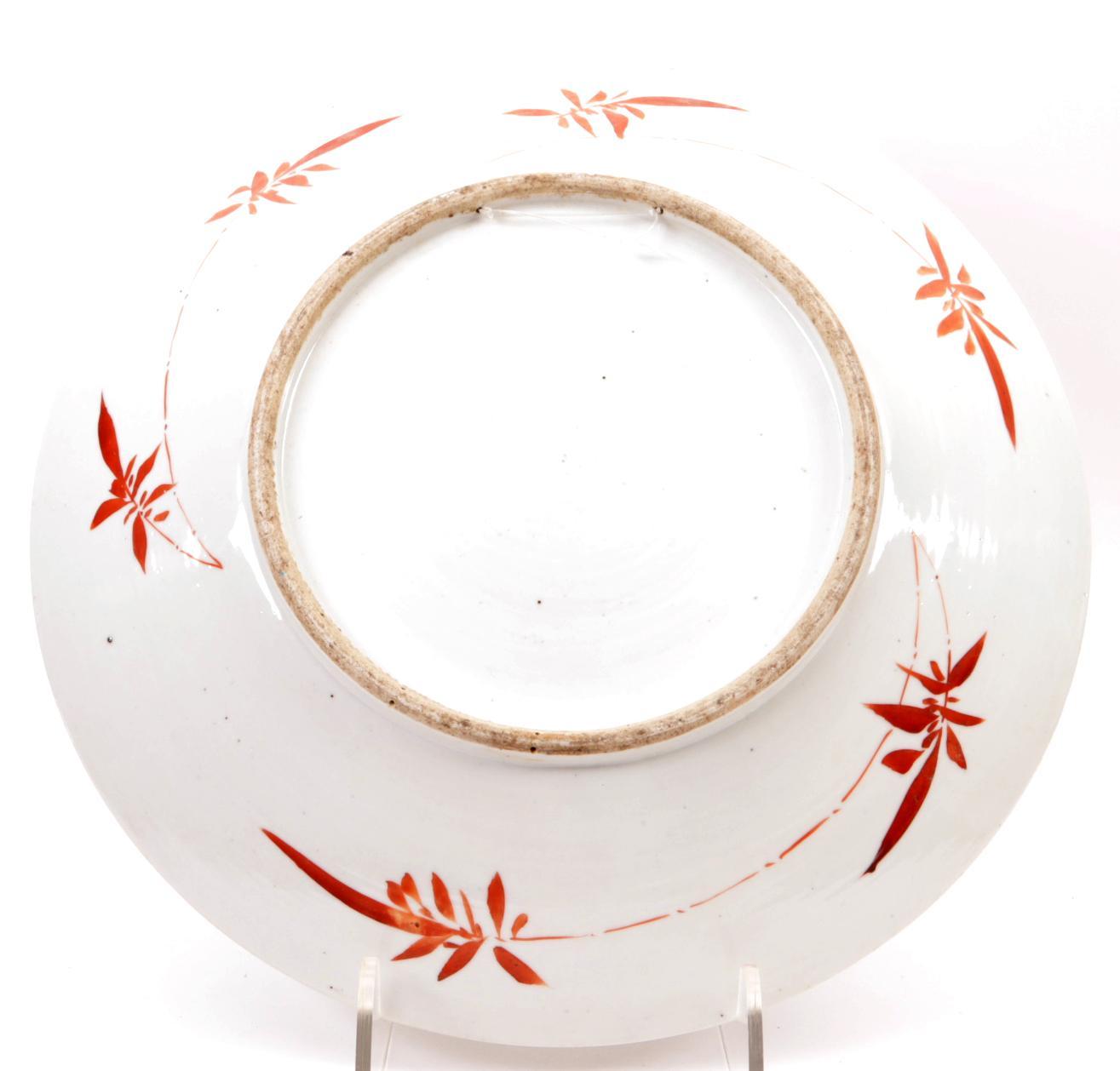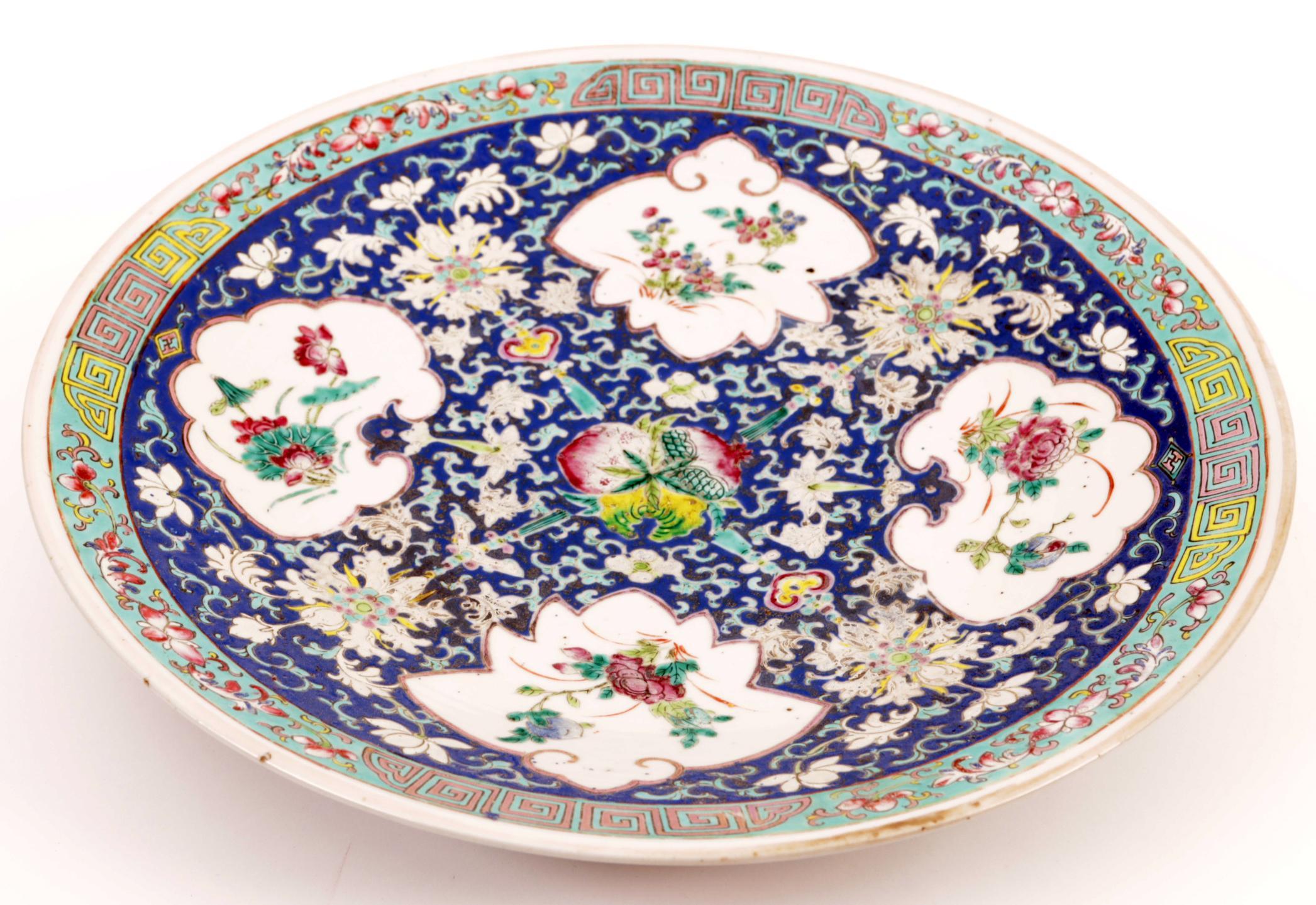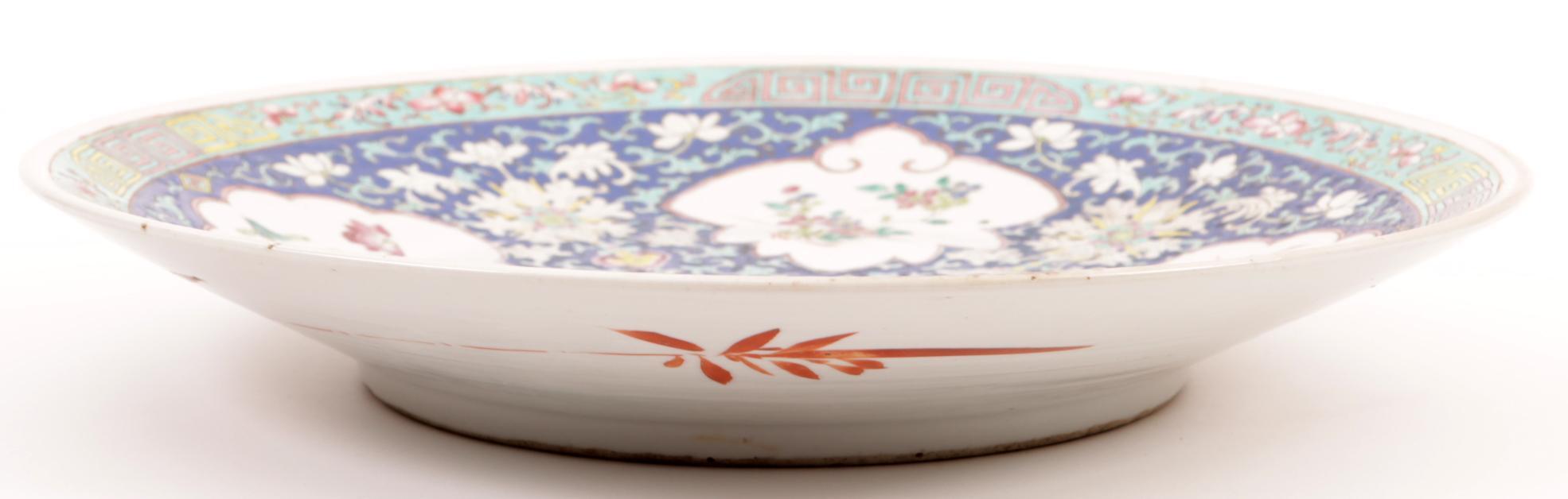 Gepolychromeerde met bloemen gedecoreerde porseleinen schotel, diam.40 cm.
