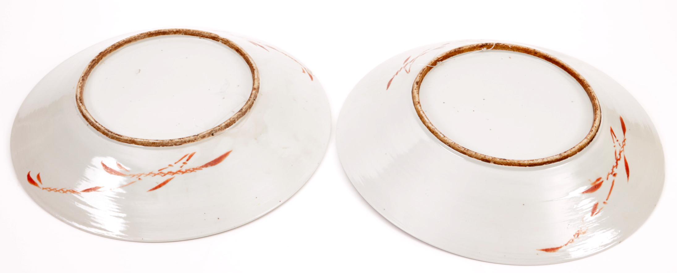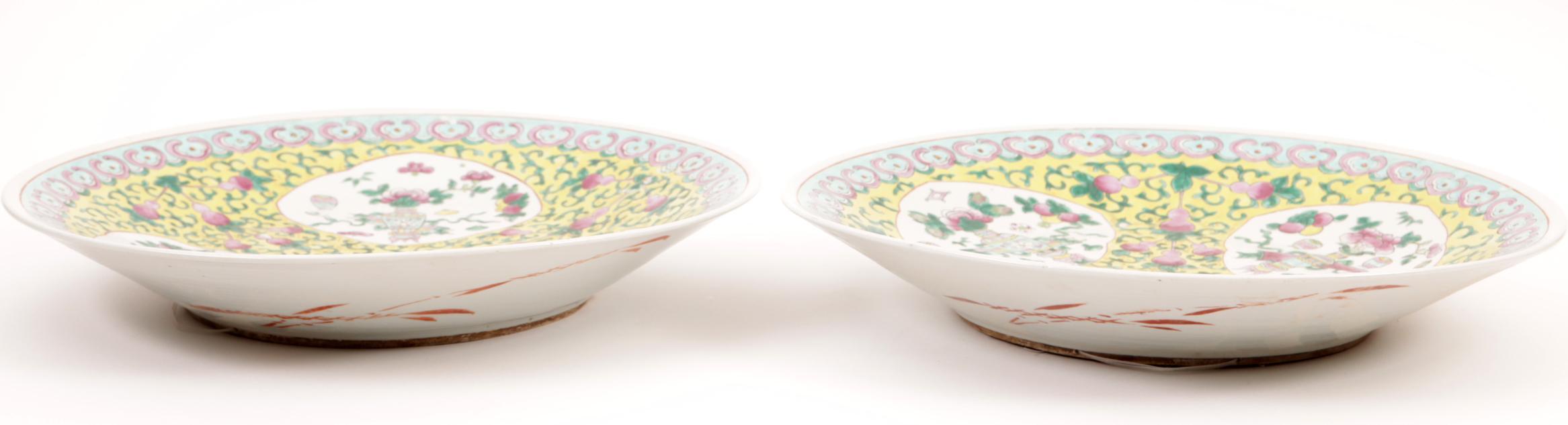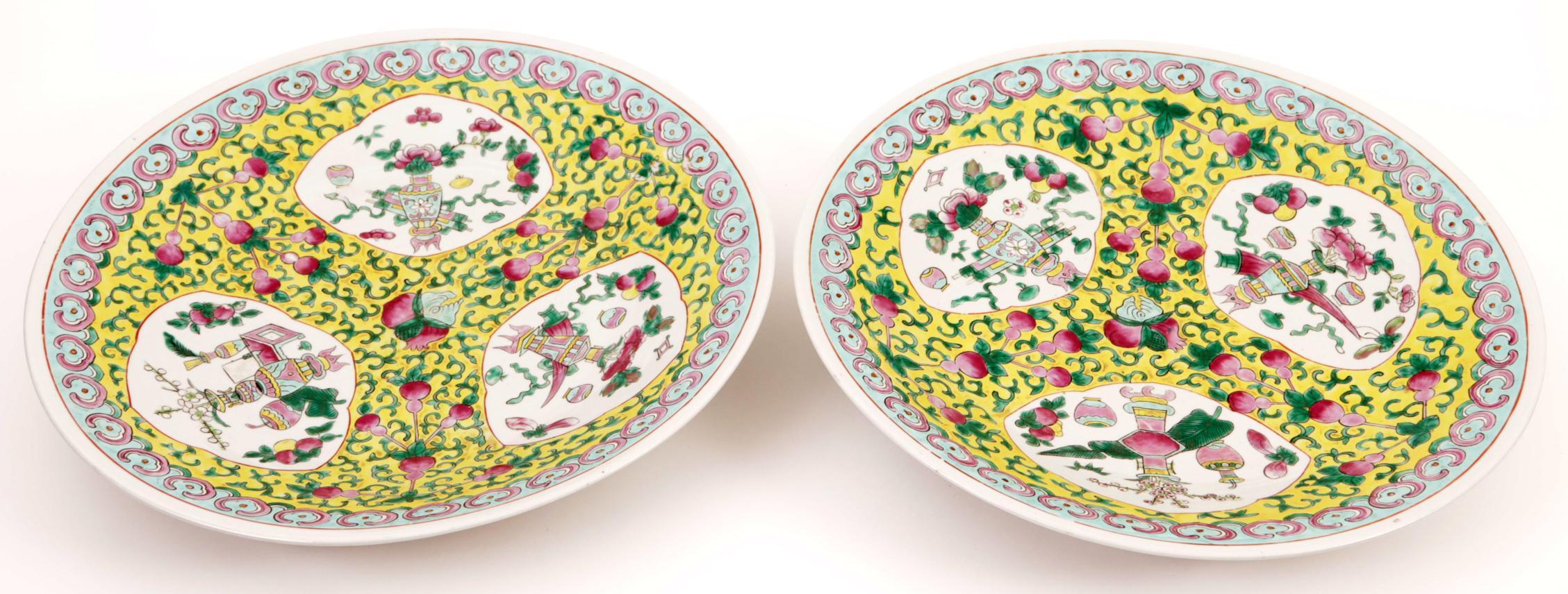 Twee met vazen gedecoreerde Chinees porseleinen schotels, diam. 38 cm.