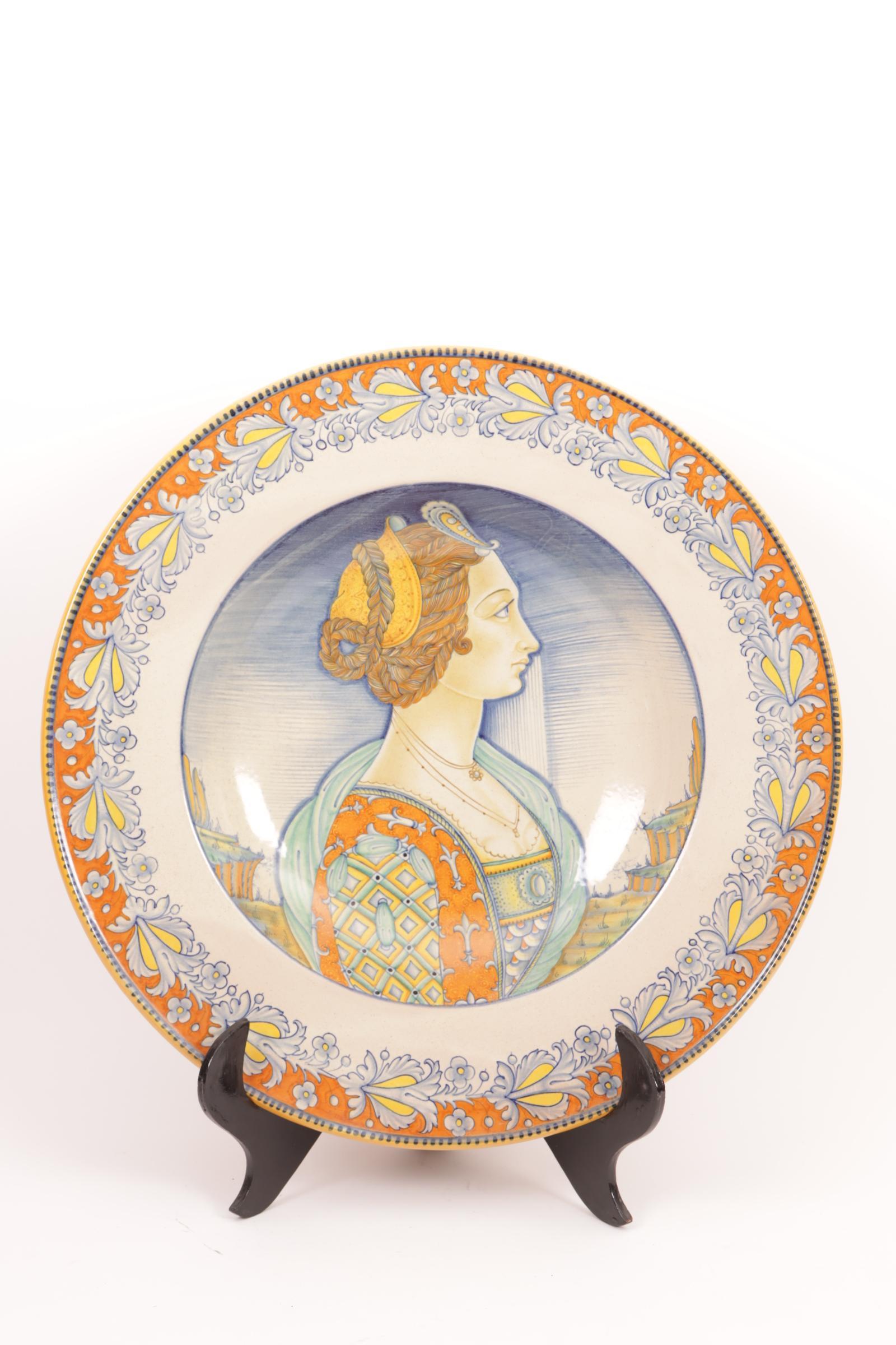 2 Grote met man en vrouw gedecoreerde Majolica diepe schotels, diam.49 x h.8 cm.