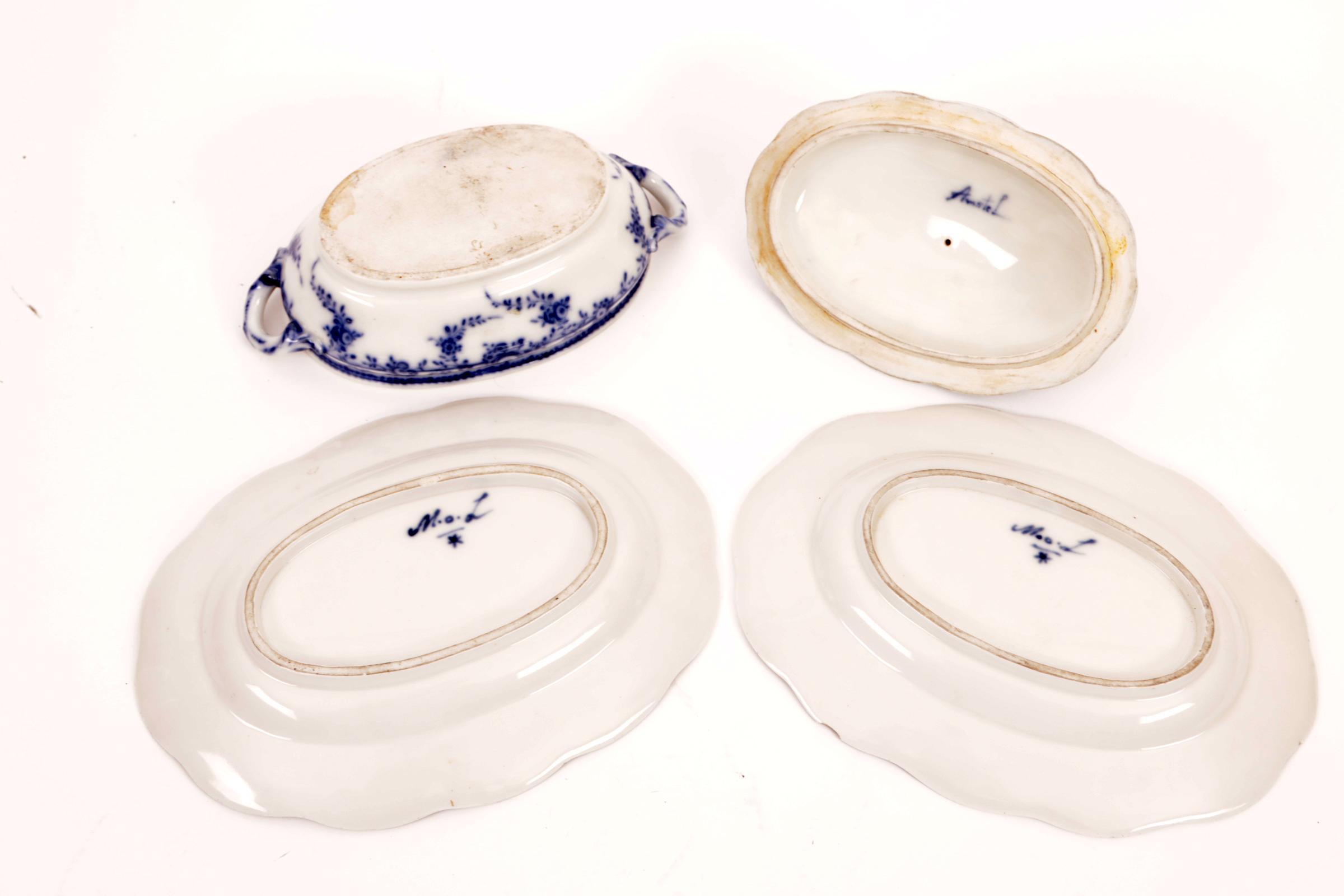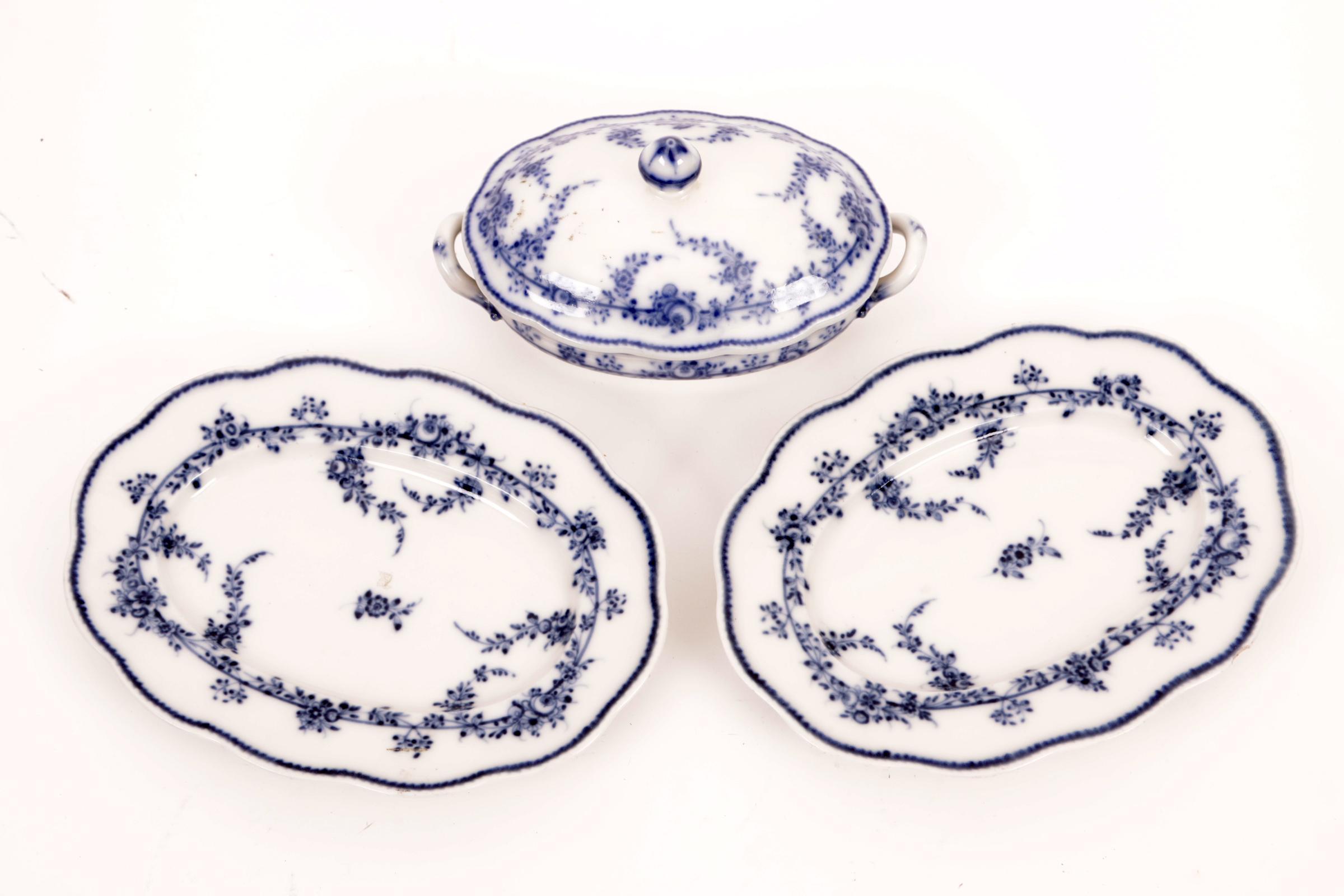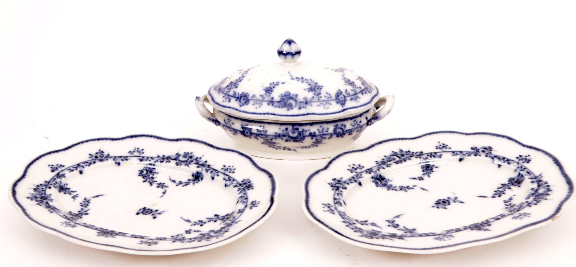 2 Wit met blauwe strooibloemen gedecoreerde Loosdrechts porseleinen ovale schaaltjes, 21 x 15,5 cm., gemerkt M.O.L., 18e eeuw en dekselterrine, gemerkt Amstel, 18e eeuw