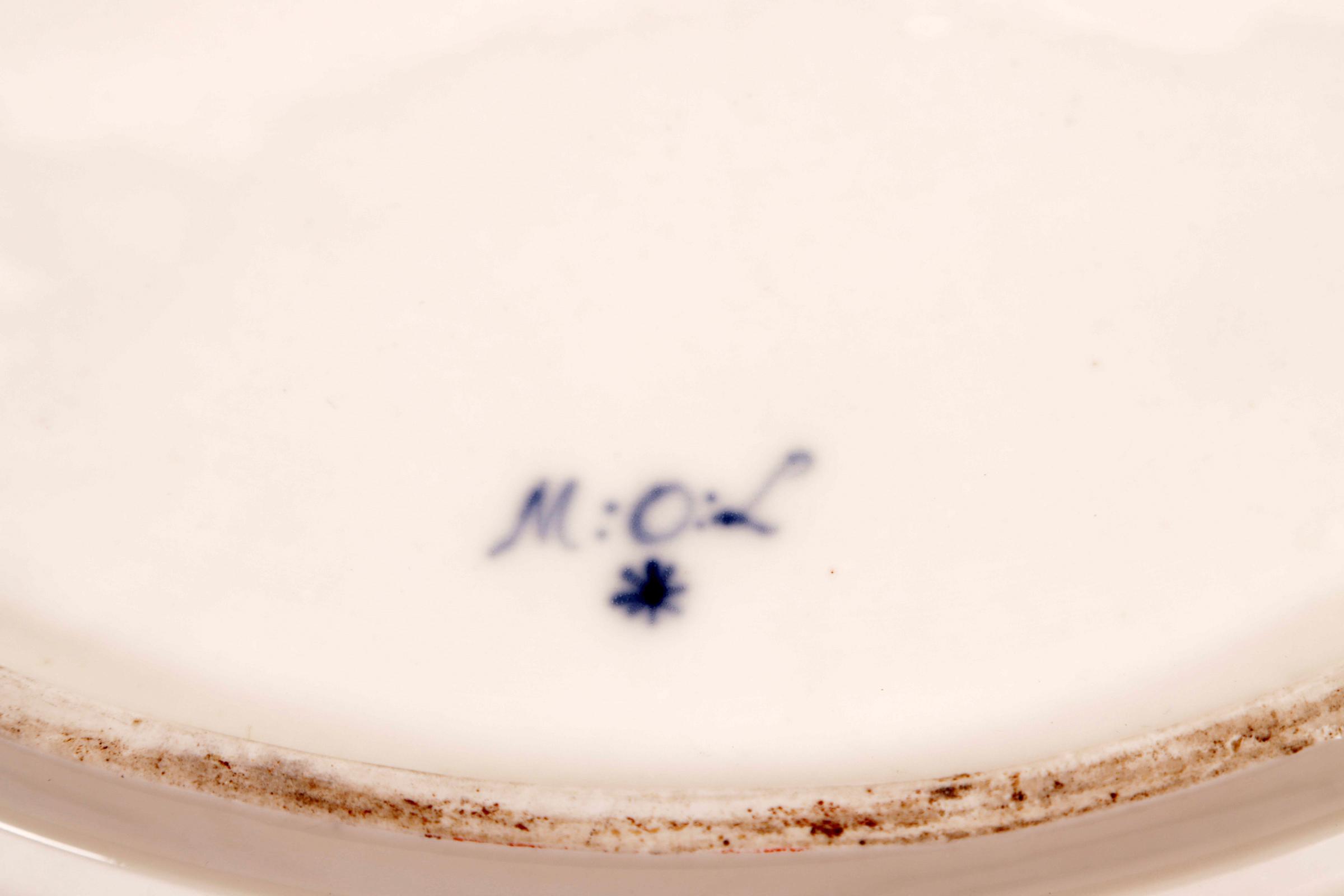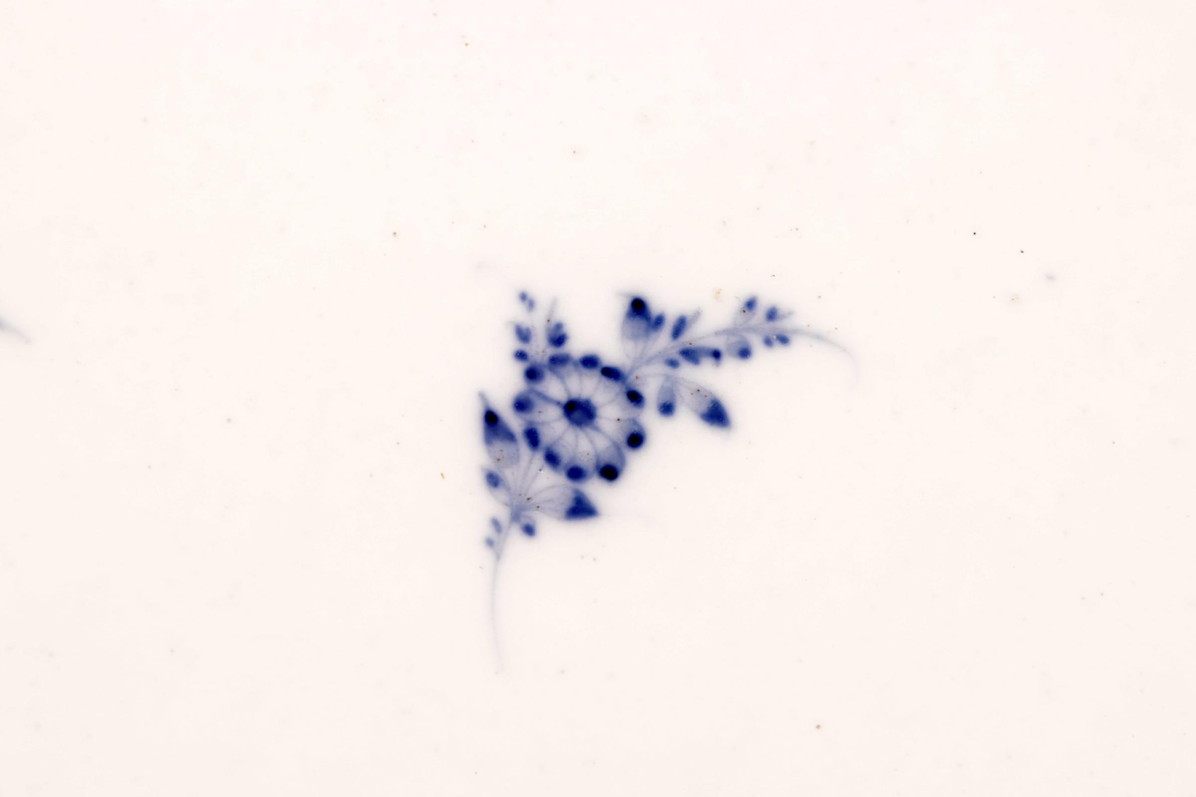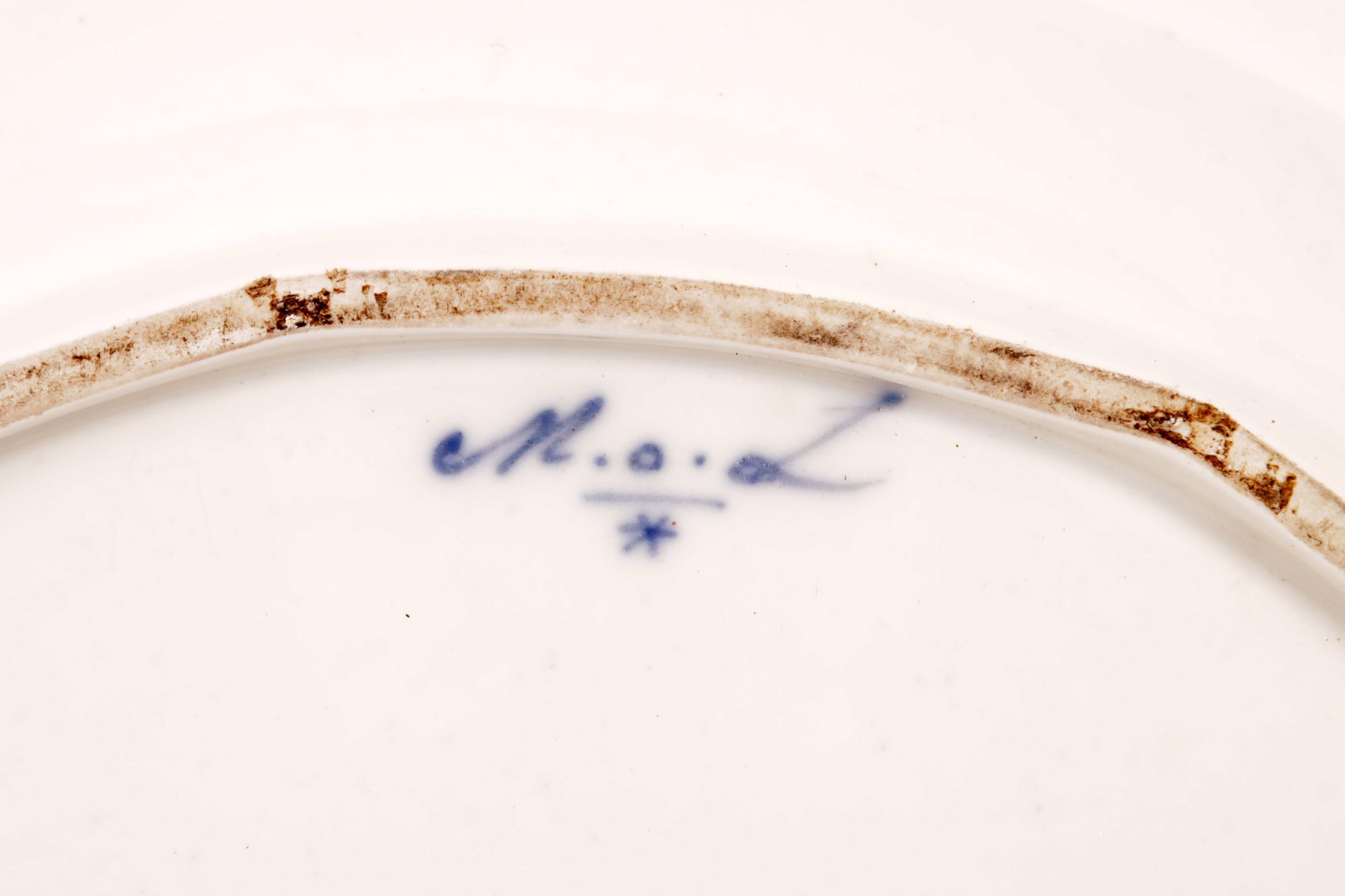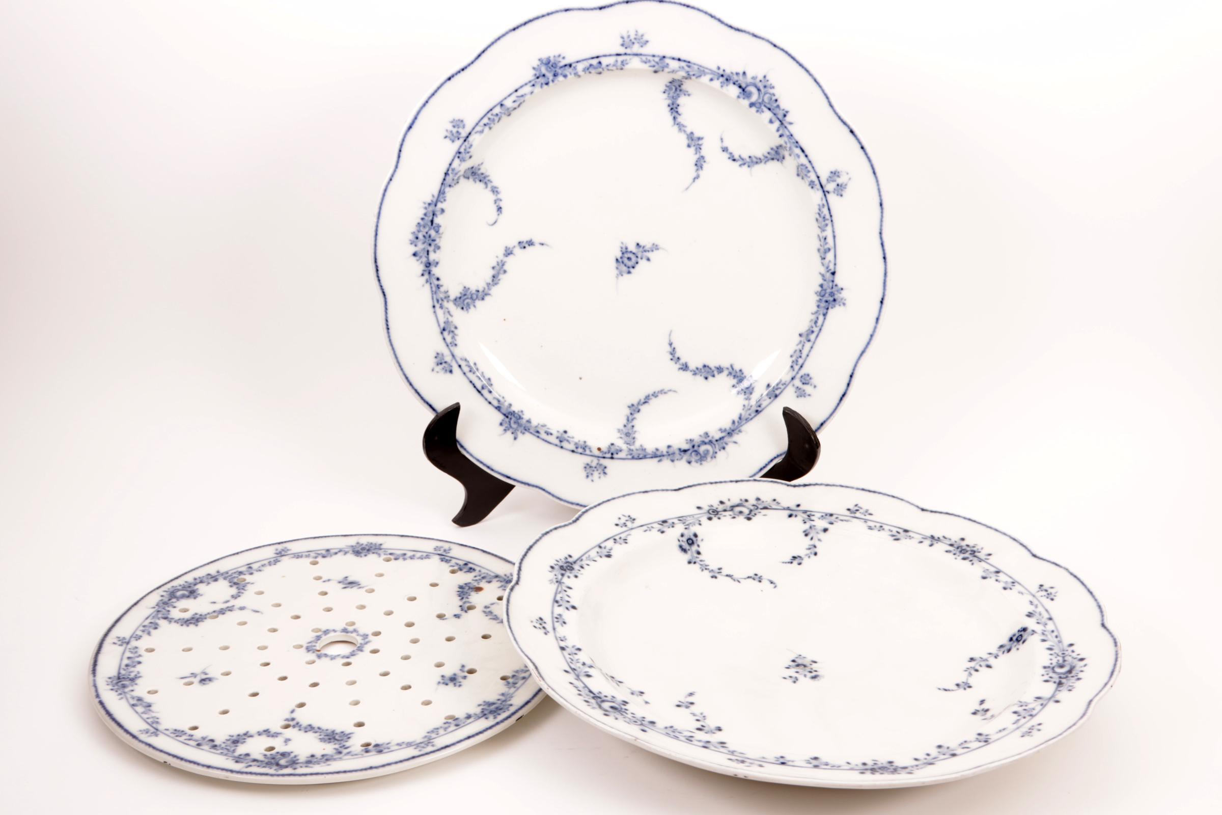 2 Wit met blauwe strooibloemen gedecoreerde Loosdrechts porseleinen grote schalen, diam.45 cm., gemerkt M.O.L., 18e eeuw en een niet gemerkte lekschaal