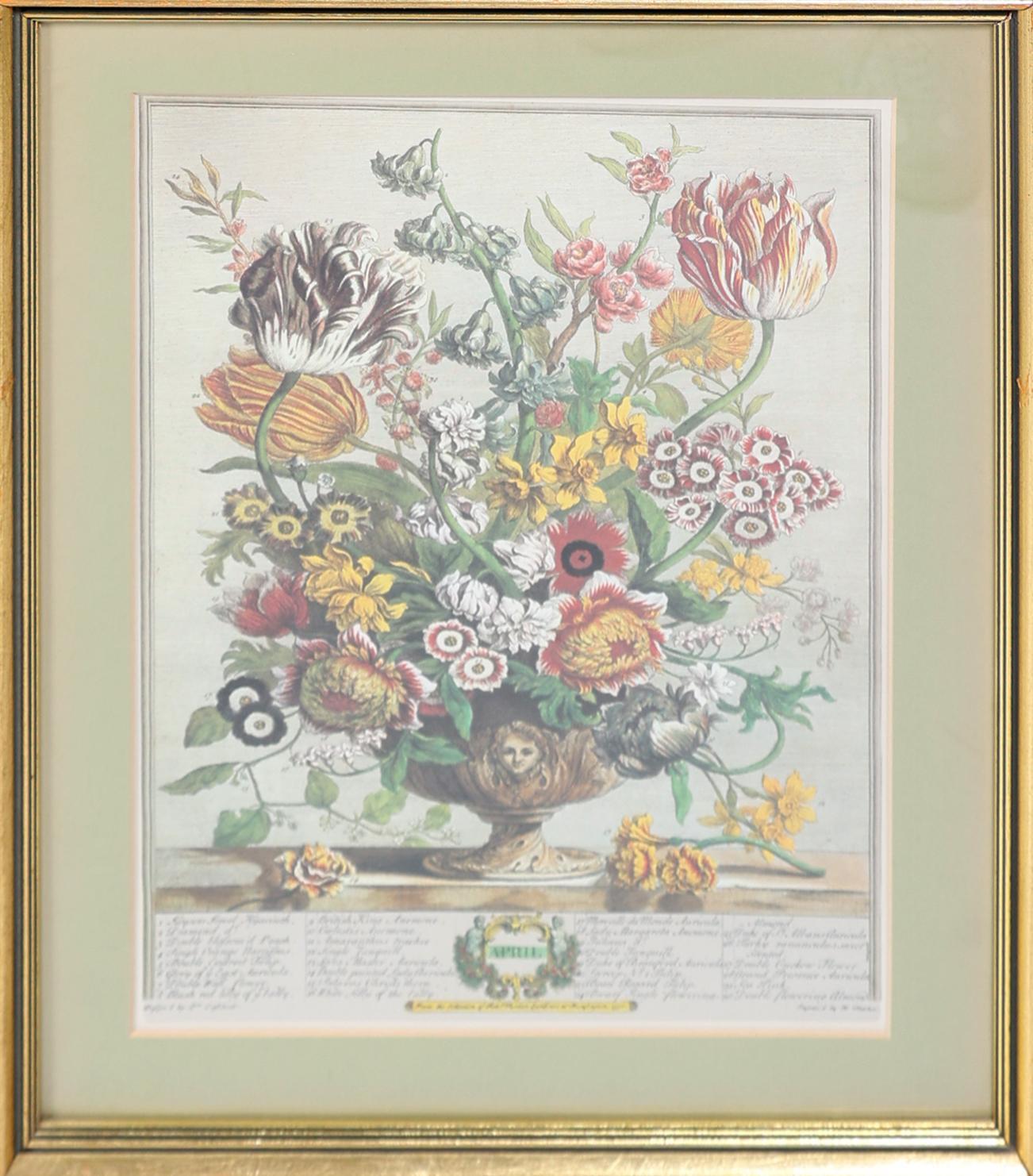 Koop van 12 bloemenlitho's naar oude gravures met de maanden, totaalformaat 53 x 43 cm.
