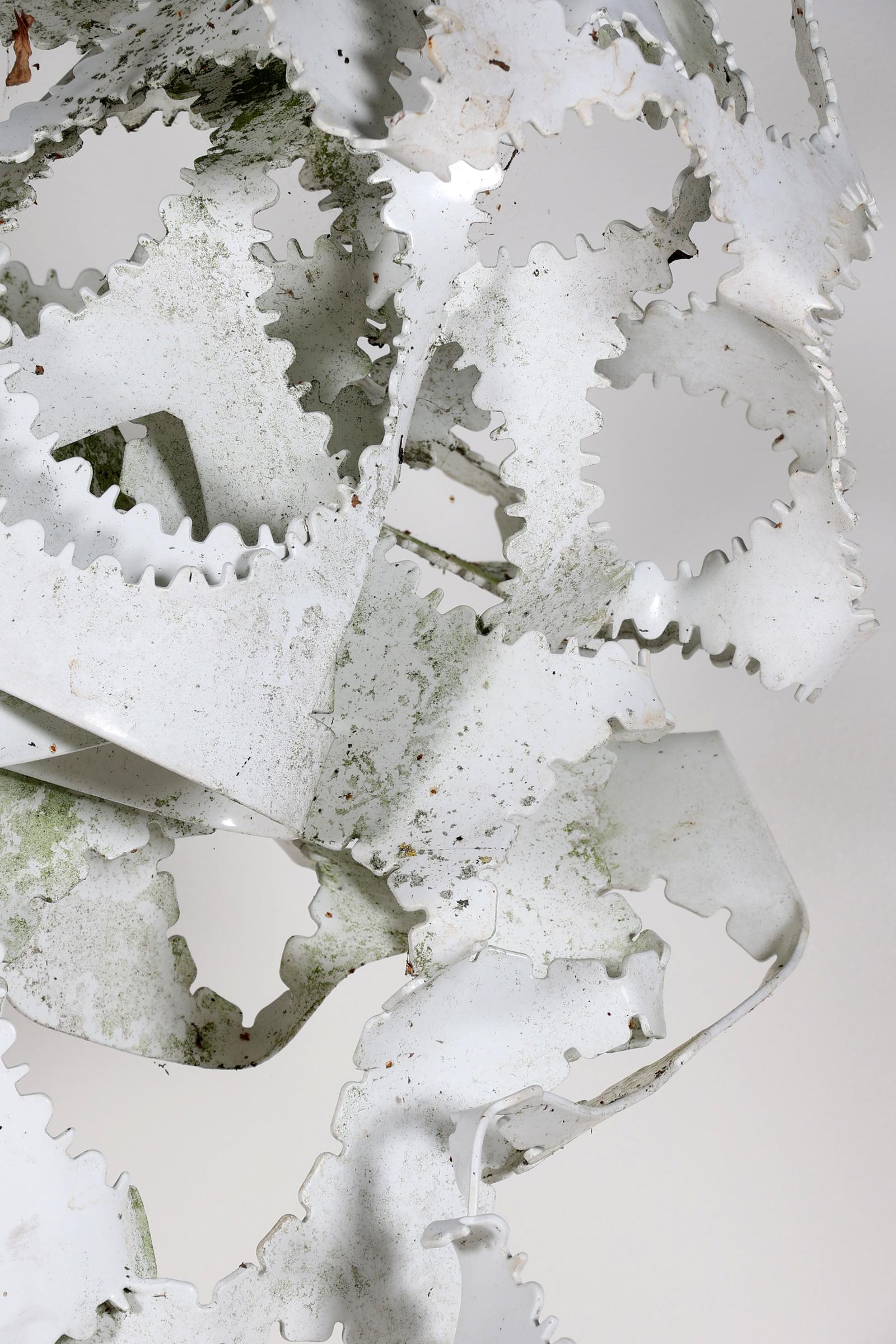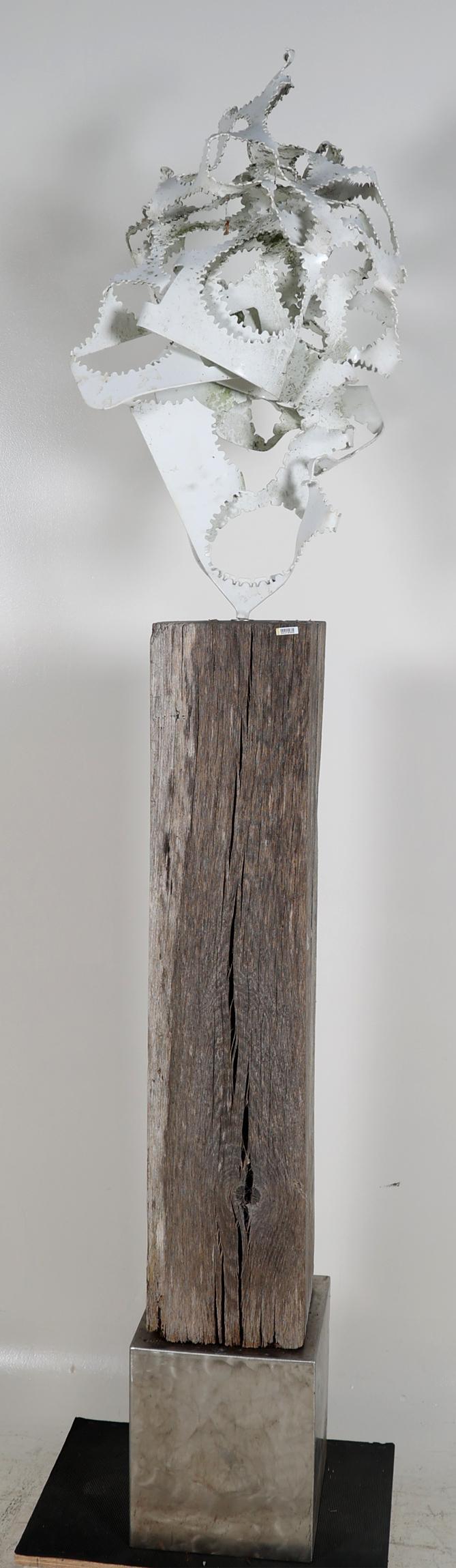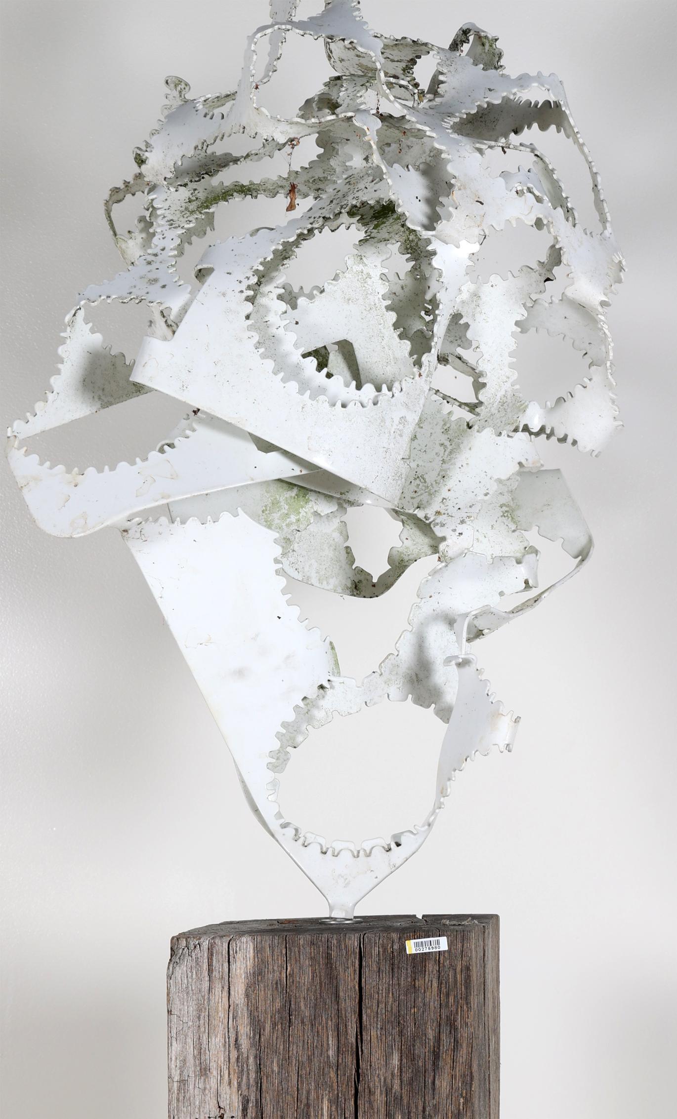 Jo Dieteren, wit gepoederd gecoate aluminium tuinsculptuur rustend op houten met roestvrij stalen onderkant, h.250 cm., provenance particuliere collectie/rechtstreeks verworven bij kunstenaar