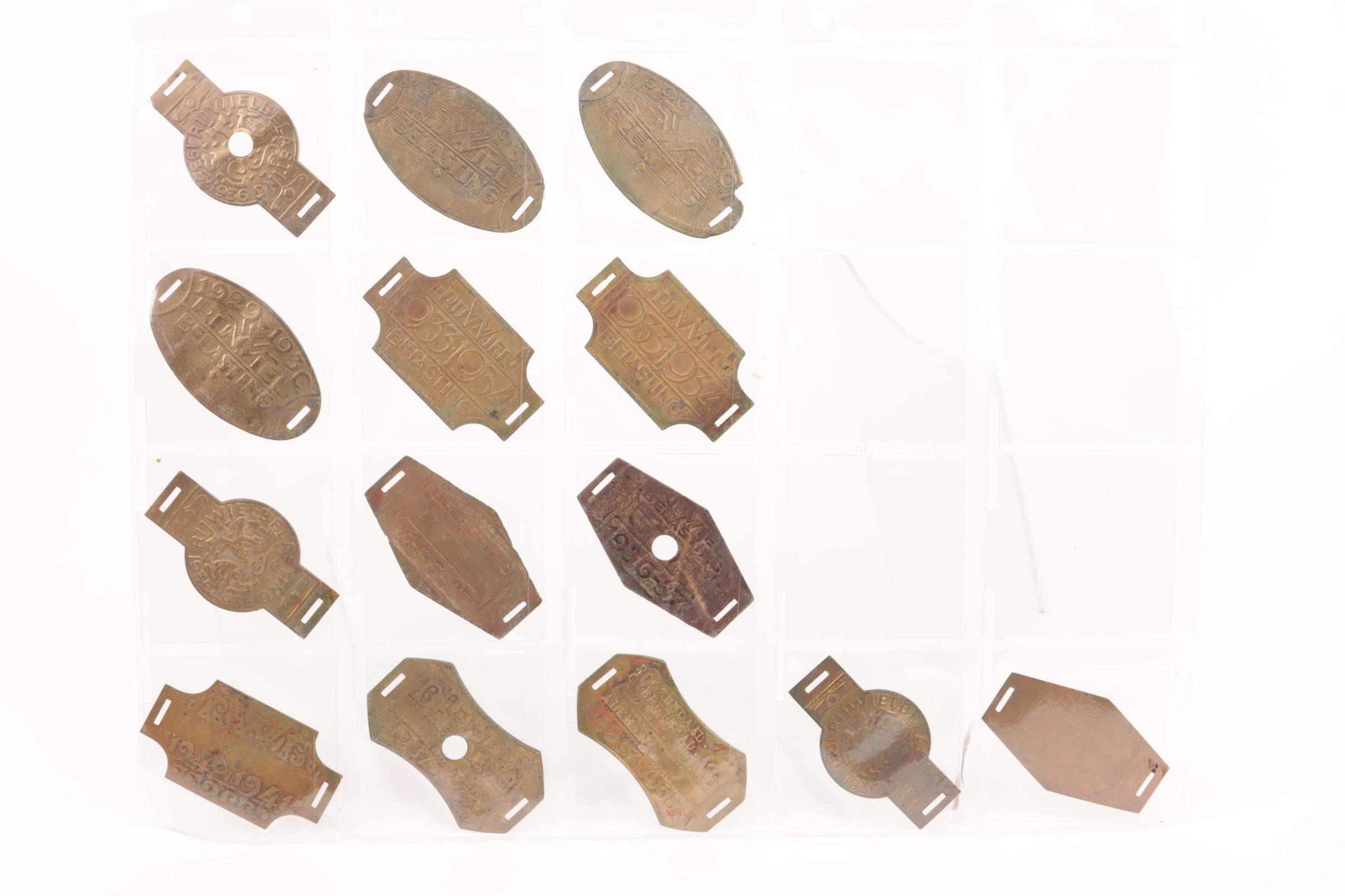Koopje messing fietsbelasting plaatjes (14x), diverse jaren w.o. belastingvrij