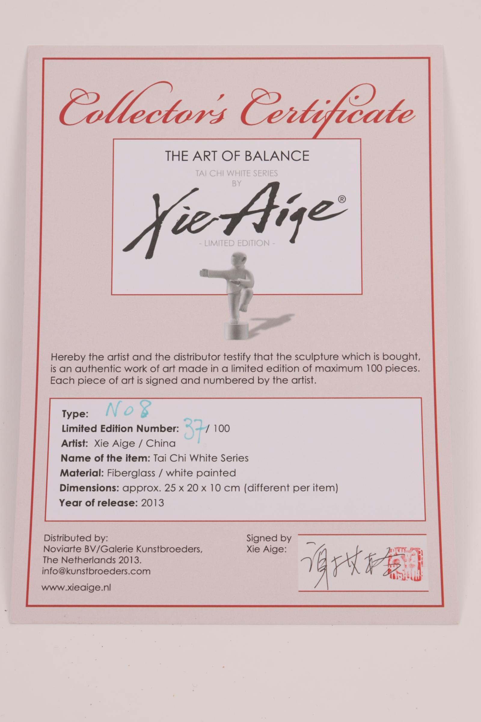 Een drietal sculpturen uit de Tai Chi serie van de Chinese kunstenaresse Xie Aige; wit kunsthars; met certificaat in presentatie box Titel: Tai Chi No : 1/3/8, Oplage :99, h.ca.23 cm. Xie Aige zette zichzelf als beeldend kunstenaar opmerkelijk snel op de internationale kaart. Tijdens haar eerste expositie (Shanghai Duolon Museum of Modern Art/ 2005) trok zij met haar originele werk de aandacht van internationale kunstliefhebbers.
