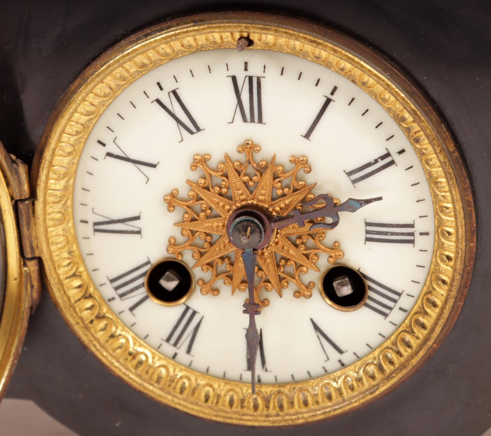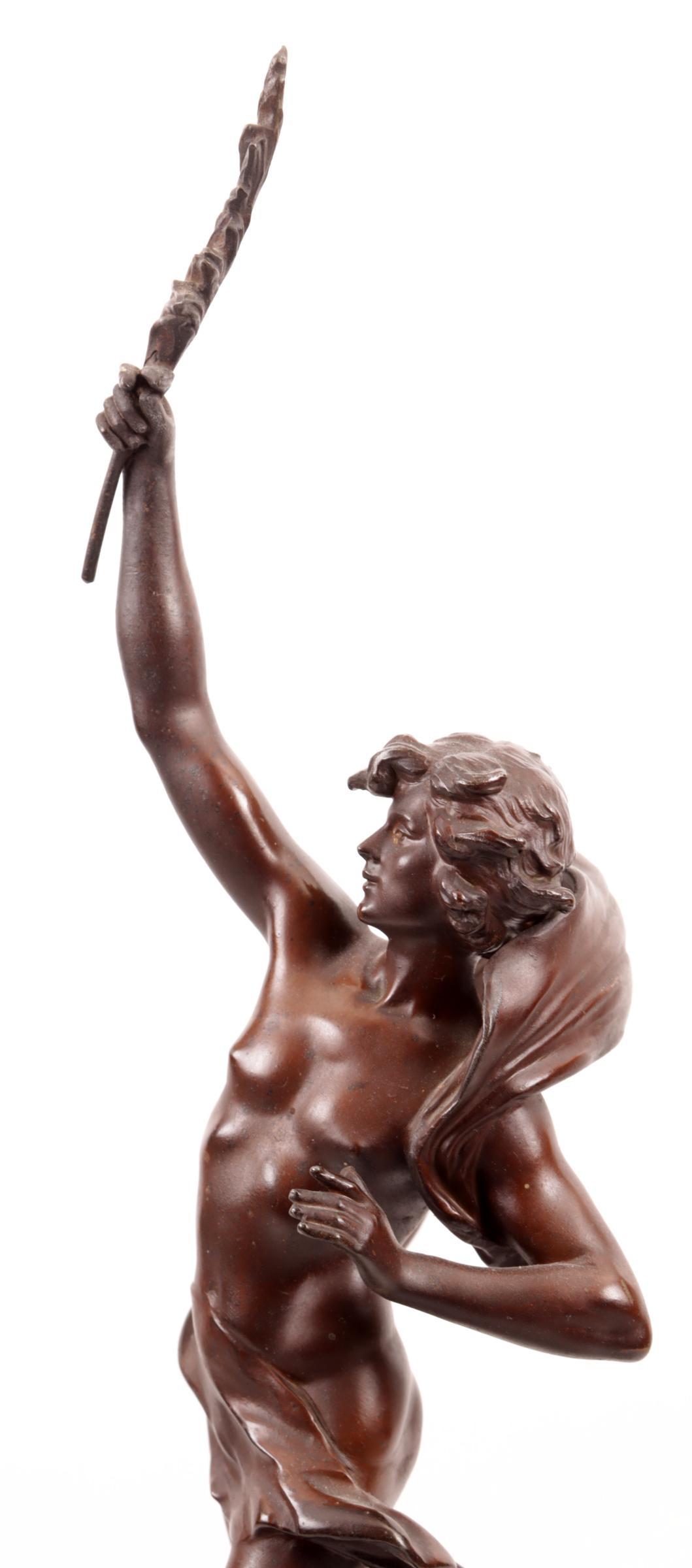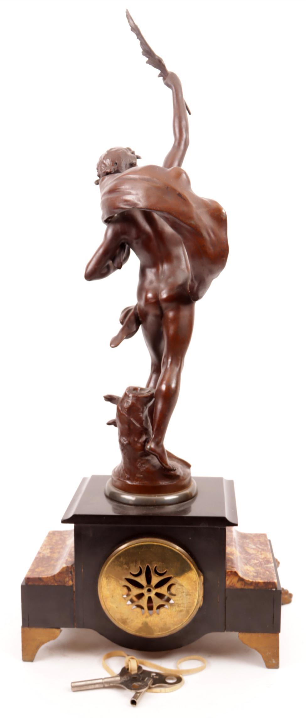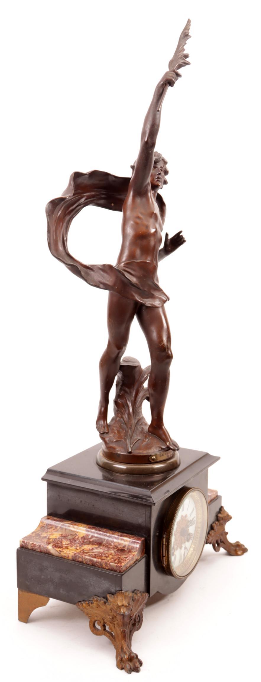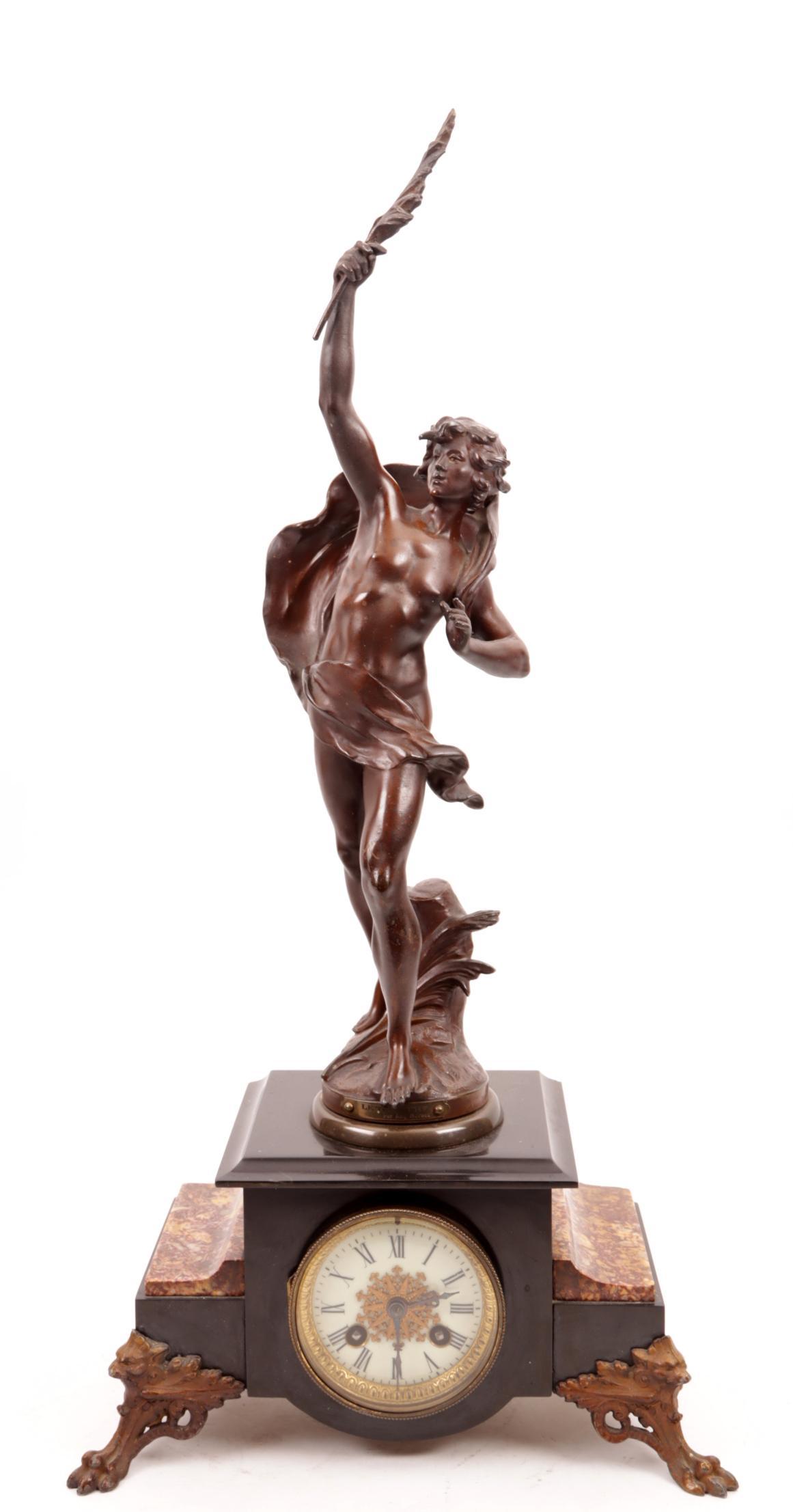 Bronskleurige pendule met voorstelling van "Le Triomphe" naar Auguste Moreau, rustend op een 2-kleurig marmeren voetstuk, h.60 cm.