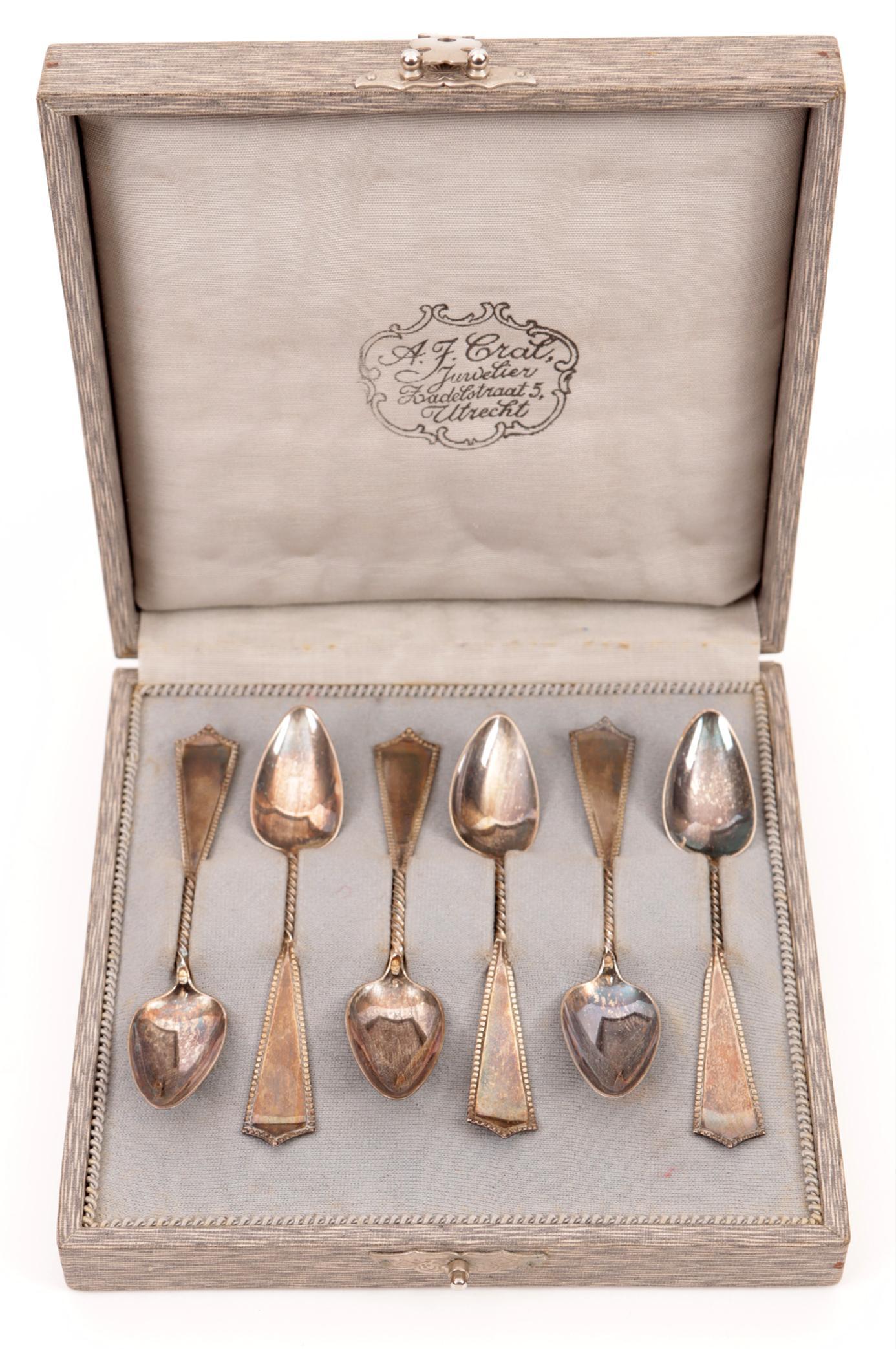 Zes 2e gehalte zilveren lepeltjes met getorste steel en parelrand