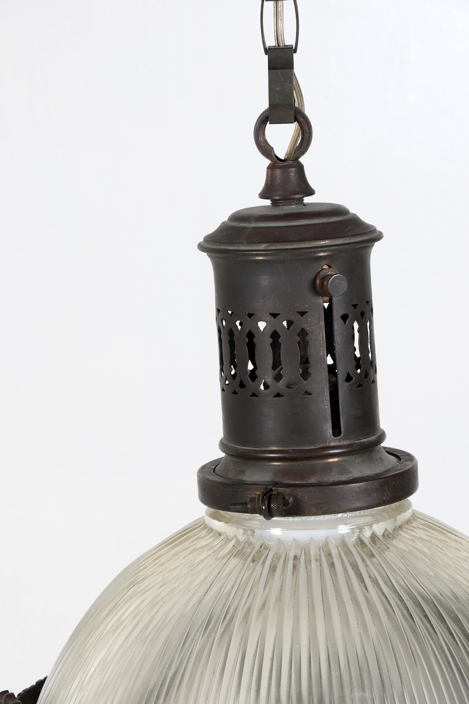 Oude glazen hanglampje met koperen montuur, h.70 cm.