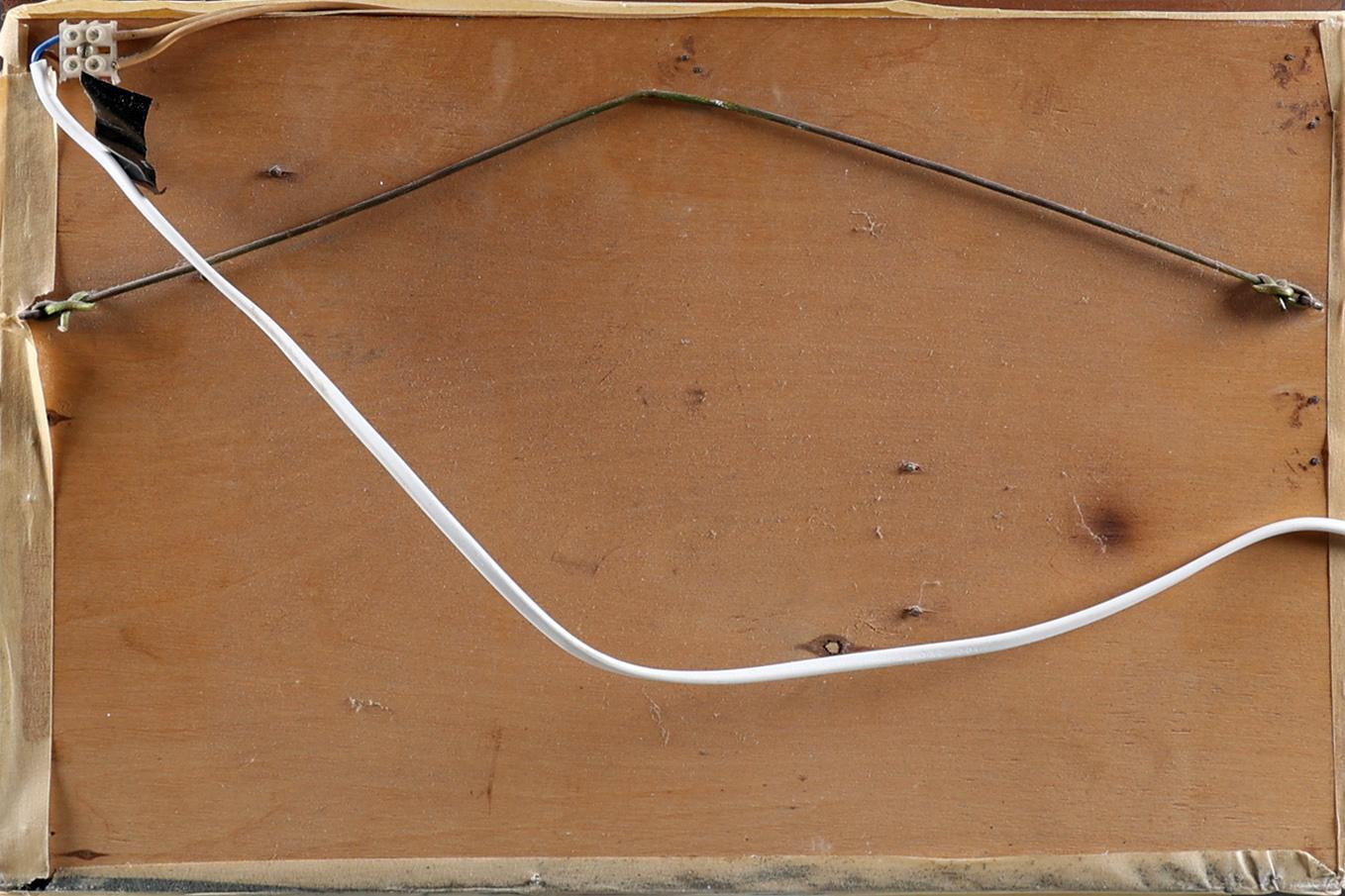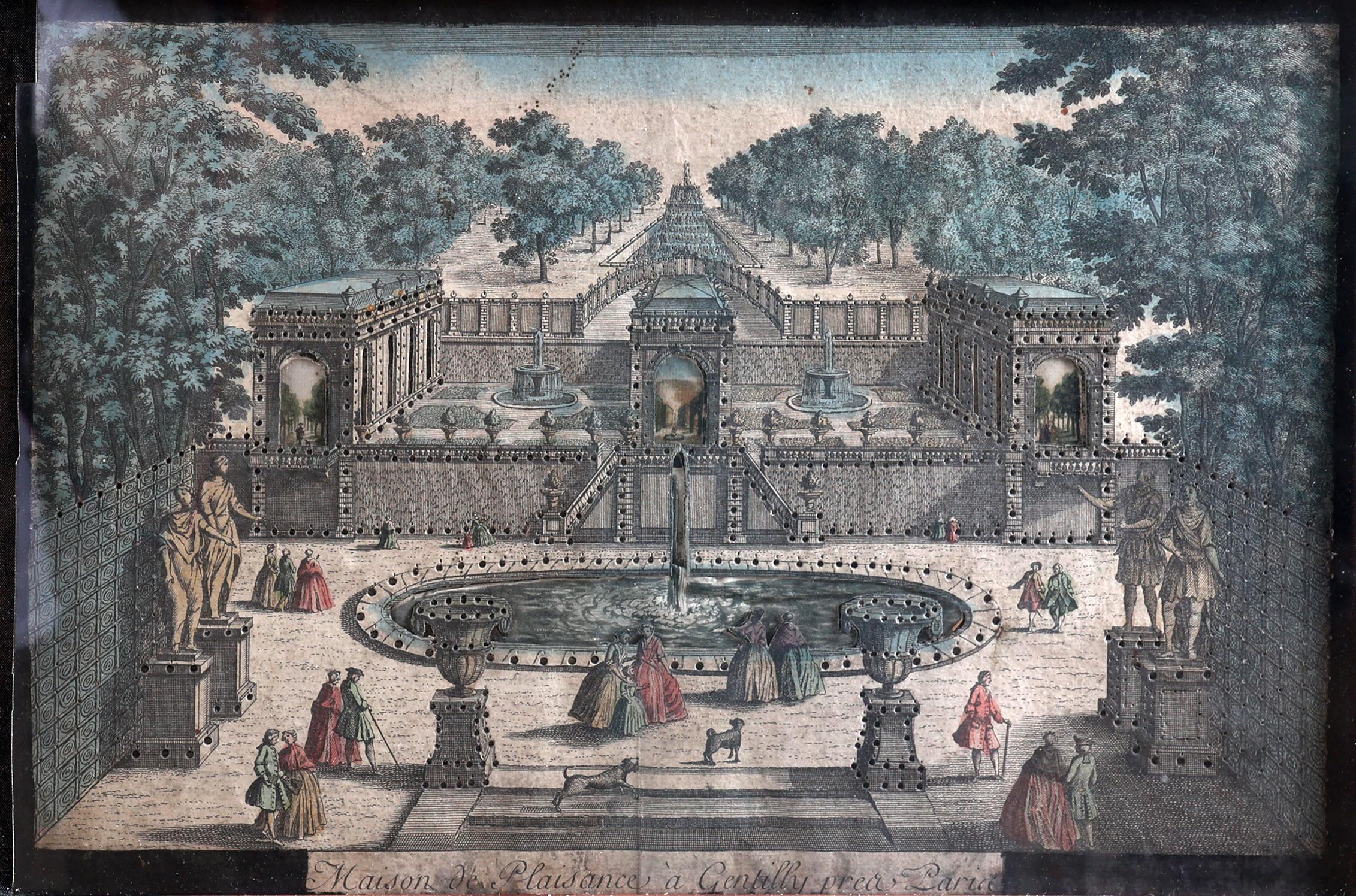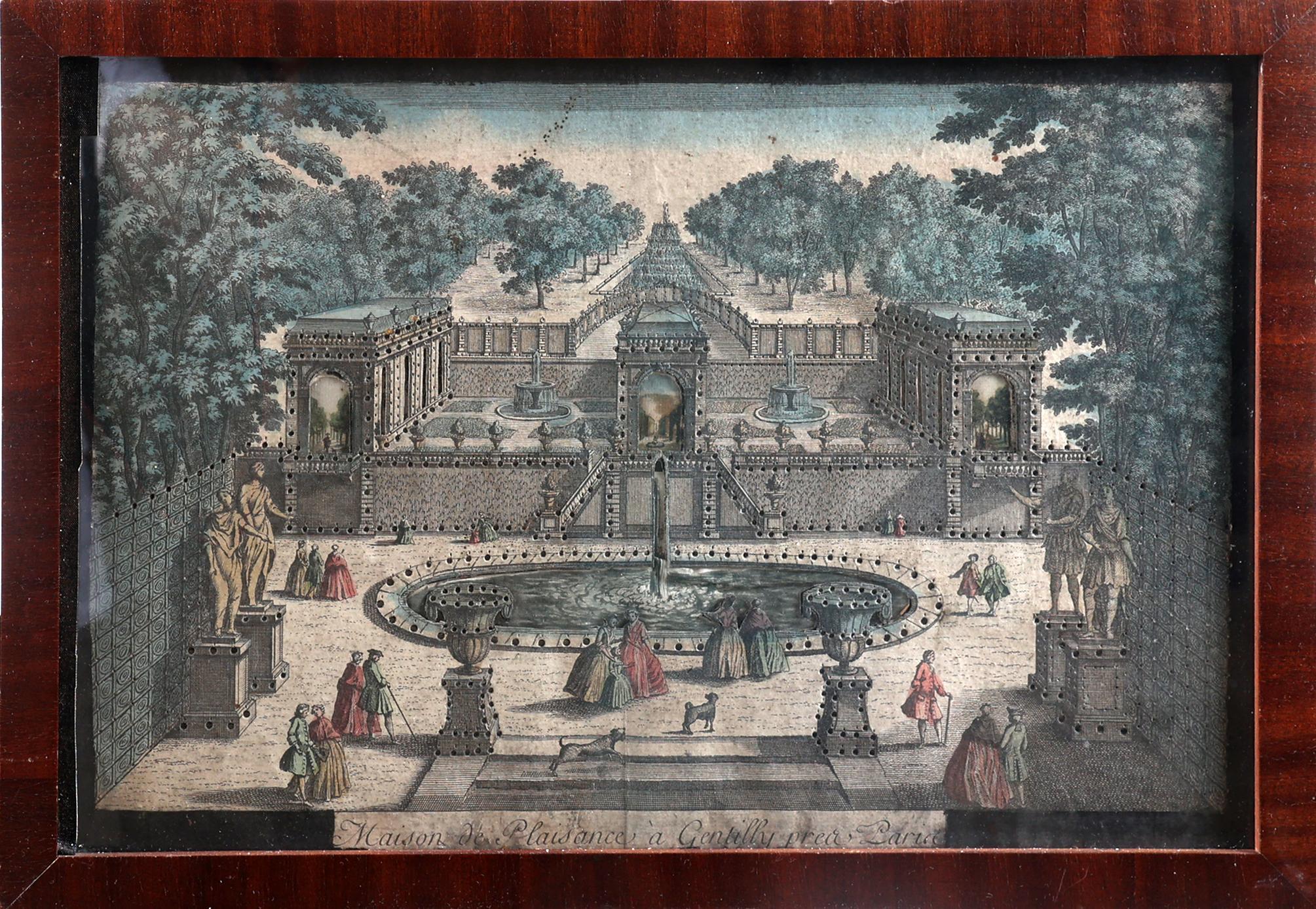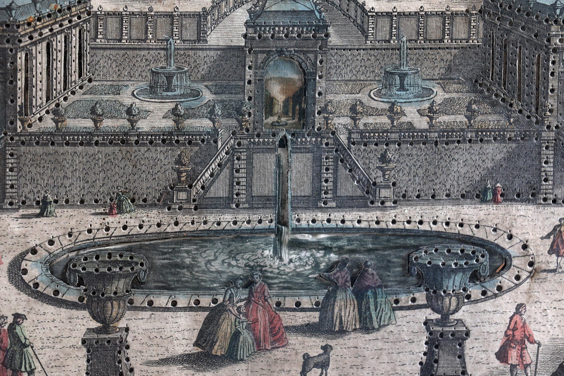 Antiek ingekleurde gravure met verlichting, 28 x 41 cm.