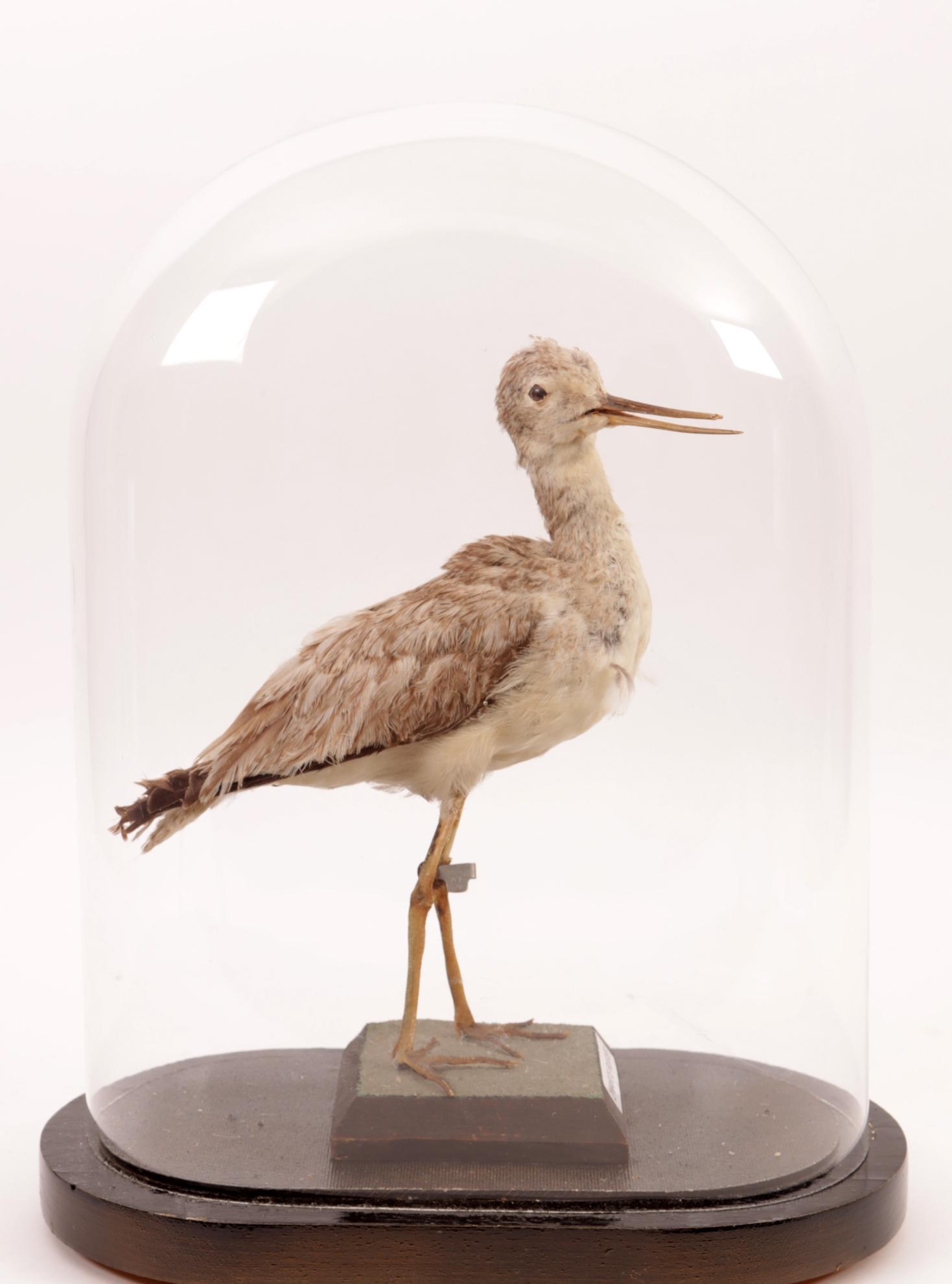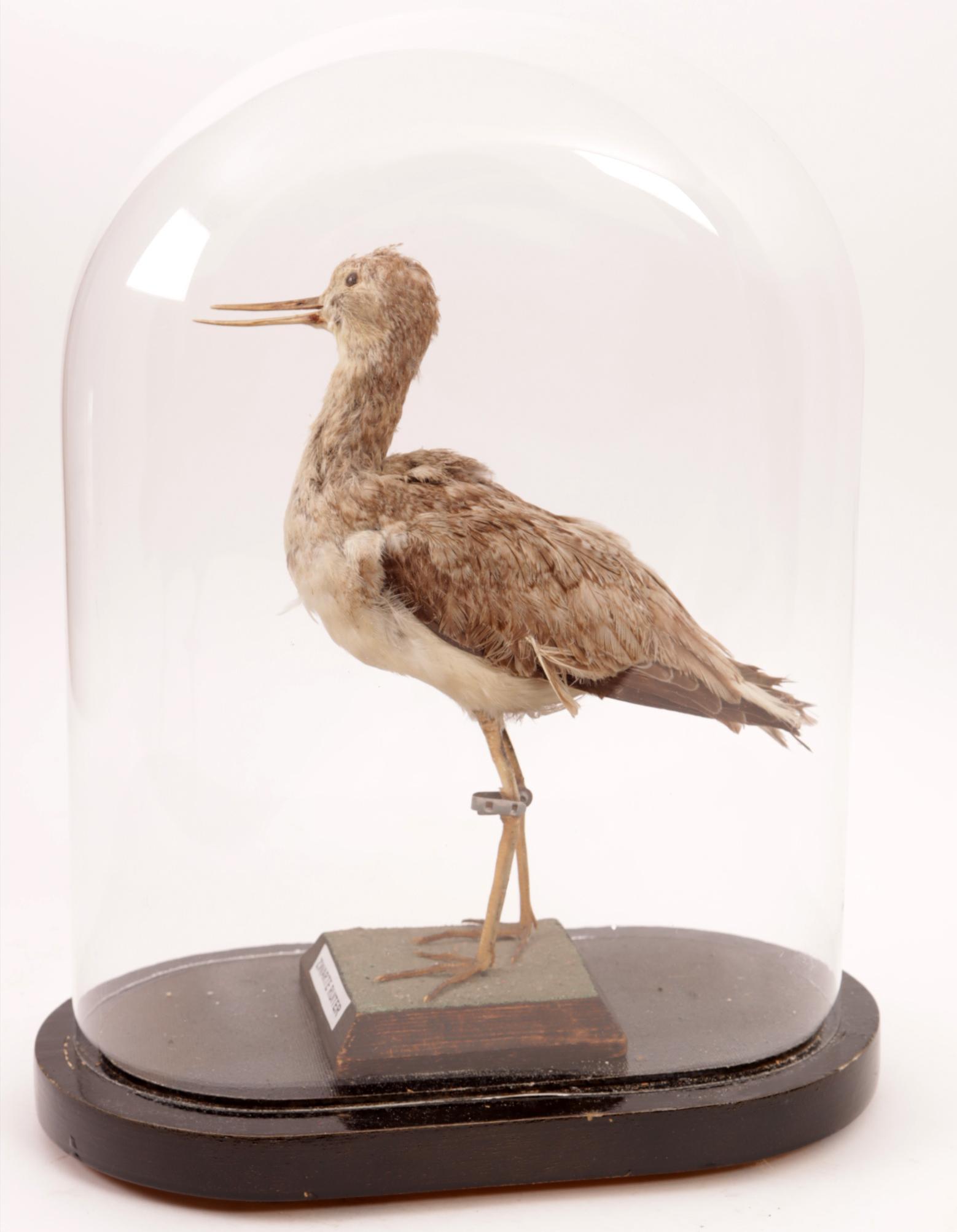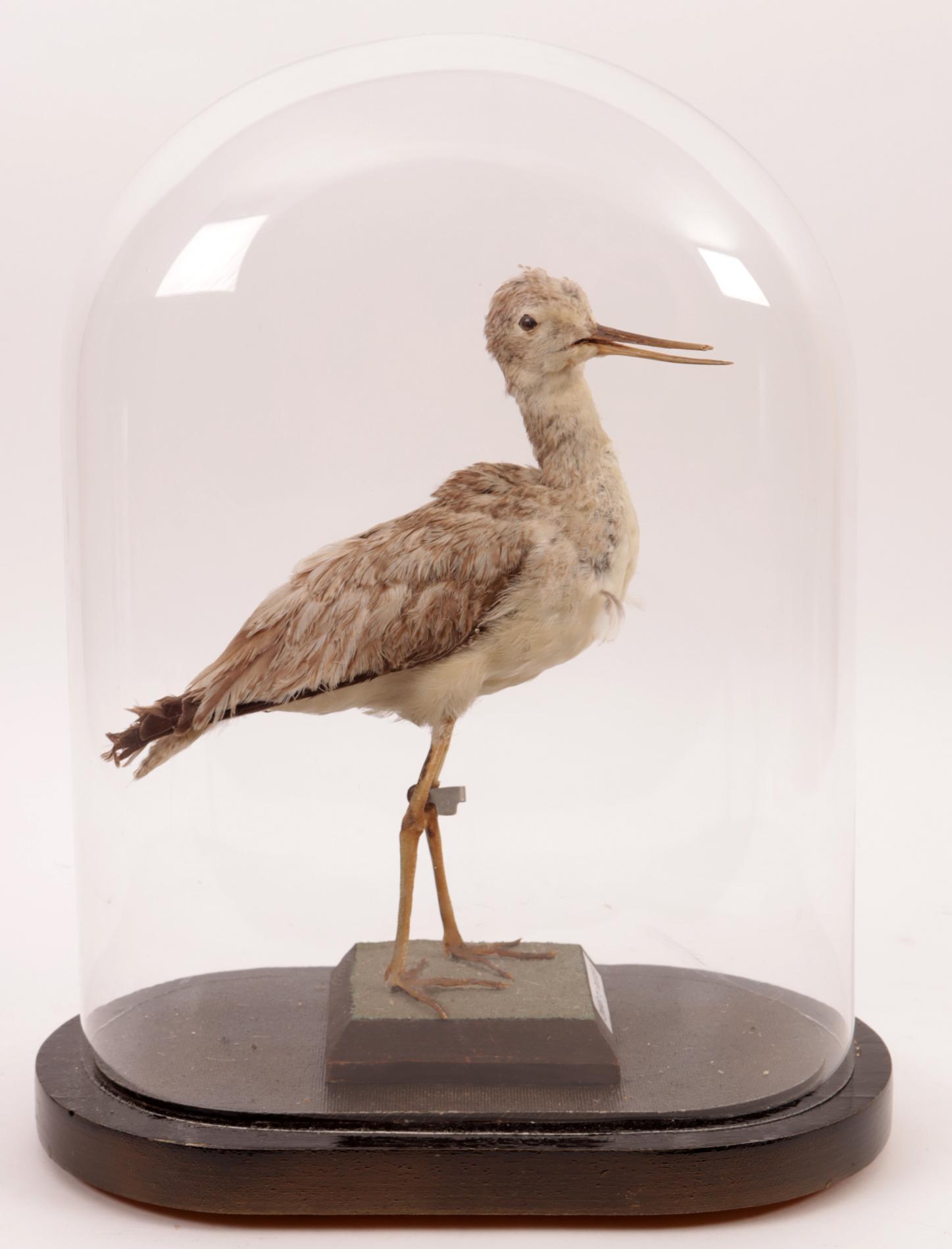 Geprepareerde zwarte ruiter onder stolp, h.38 cm.