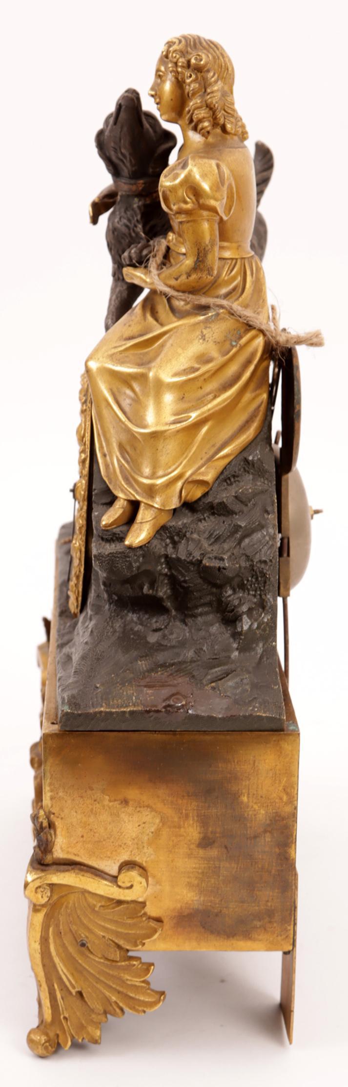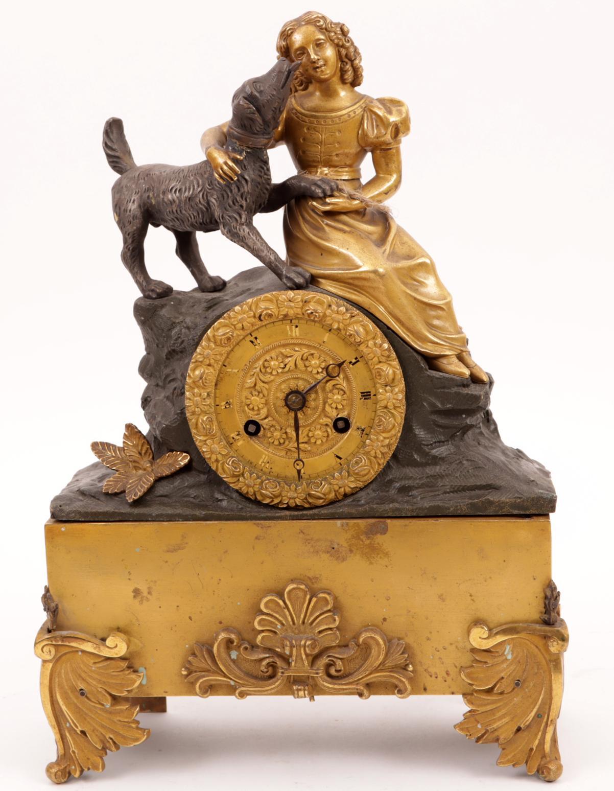 Antieke deels verguld bronzen pendule met voorstelling van een meisje met hond, h.33 cm.